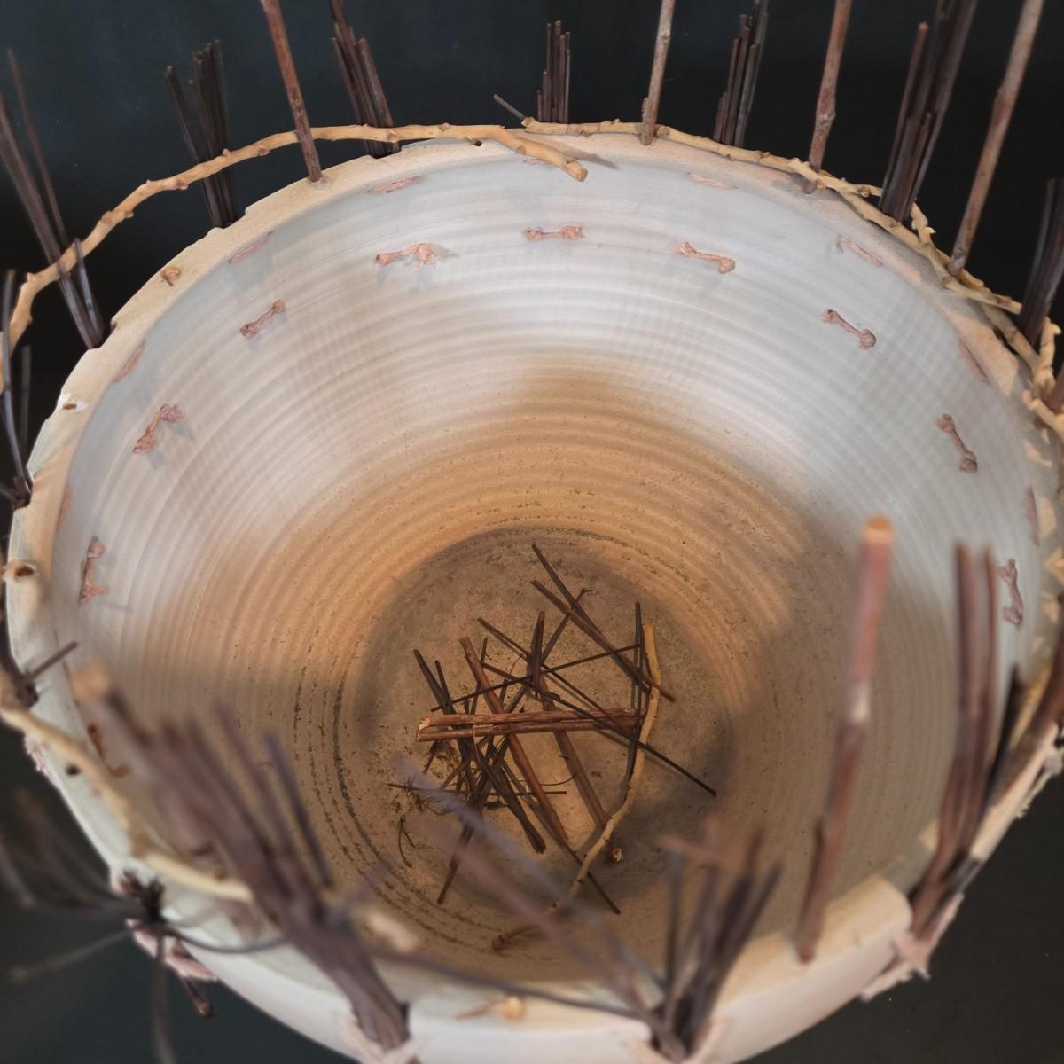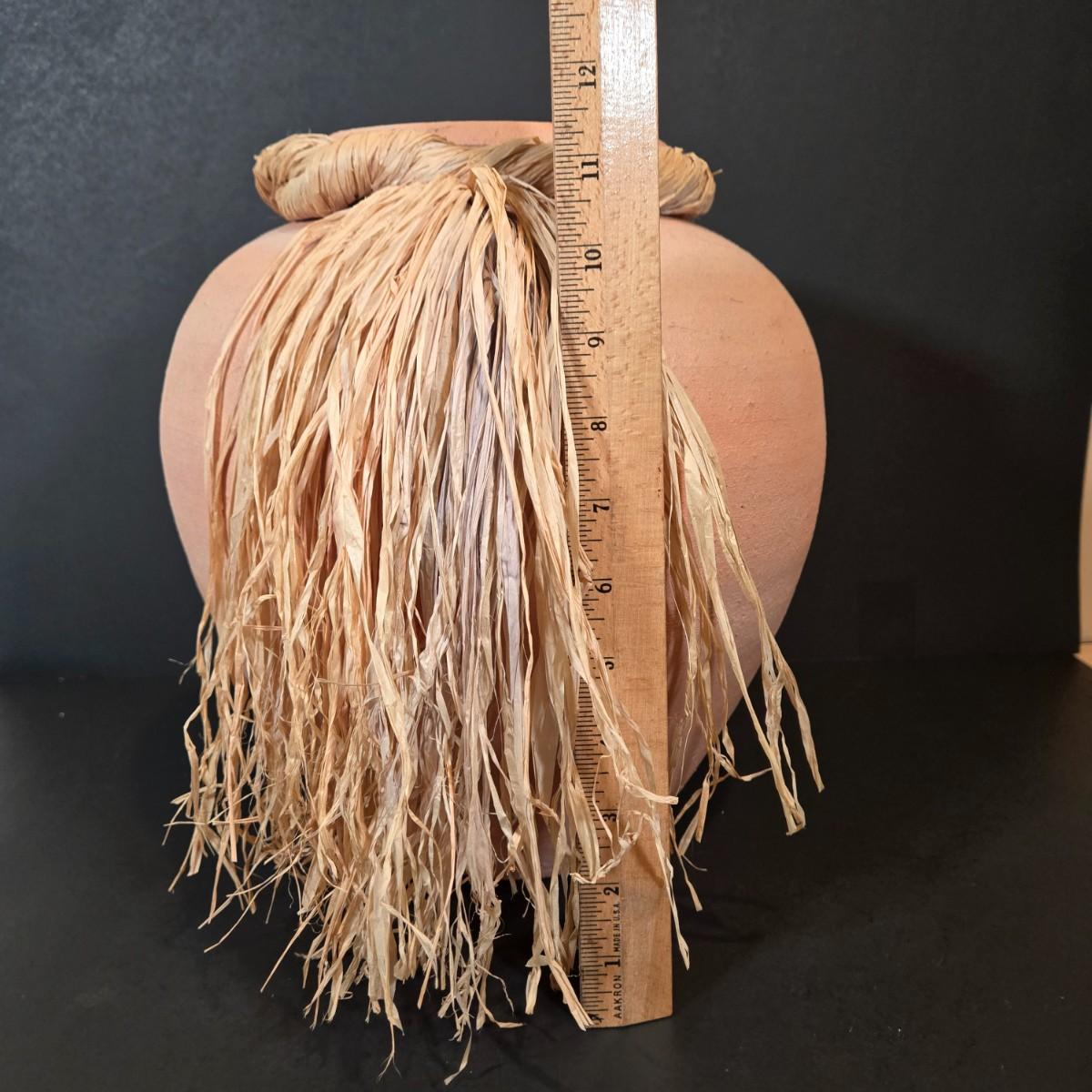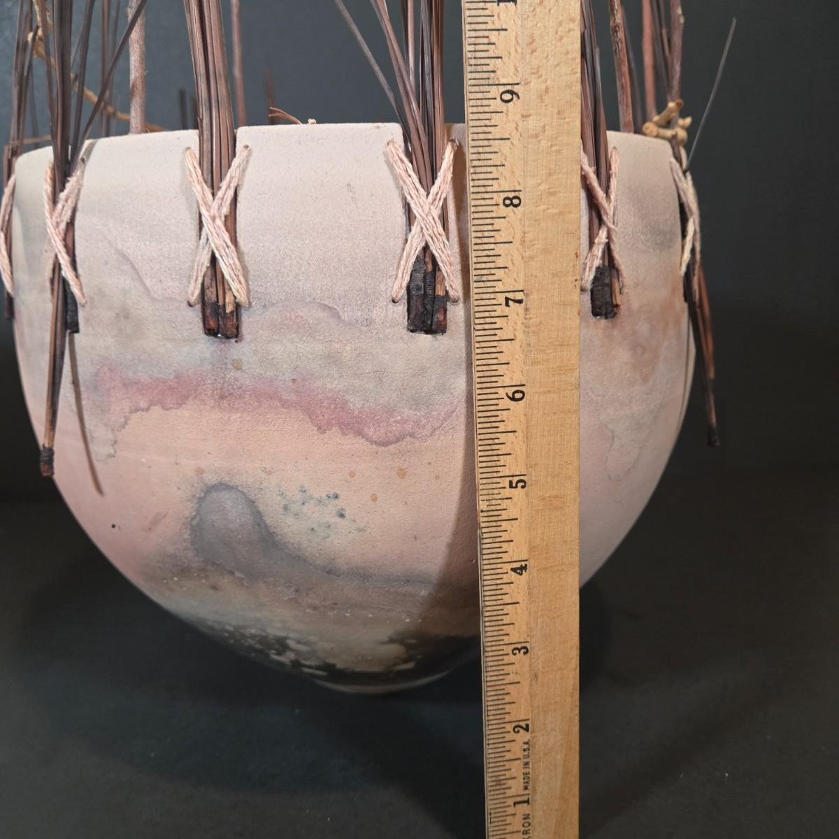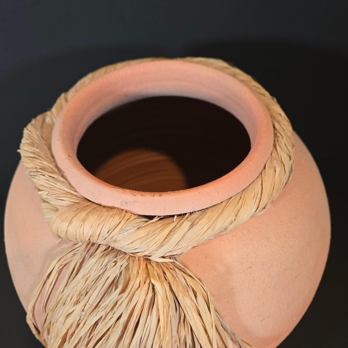 LOT 343B: Vintage Organic Modern Fiber and Clay Vessel by Michael Adcock, Signed and Terracotta Jar with Decorative Raffia Fringe