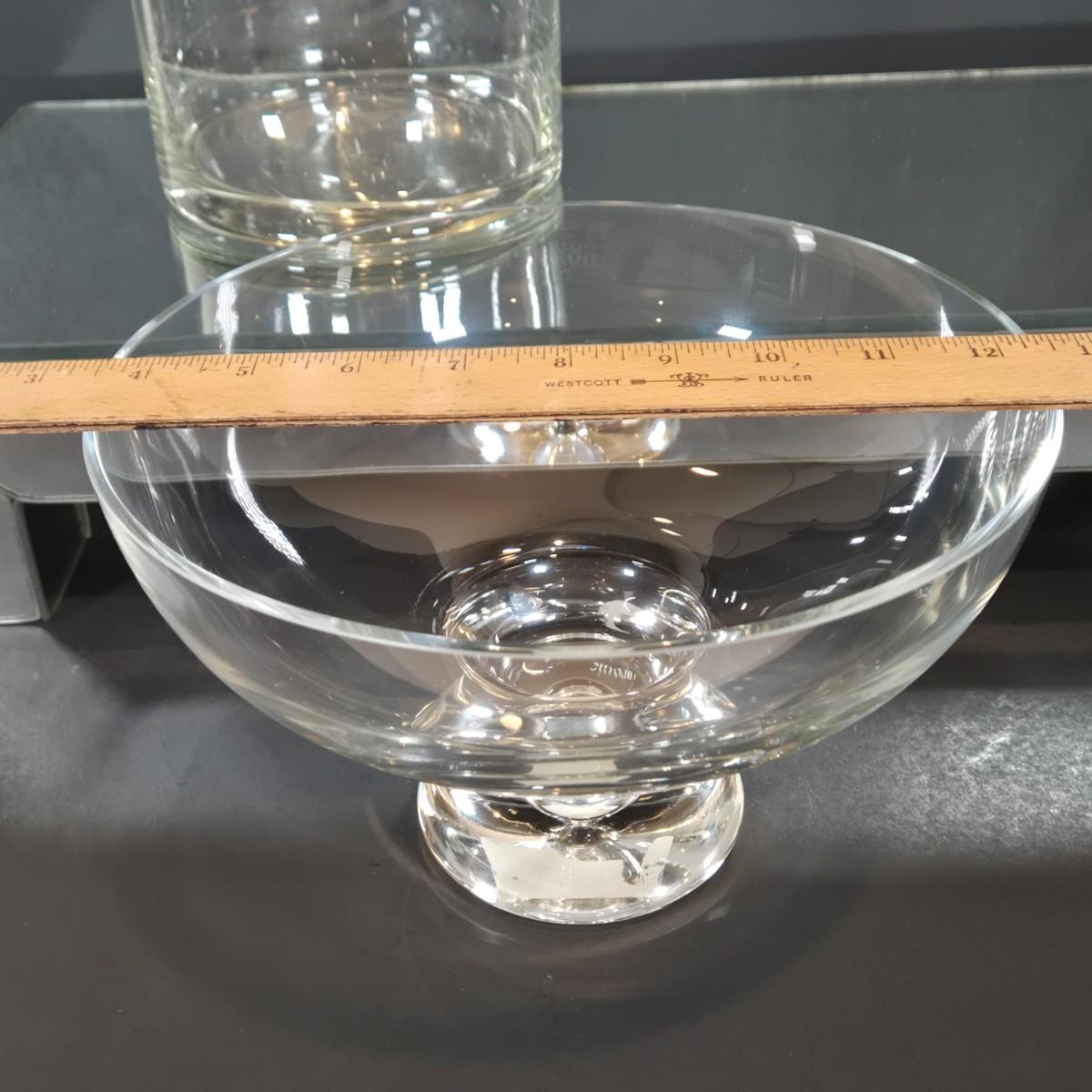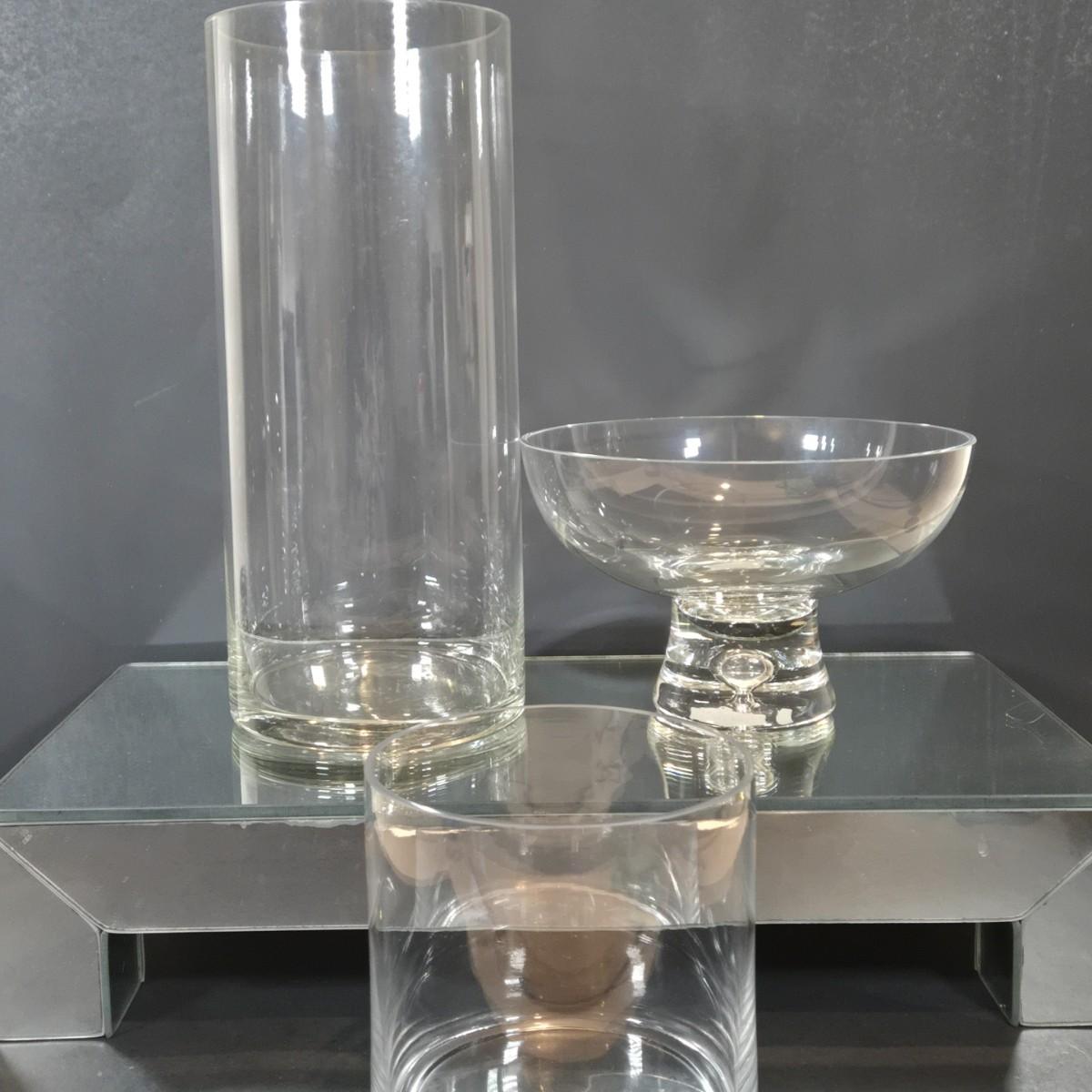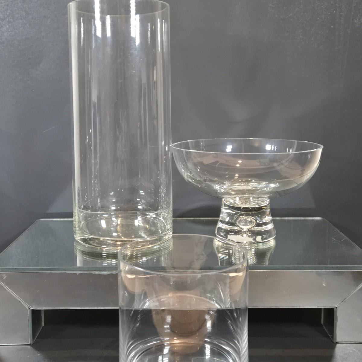 LOT 346B: Block Crystal Pedestal Bowl, Tall Glass Cylinder Vase, Smaller Glass Cylinder Bowl, and Mirror Display Shelf