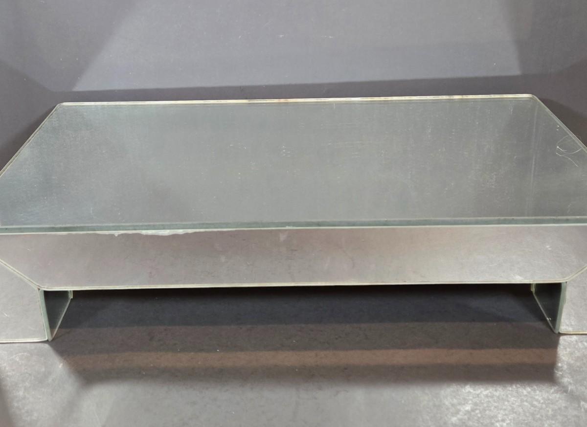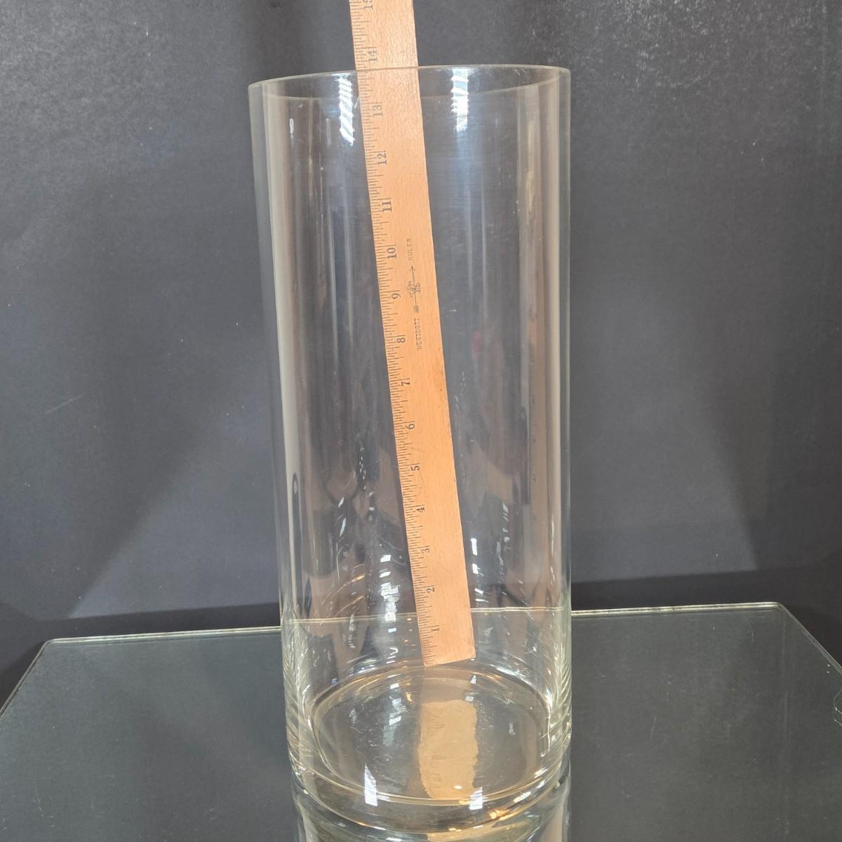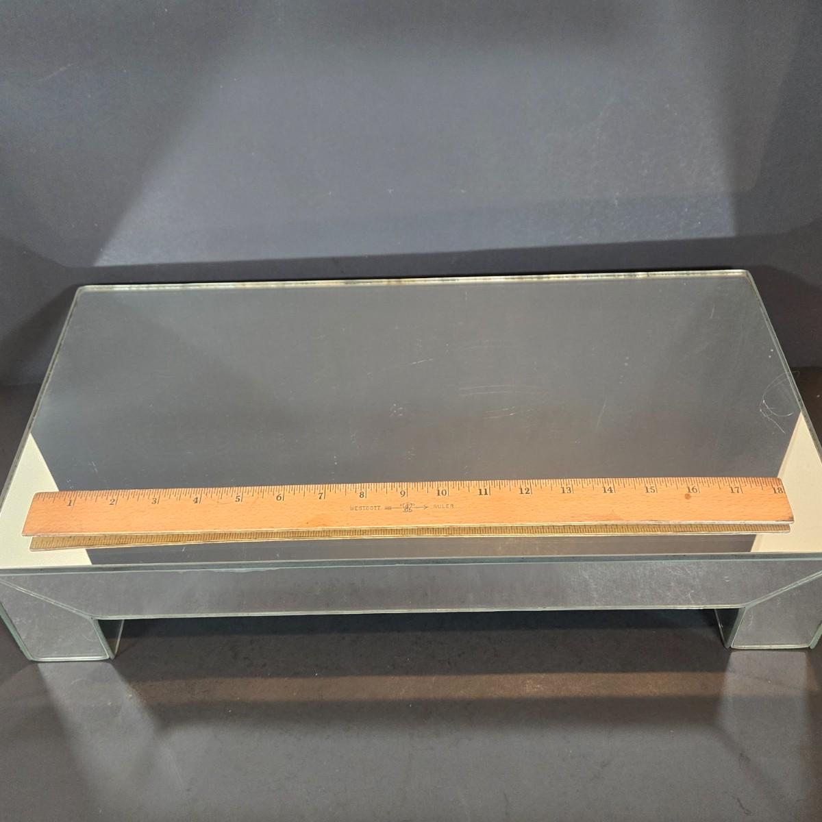LOT 346B: Block Crystal Pedestal Bowl, Tall Glass Cylinder Vase, Smaller Glass Cylinder Bowl, and Mirror Display Shelf