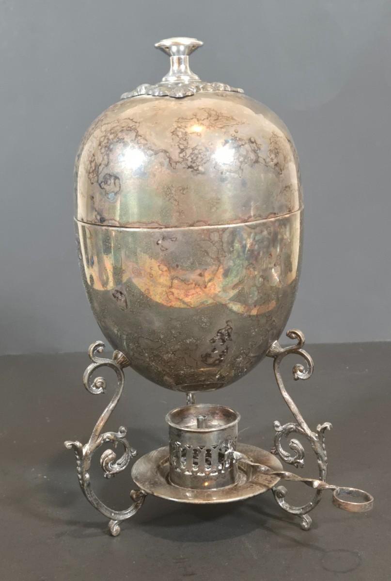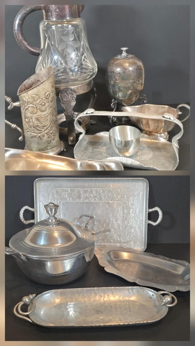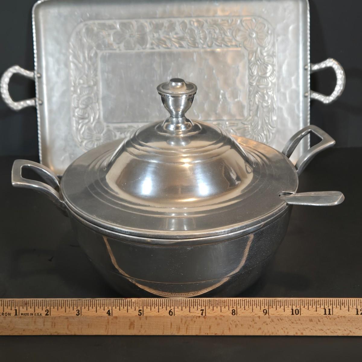 LOT 347B: Multiple Pieces of Pewter. Antique Silver Plate Egg Coddler, Vintage Soup Tureen, and More