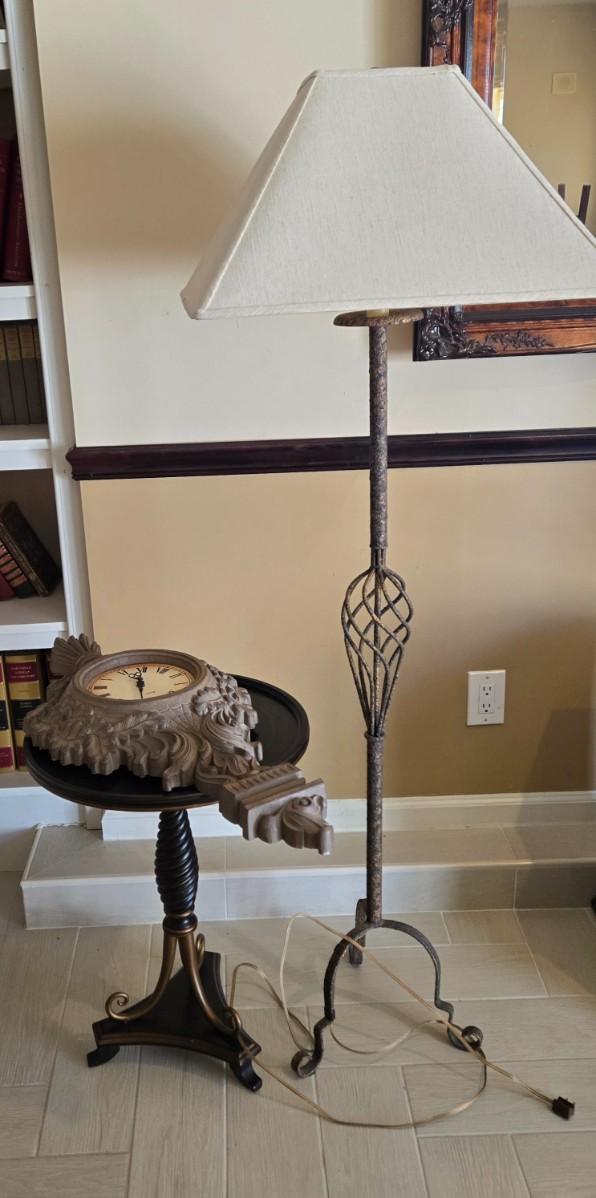 LOT 449B: Floor Lamp, Wall Clock, and Bombay Company Round Side Table