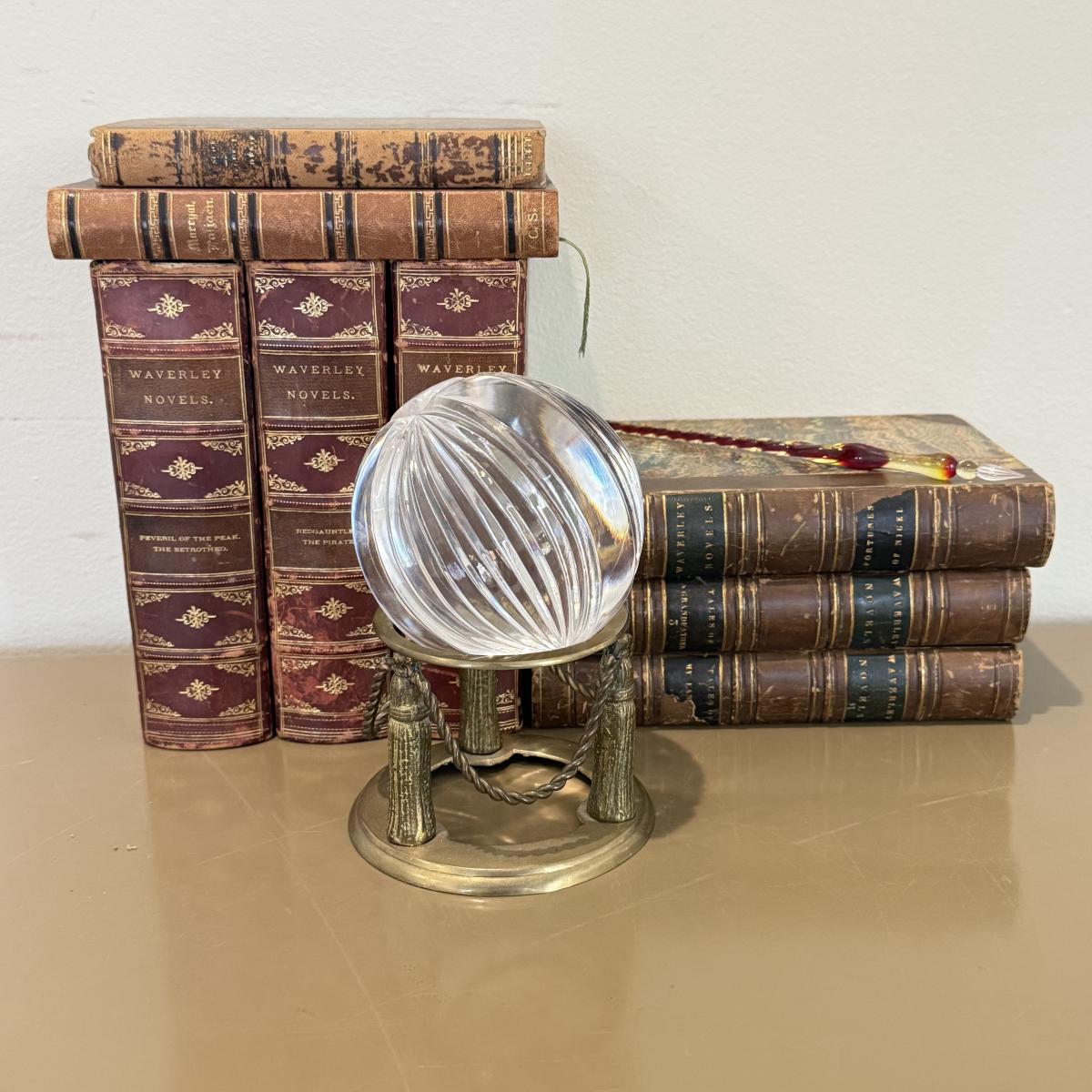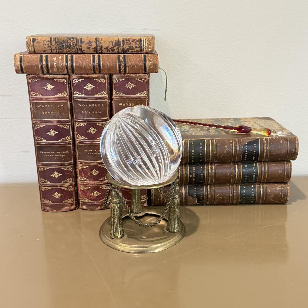 LOT 465F: Crystal Orb w/ Brass Stand, Glass Quill & Antique Books