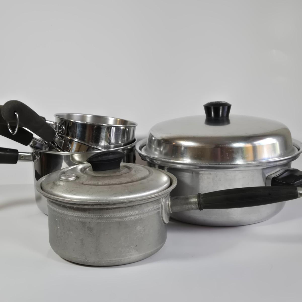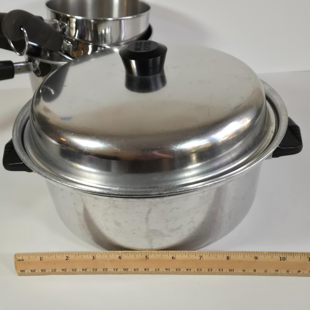 LOT 37K: Vintage Laurel Saucepan, Wear Ever Stock Pot, and Multiple Revere Ware Pots