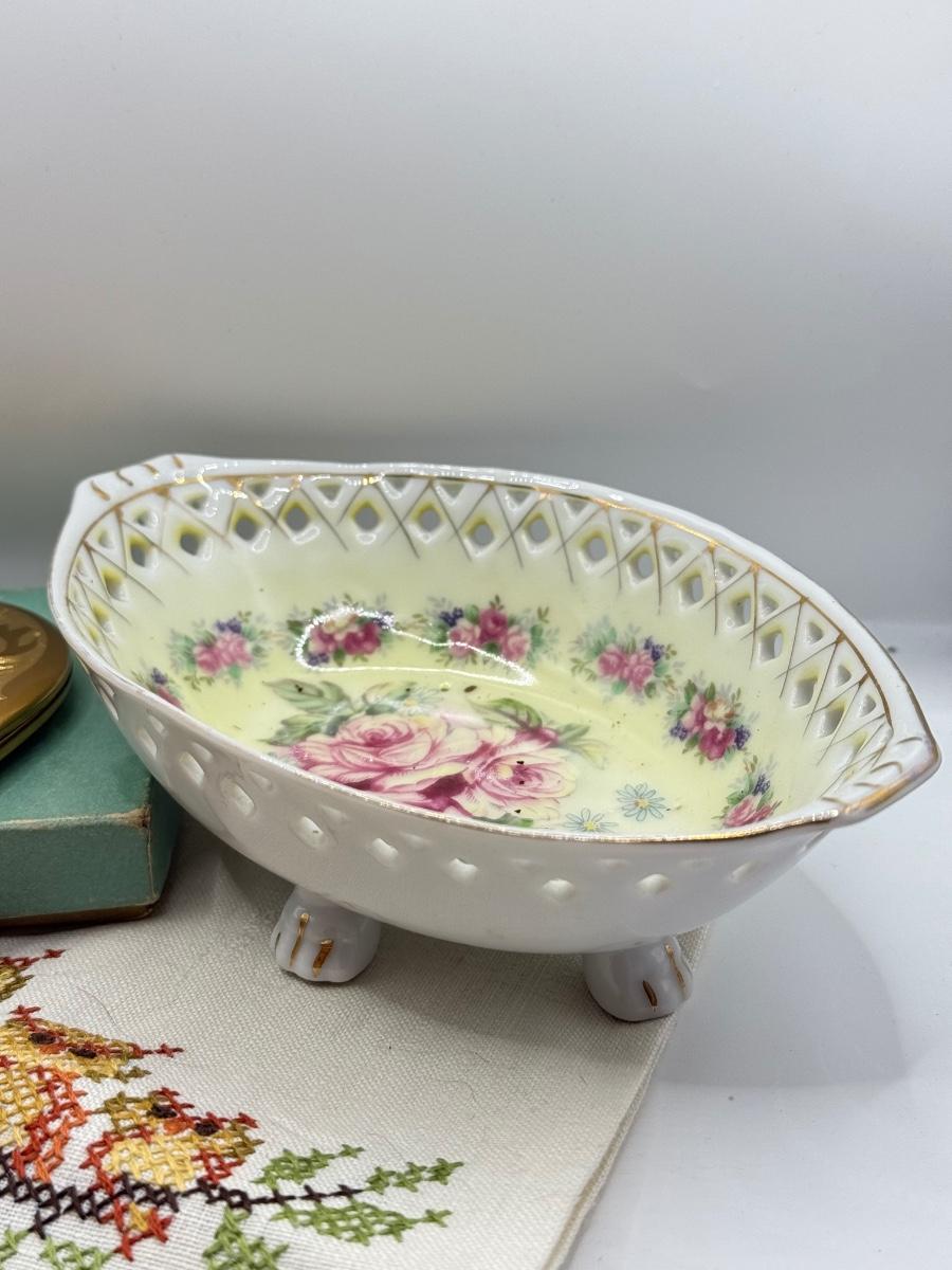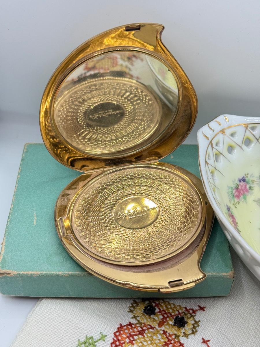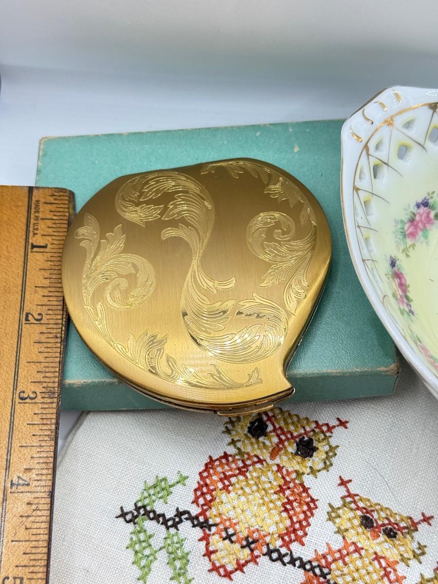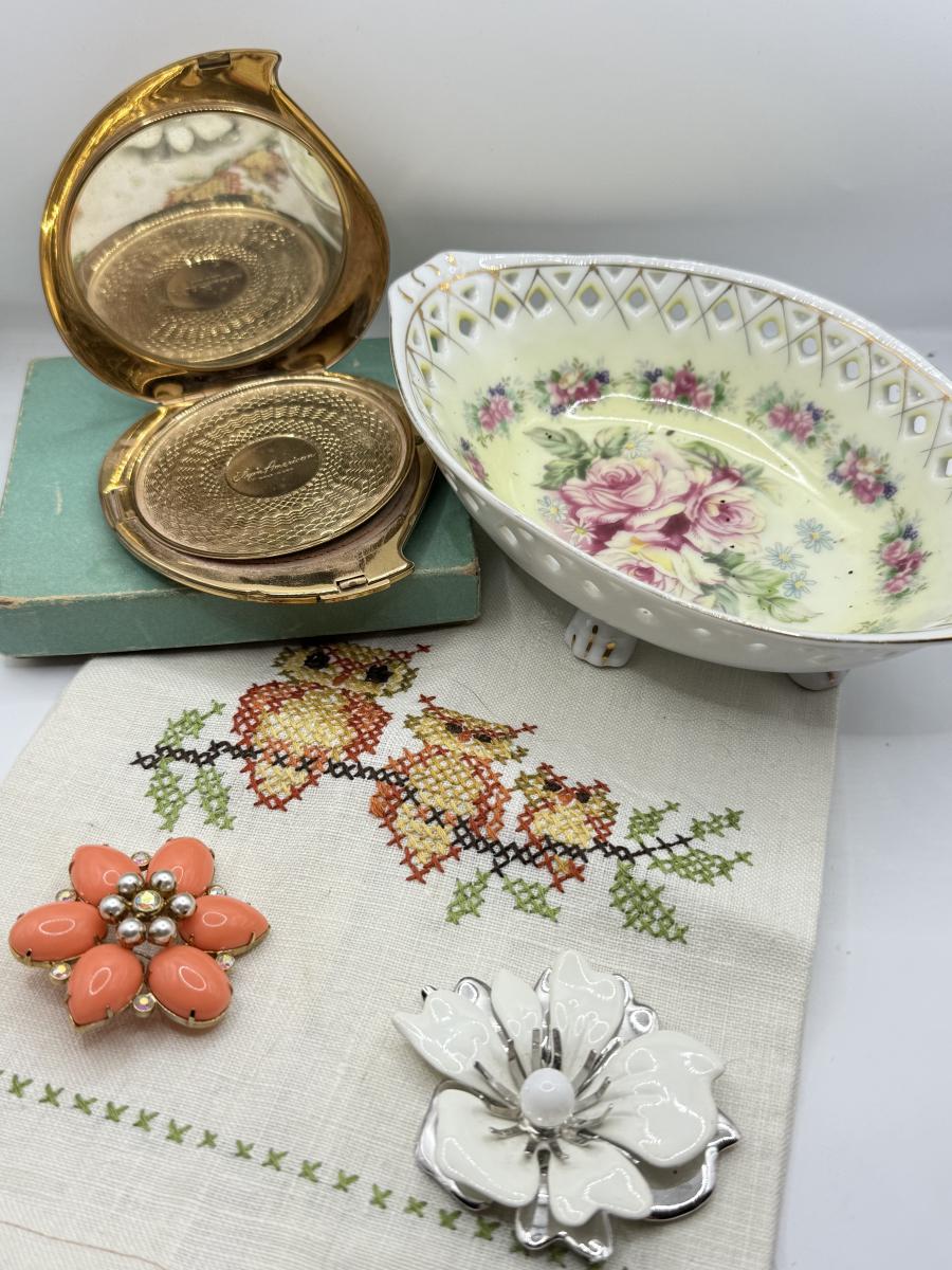 LOT 56K: Vintage Elgin America Compact, Pierced Japanese Porcelain Dish, Brooches & Owl Cross Stitch