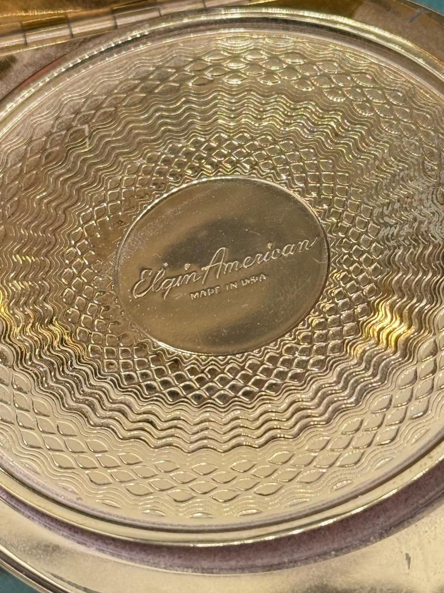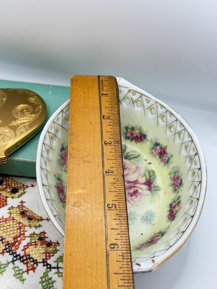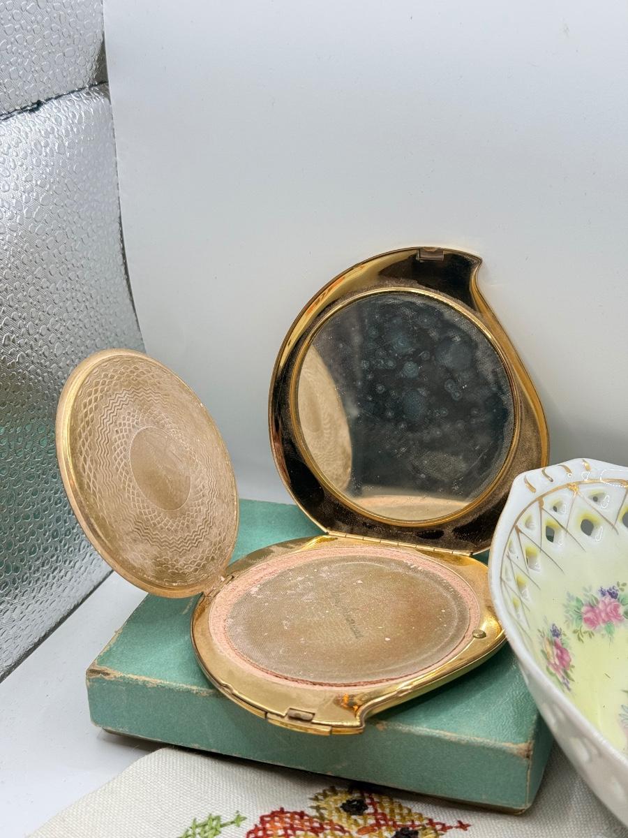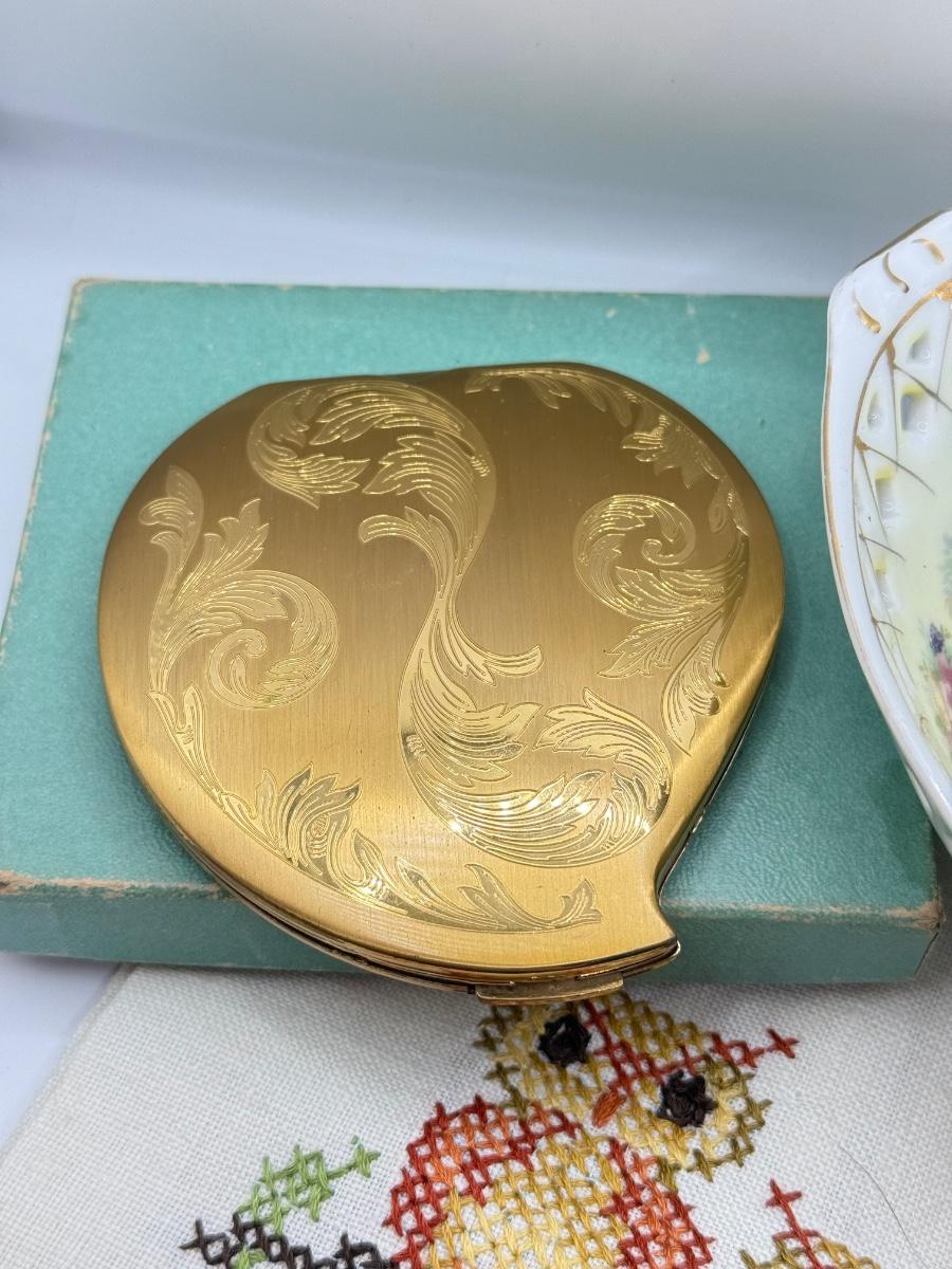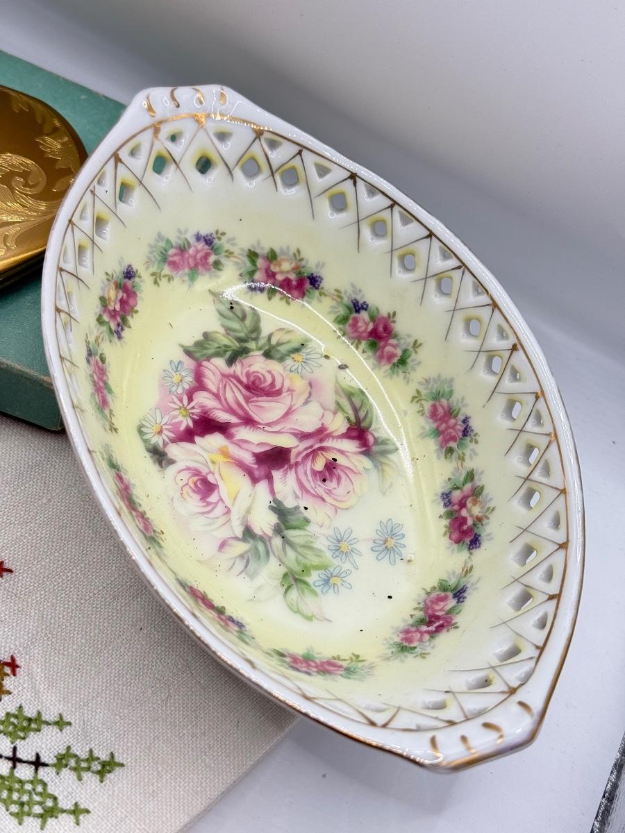 LOT 56K: Vintage Elgin America Compact, Pierced Japanese Porcelain Dish, Brooches & Owl Cross Stitch