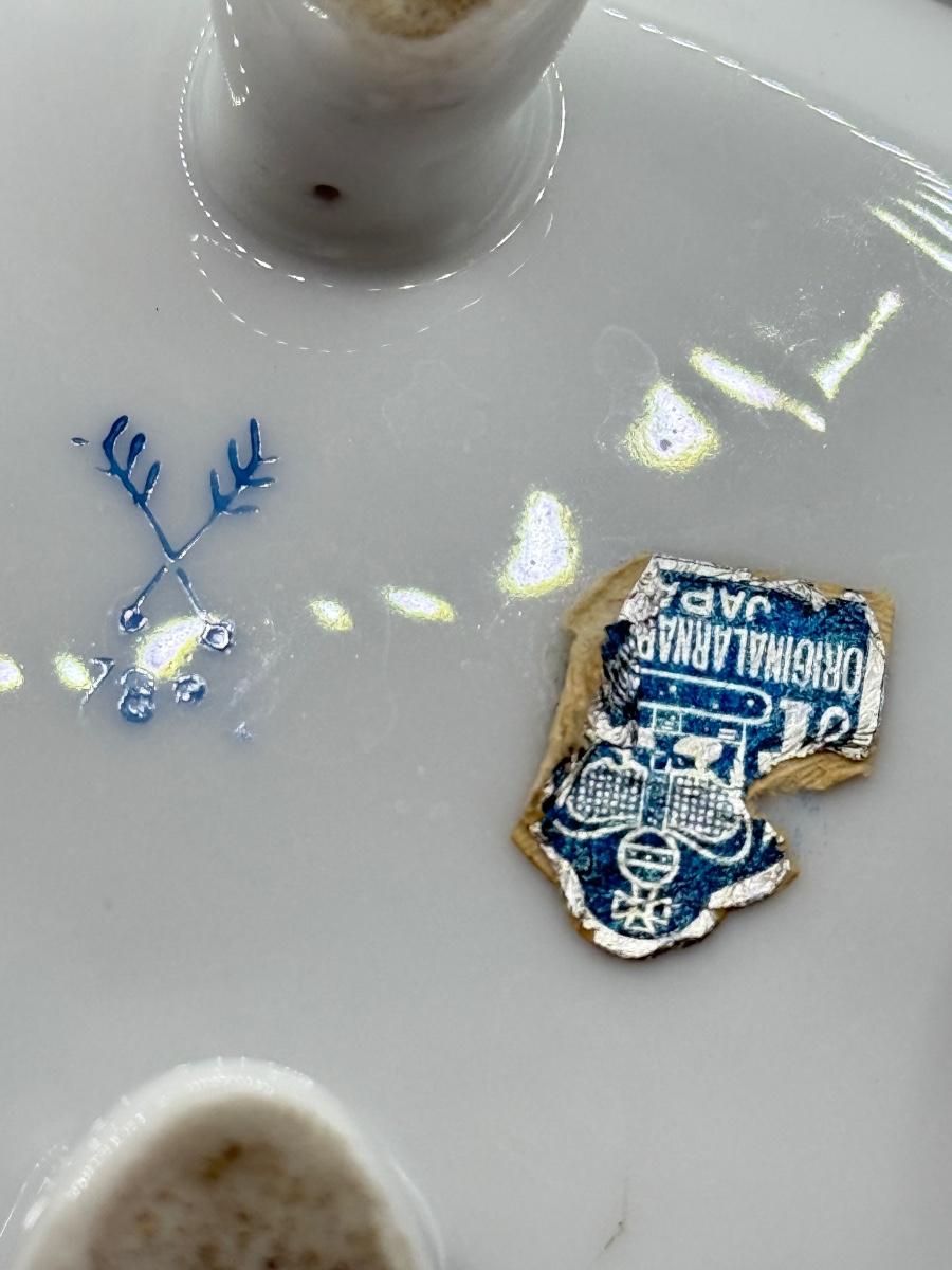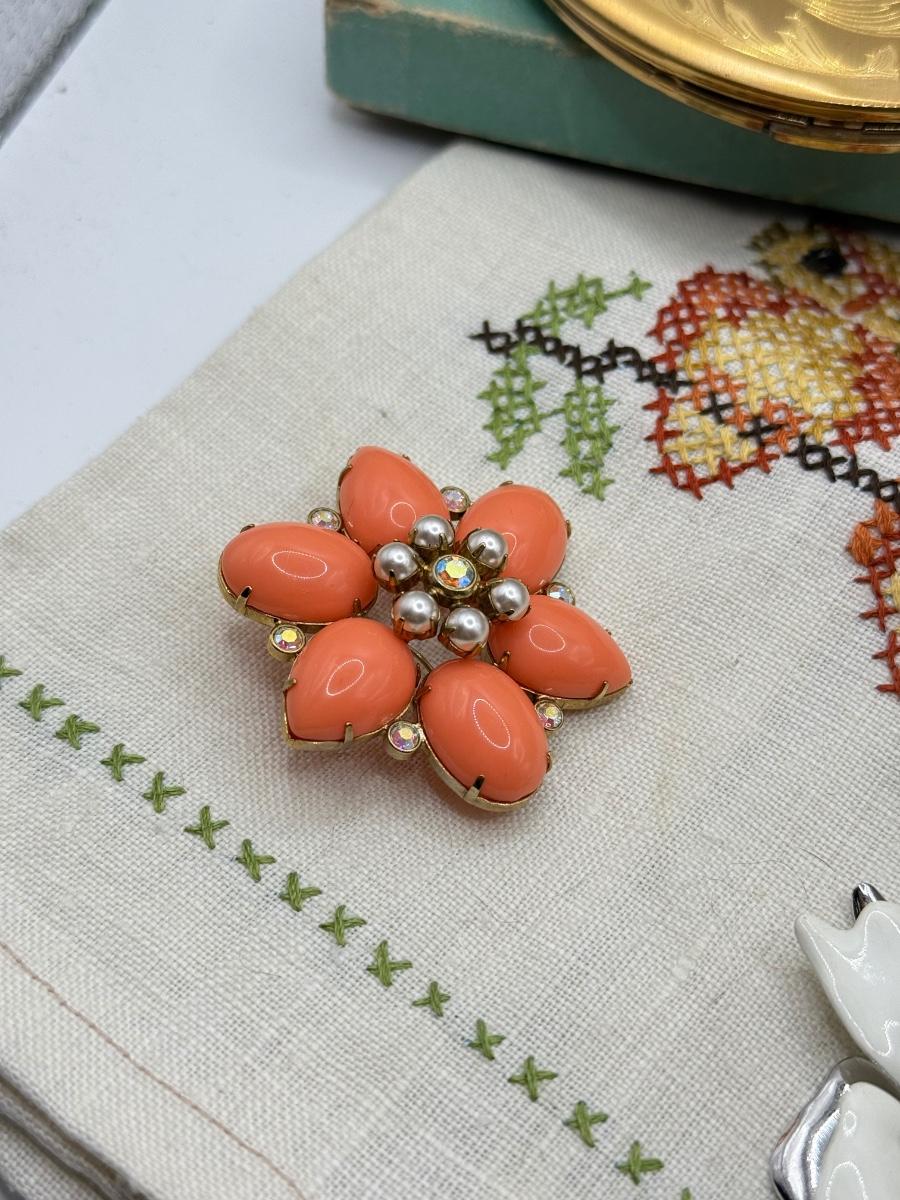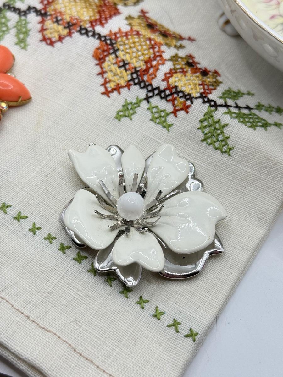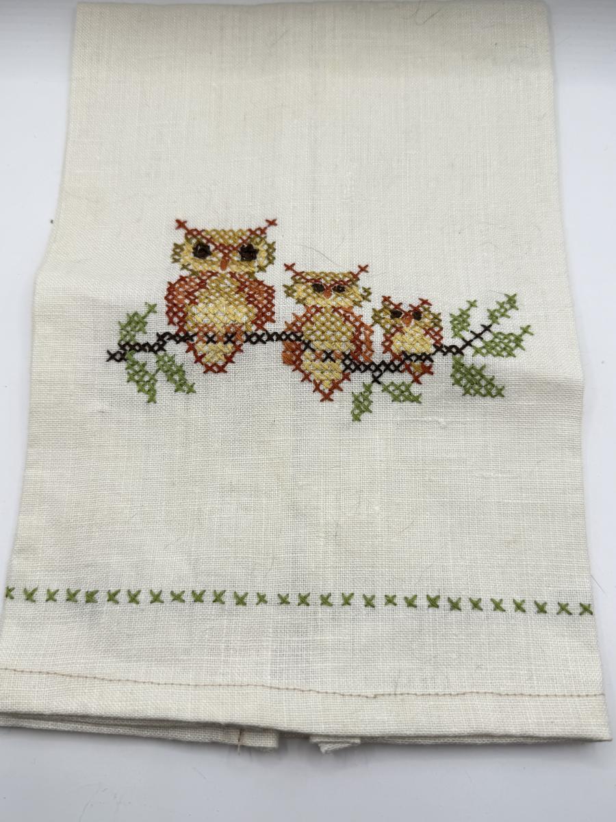 LOT 56K: Vintage Elgin America Compact, Pierced Japanese Porcelain Dish, Brooches & Owl Cross Stitch