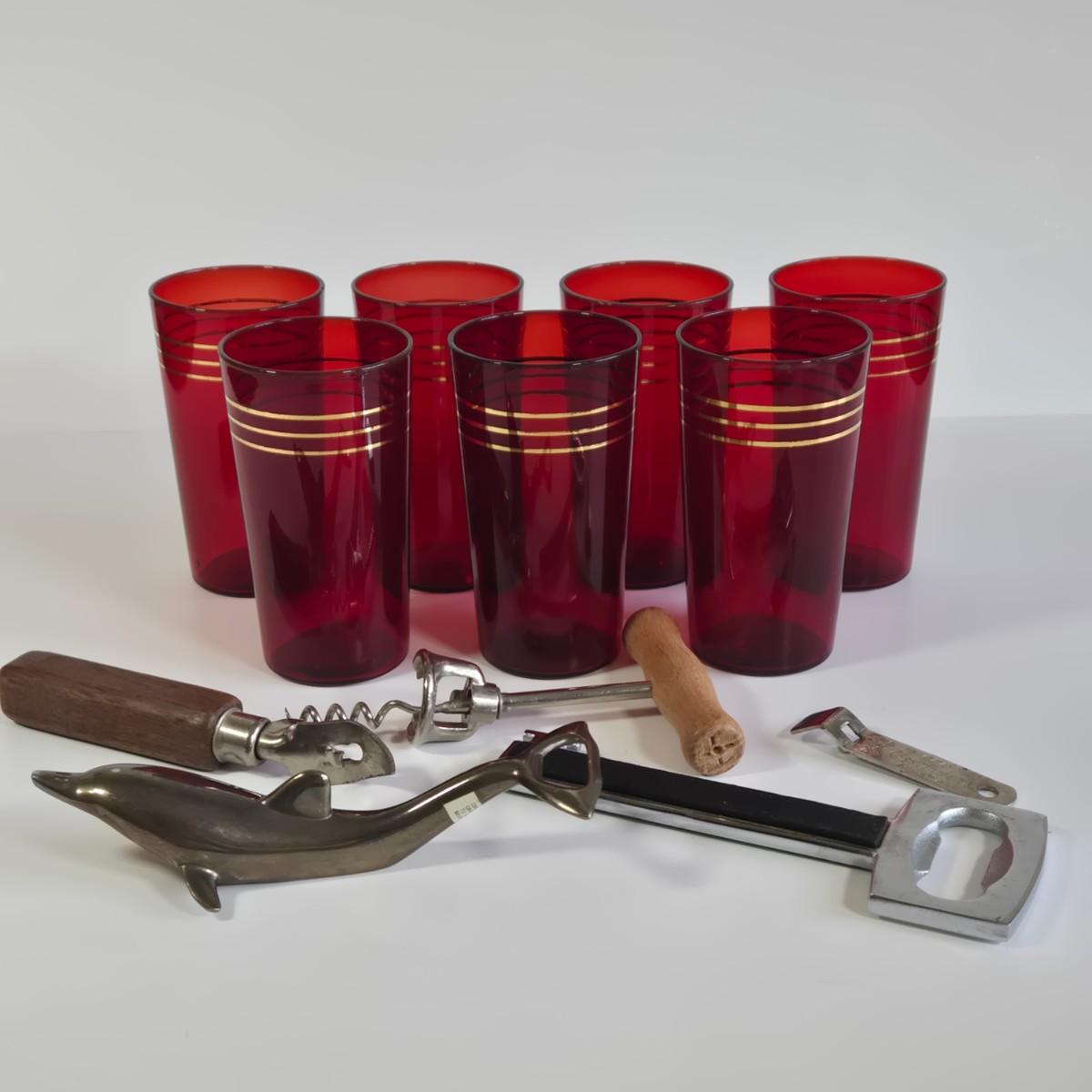 LOT 64K: Vintage Ruby Red Tumblers/Glasses and Multiple Can/ Bottle Openers