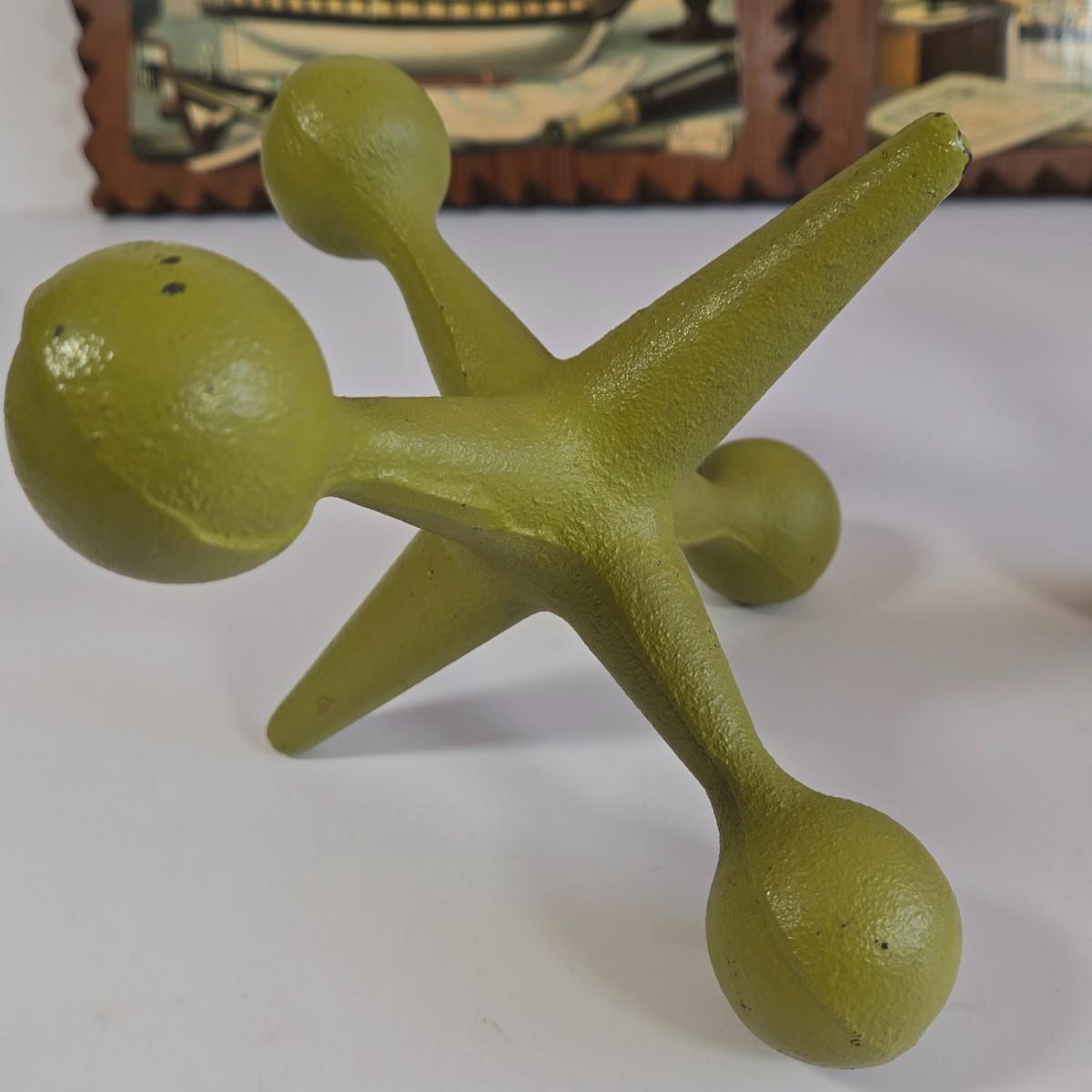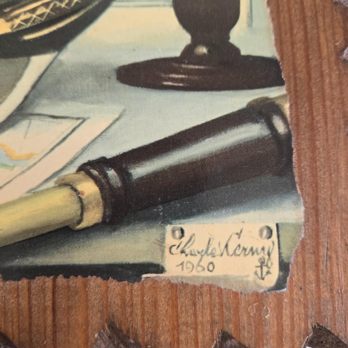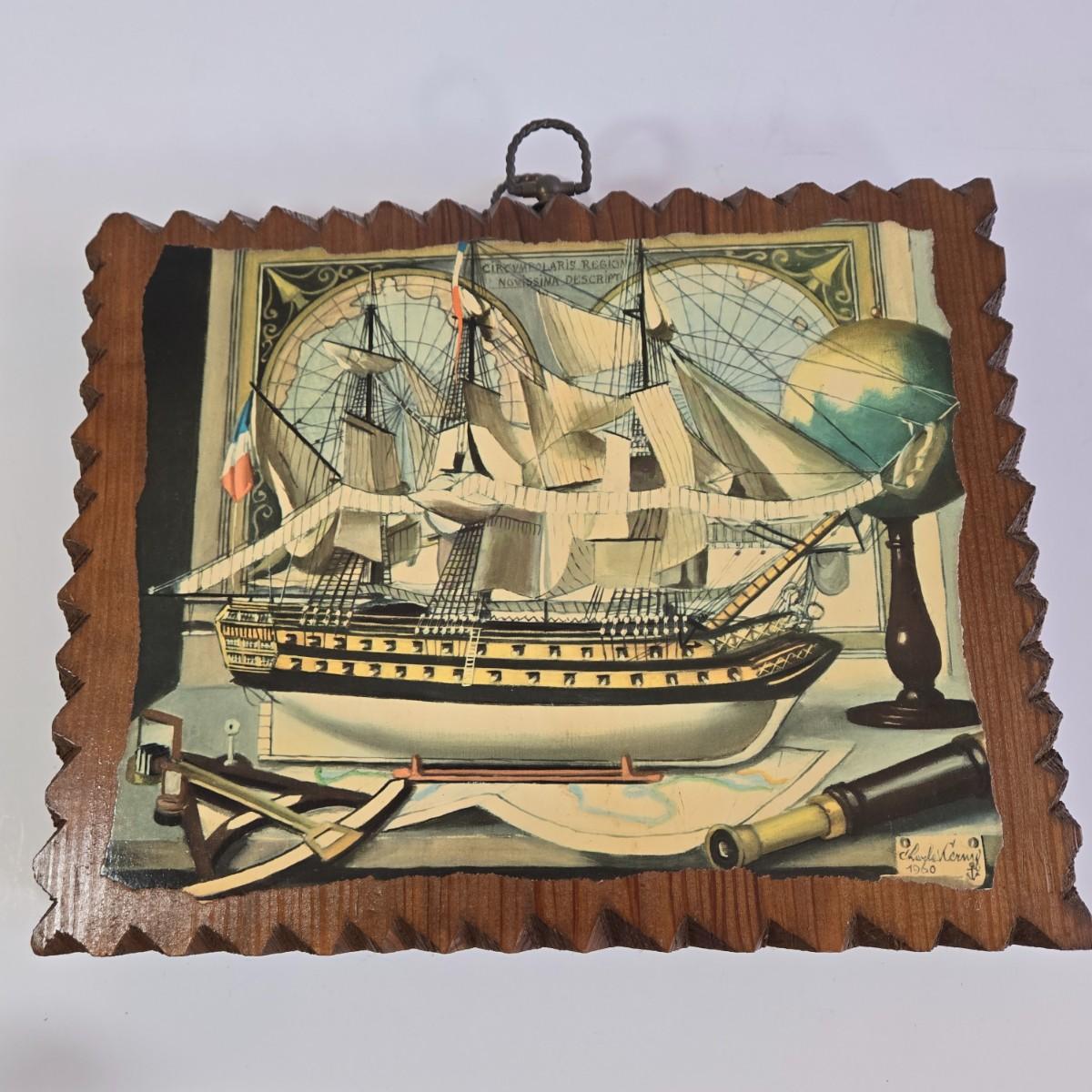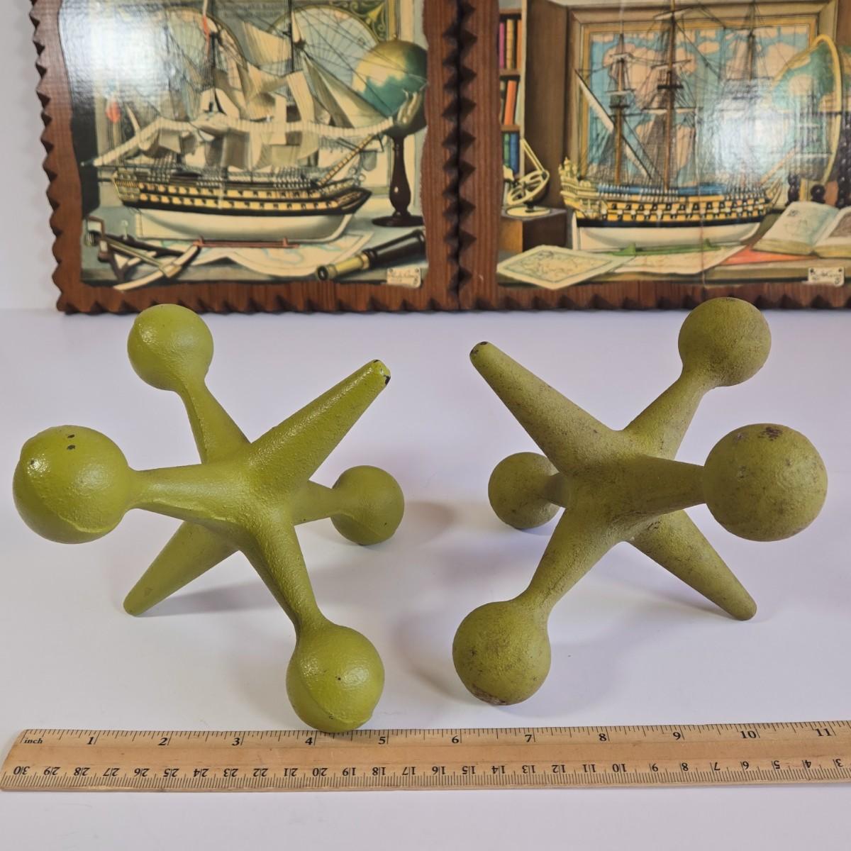 LOT 65L: 2 Charles Cerny Czech Artist 1960s Ship Art Print Wood Plaques, 2 Cast Iron Bookend/Doorsteop Jacks, and 2 Anchor Hocking Glass Canisters