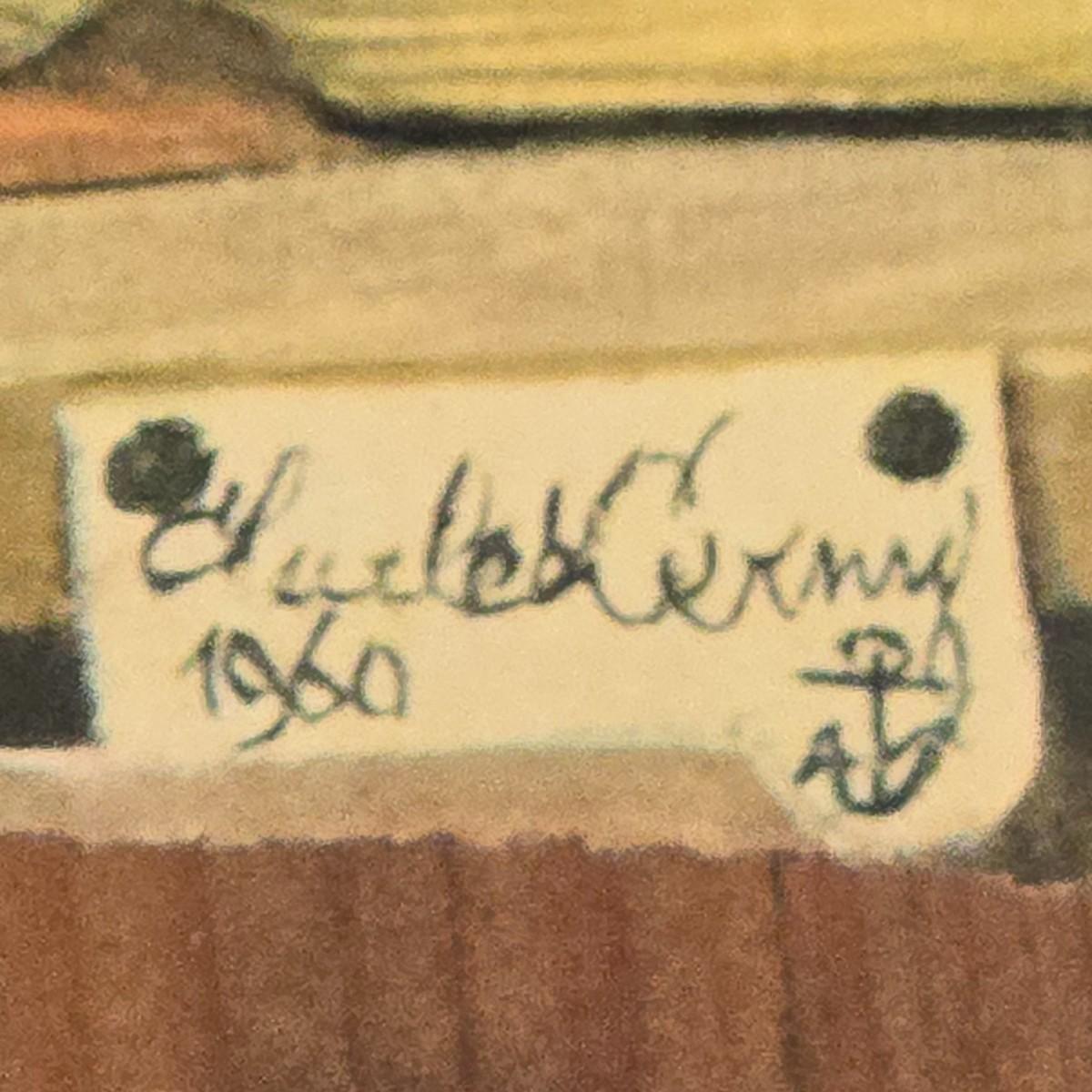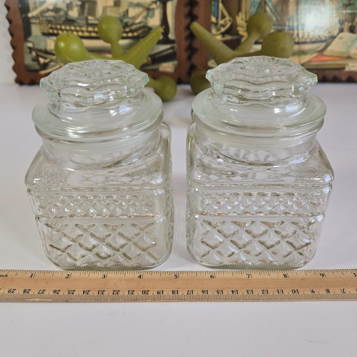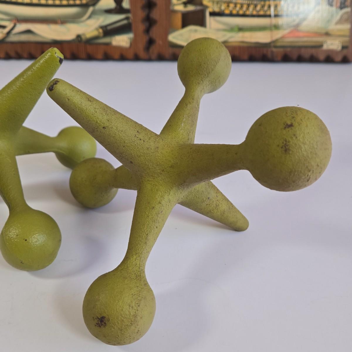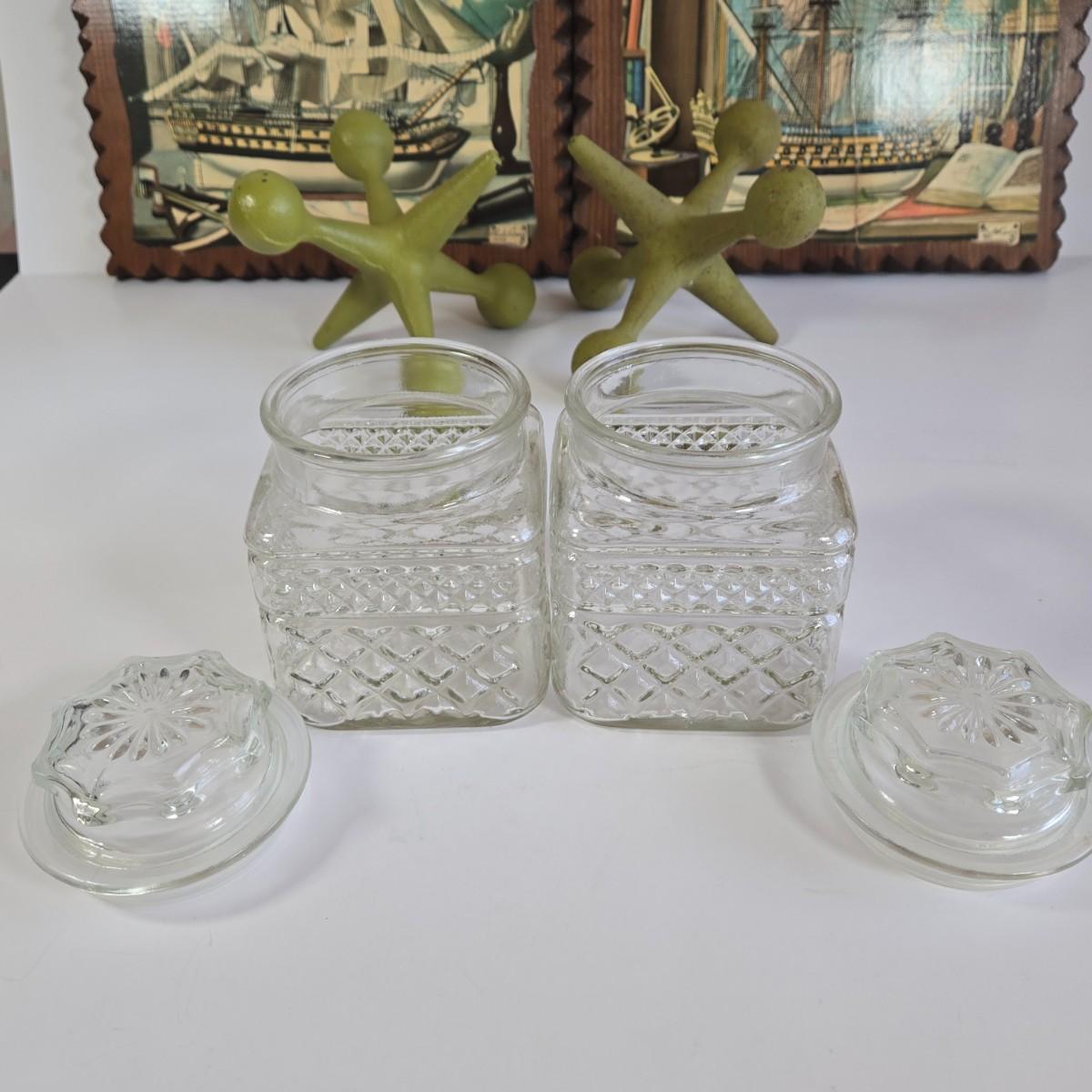 LOT 65L: 2 Charles Cerny Czech Artist 1960s Ship Art Print Wood Plaques, 2 Cast Iron Bookend/Doorsteop Jacks, and 2 Anchor Hocking Glass Canisters