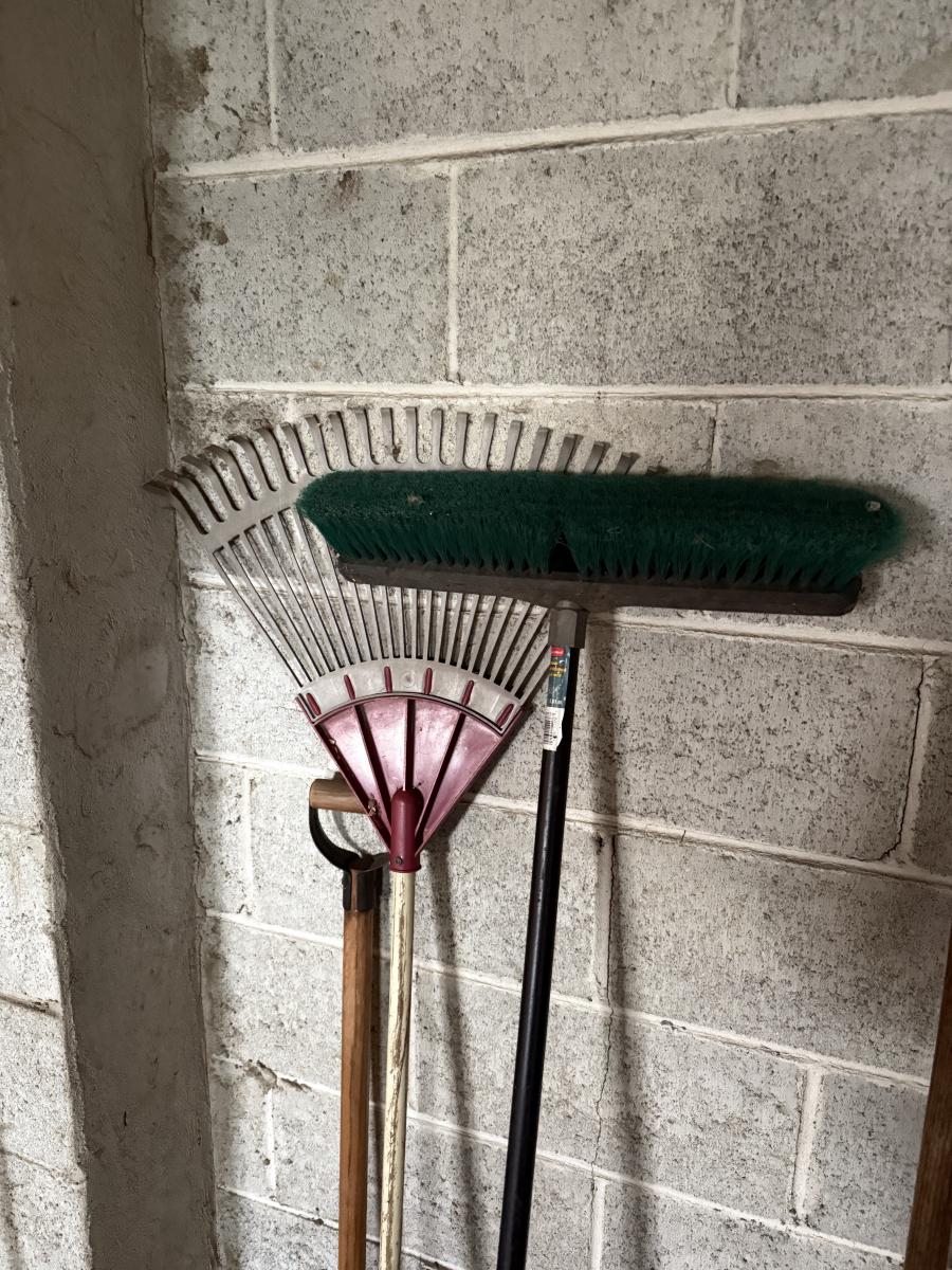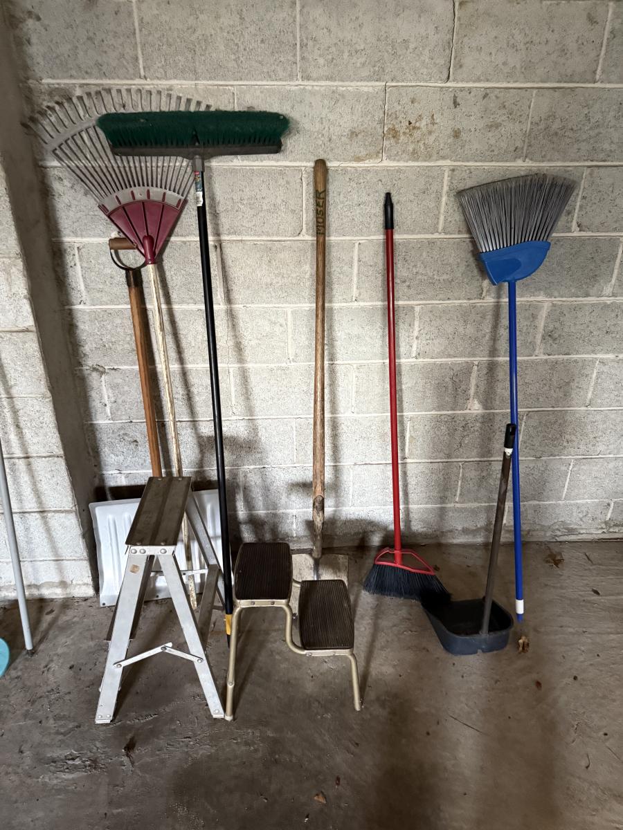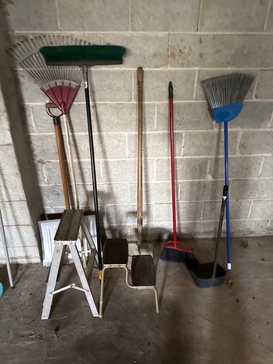 LOT 109G: Rake, Shovels, Brooms & Stools