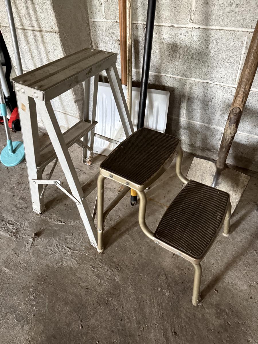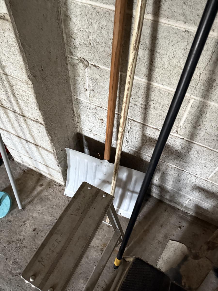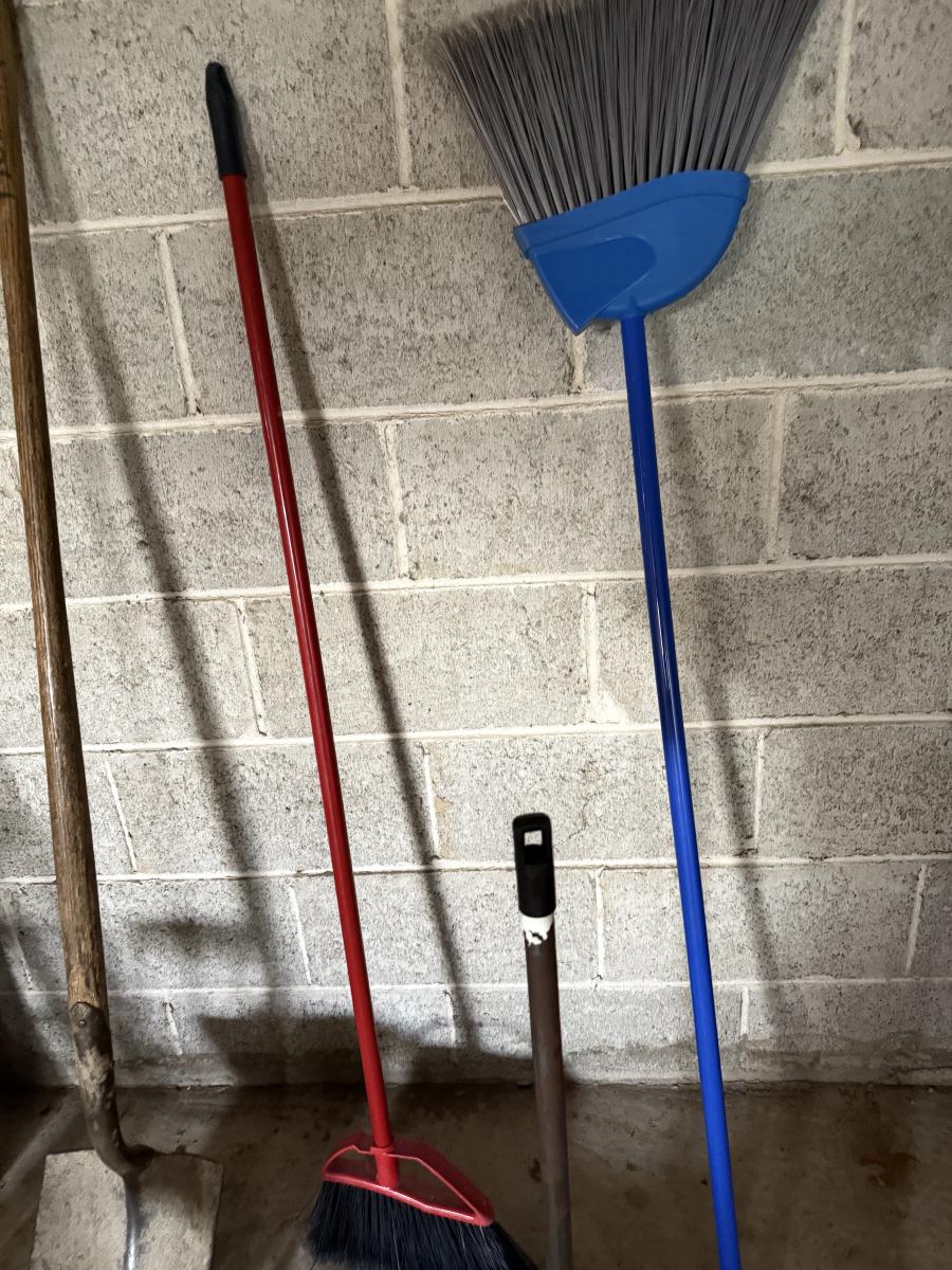 LOT 109G: Rake, Shovels, Brooms & Stools