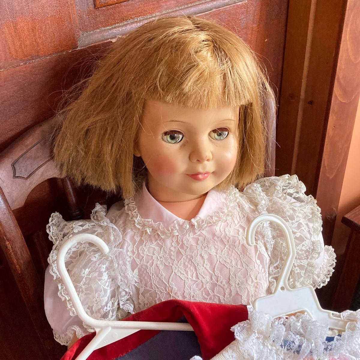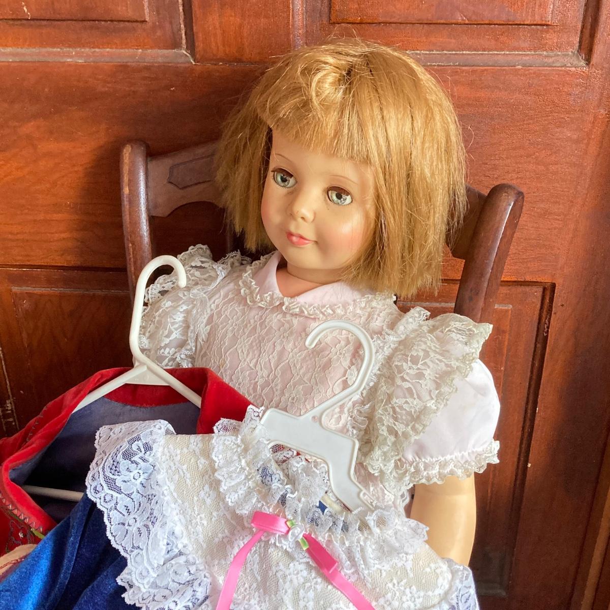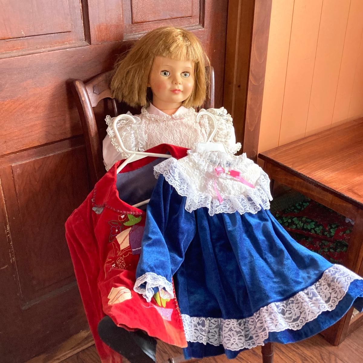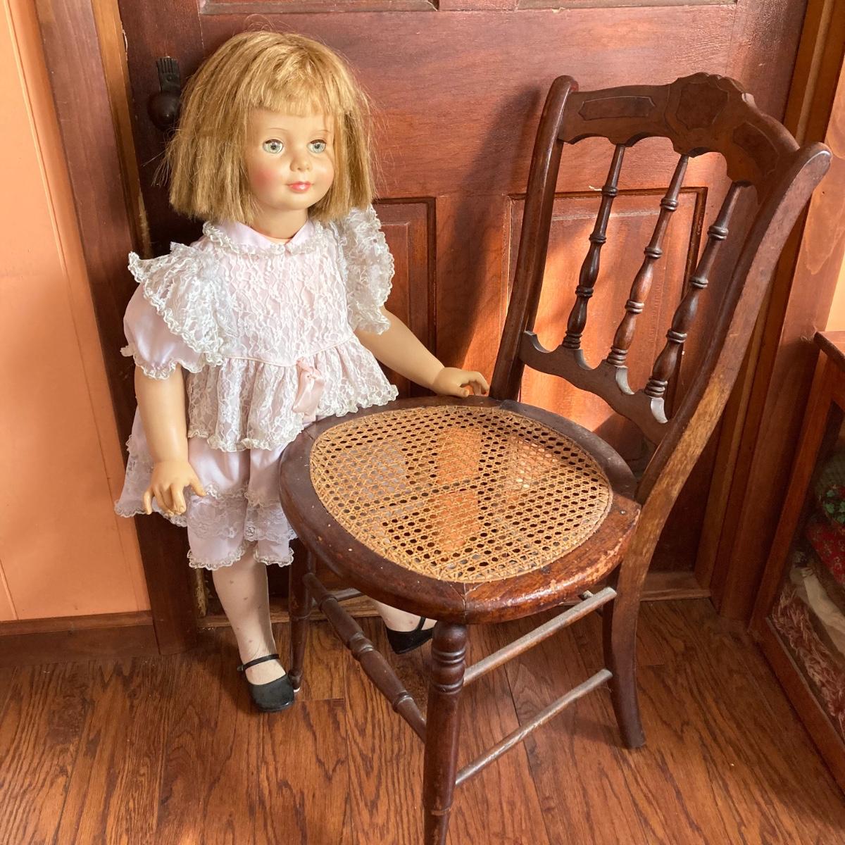 LOT 28: Vintage Collection - Wood / Cane Bottom Chair, Large Doll and Children's Clothing
