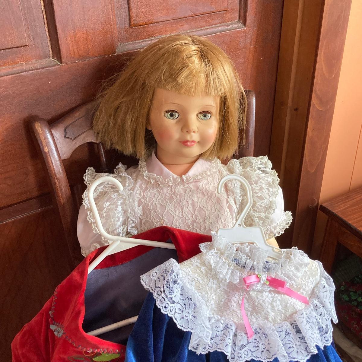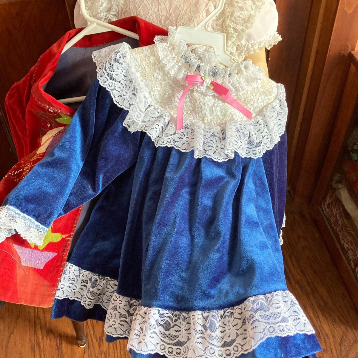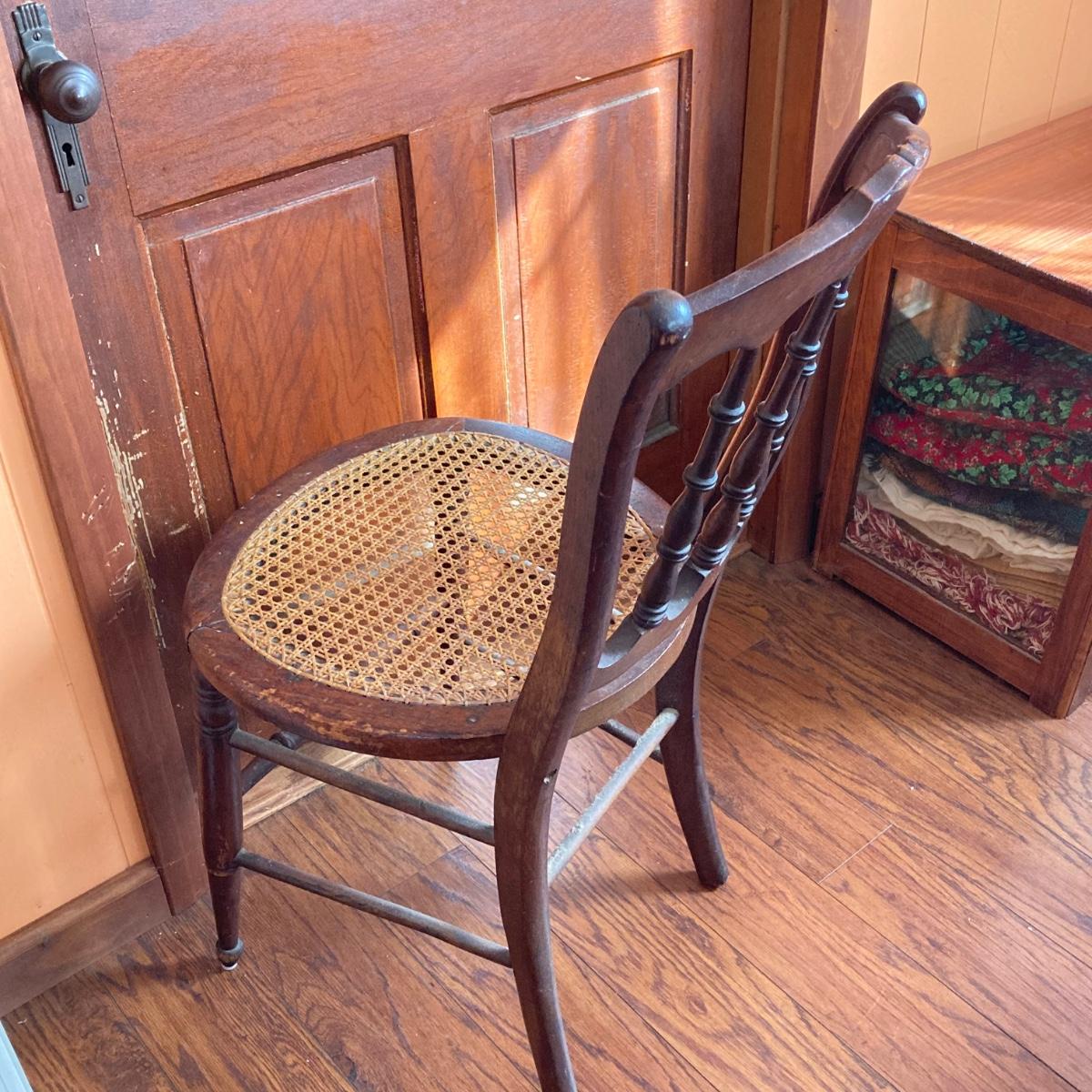 LOT 28: Vintage Collection - Wood / Cane Bottom Chair, Large Doll and Children's Clothing