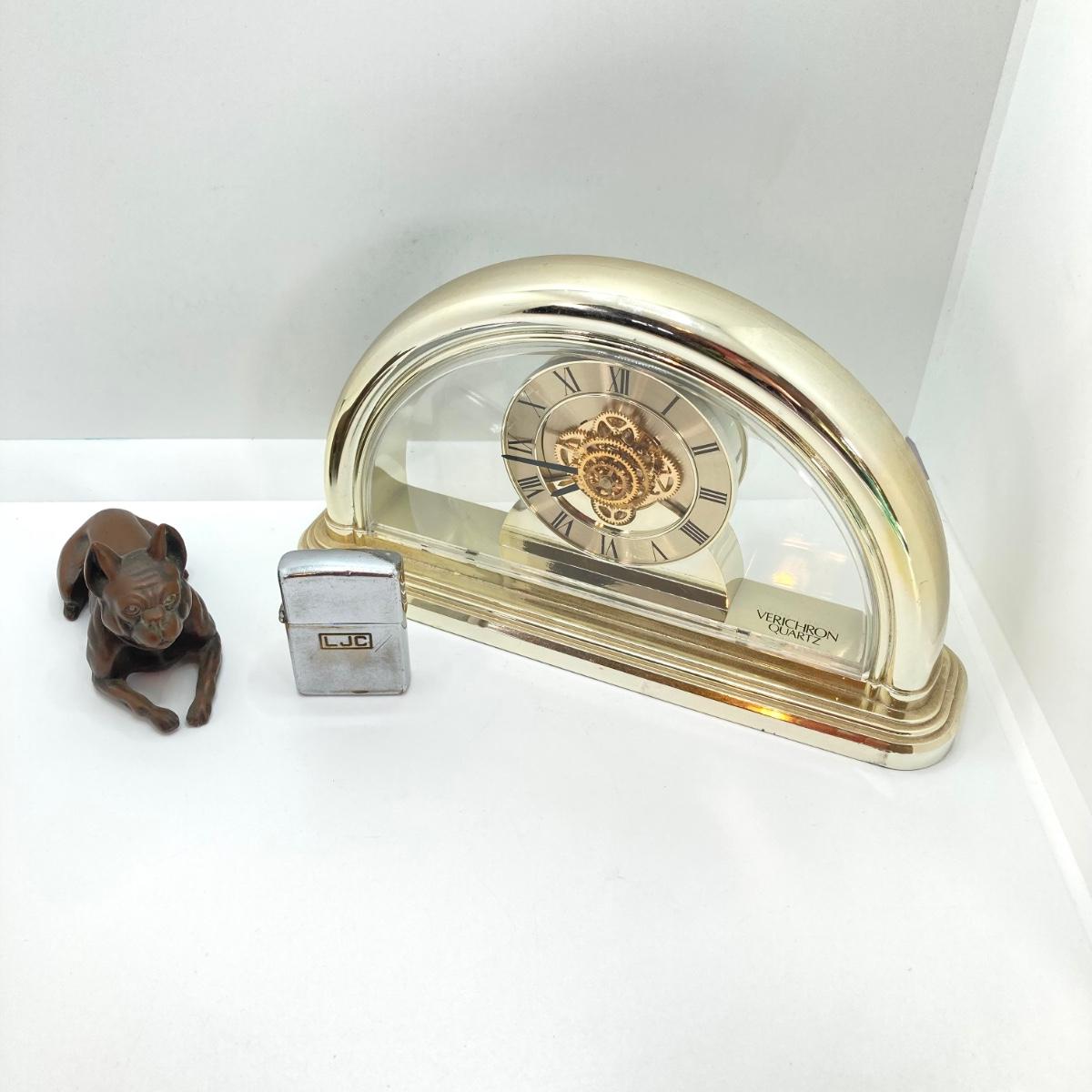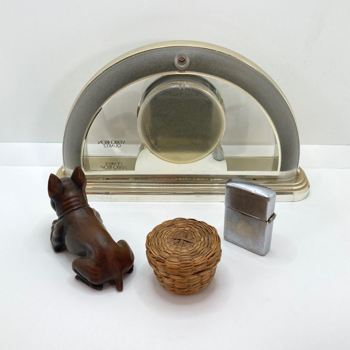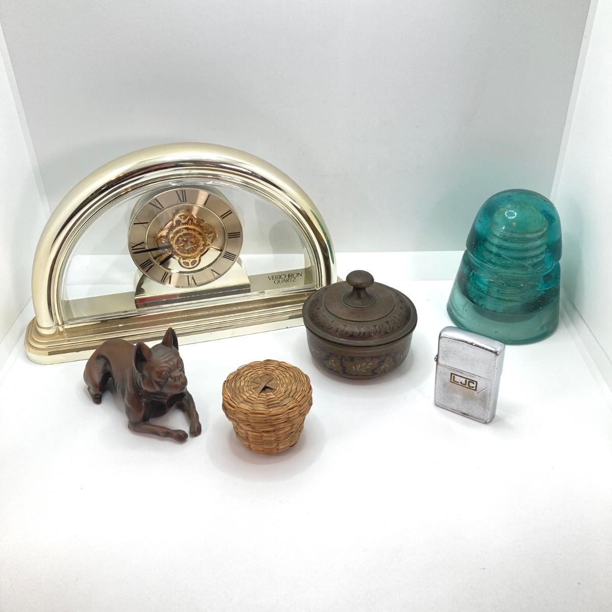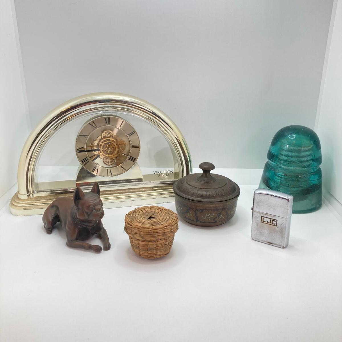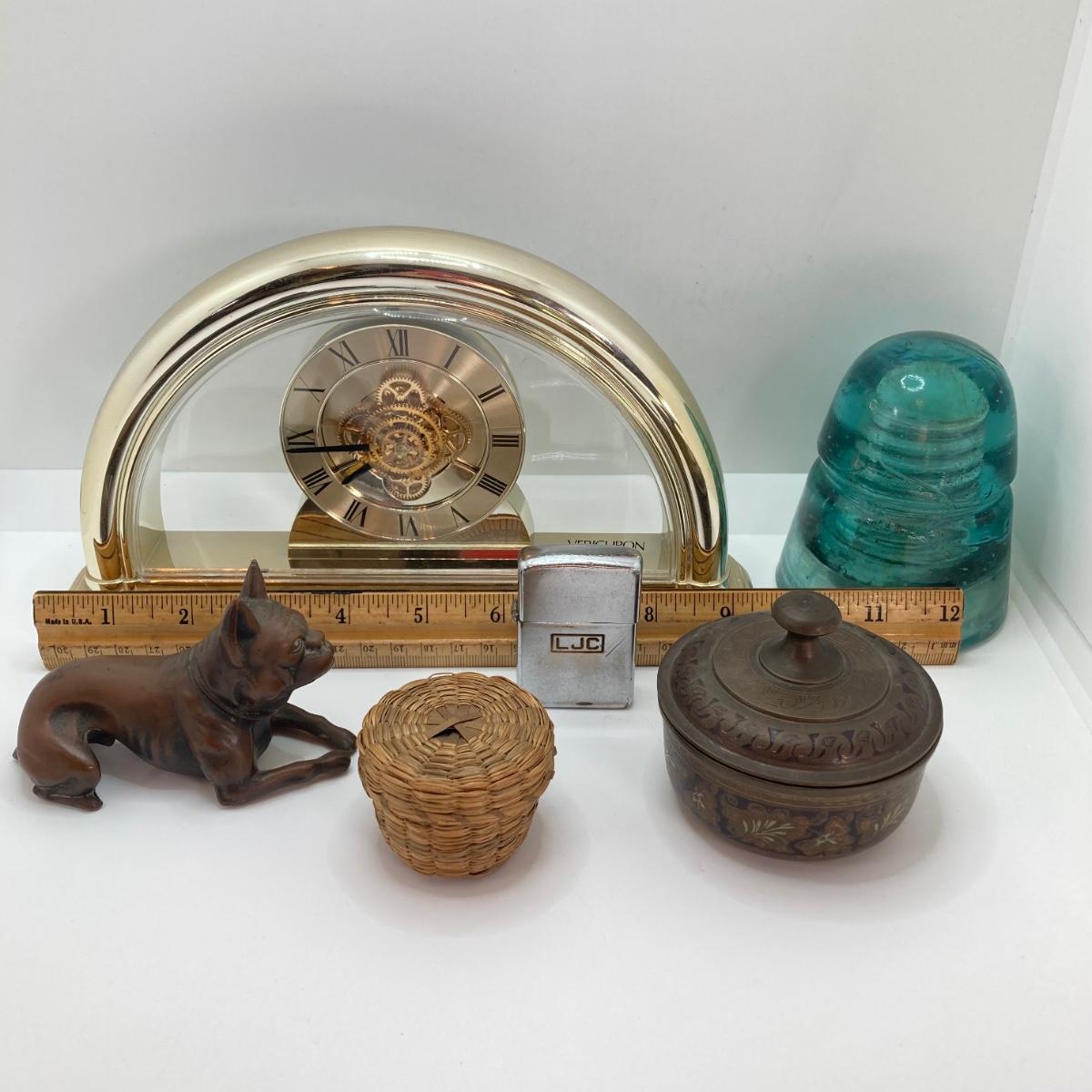 LOT 30: Vintage / Antique Collection - Verichron Quartz Table Clock, Zippo Lighter, Trinket Box, Dog Figurine, Glass Insulator and More