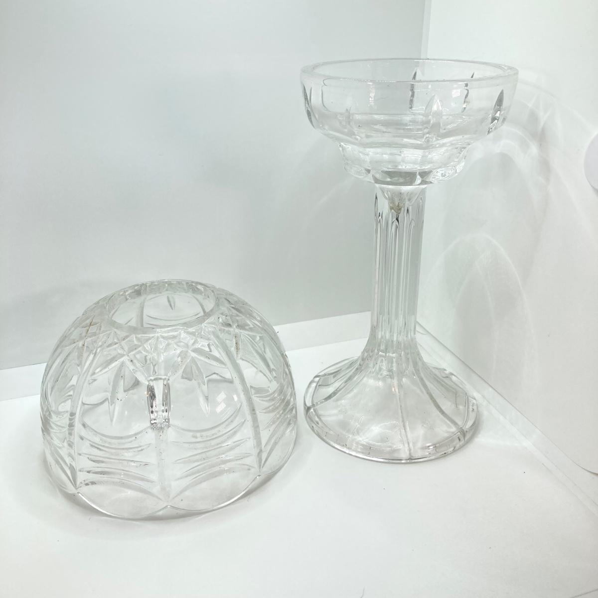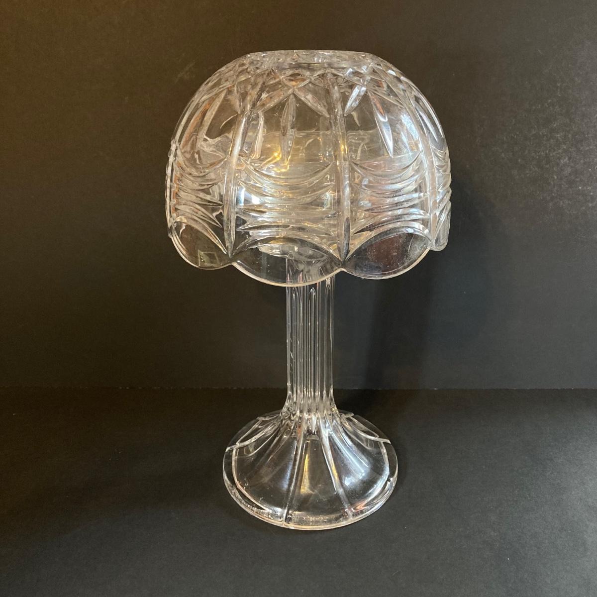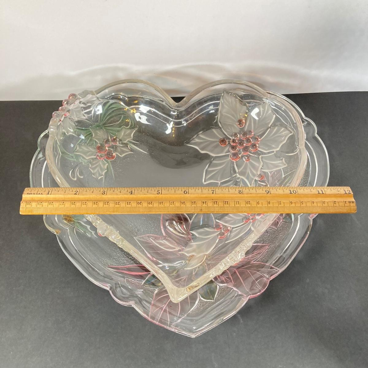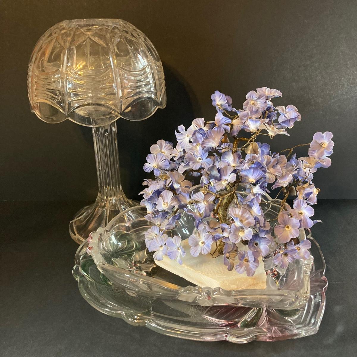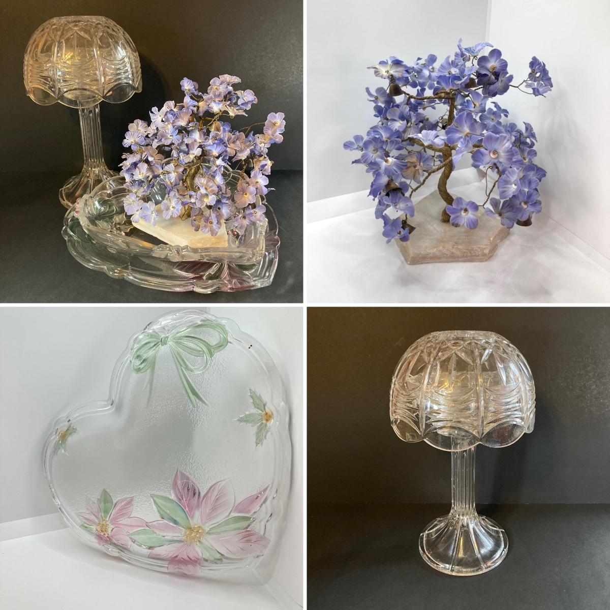LOT 37: Vintage Collection - Czech Republic Dome Style Crystal Candle Holder Lamp, Stone Base Floral Feng Shui Tree and Pair of Heart Shaped Serving Dishes