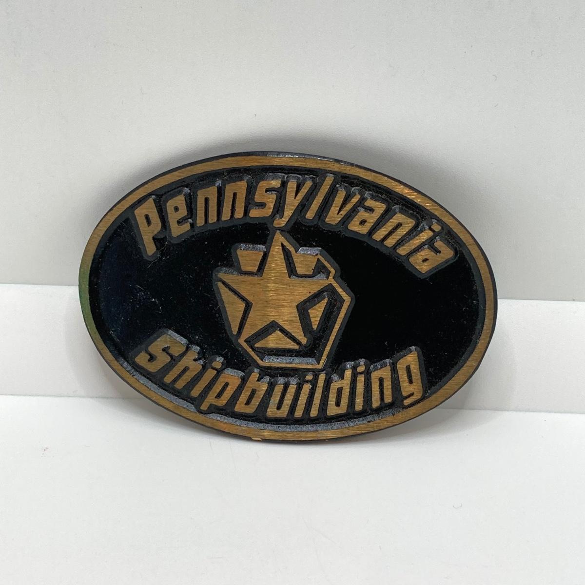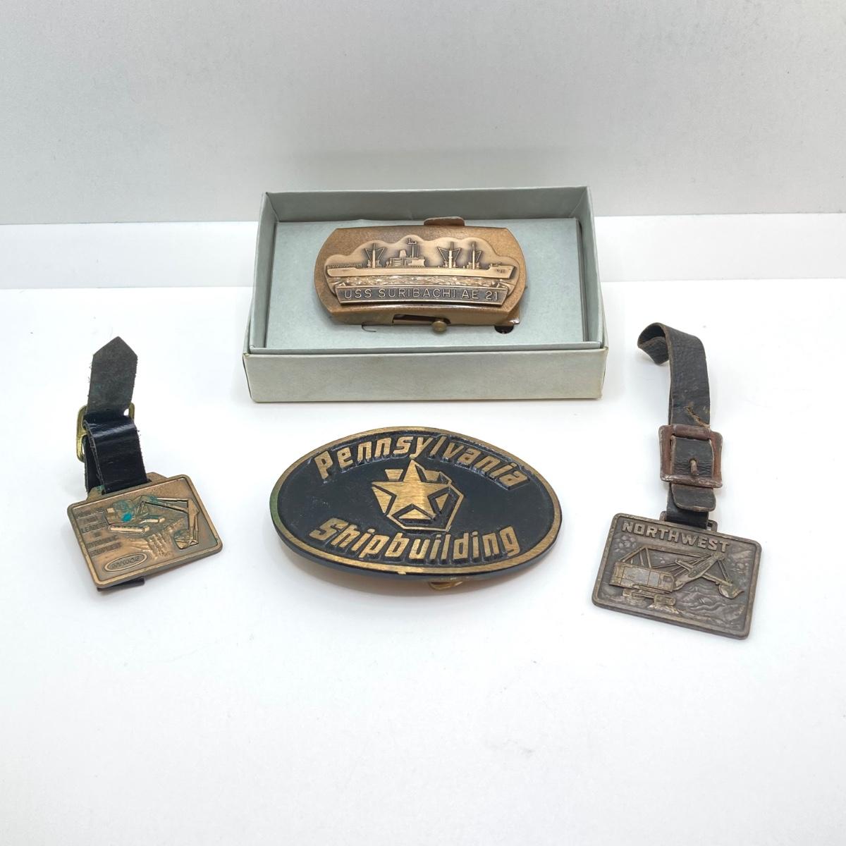 LOT 64: Vintage USS Suribachi AE 21 Belt Buckle in Original Box, Pennsylvania Ship Building DynaBuckle Brass Belt Buckle with Pair of Equipment Operator's Tags