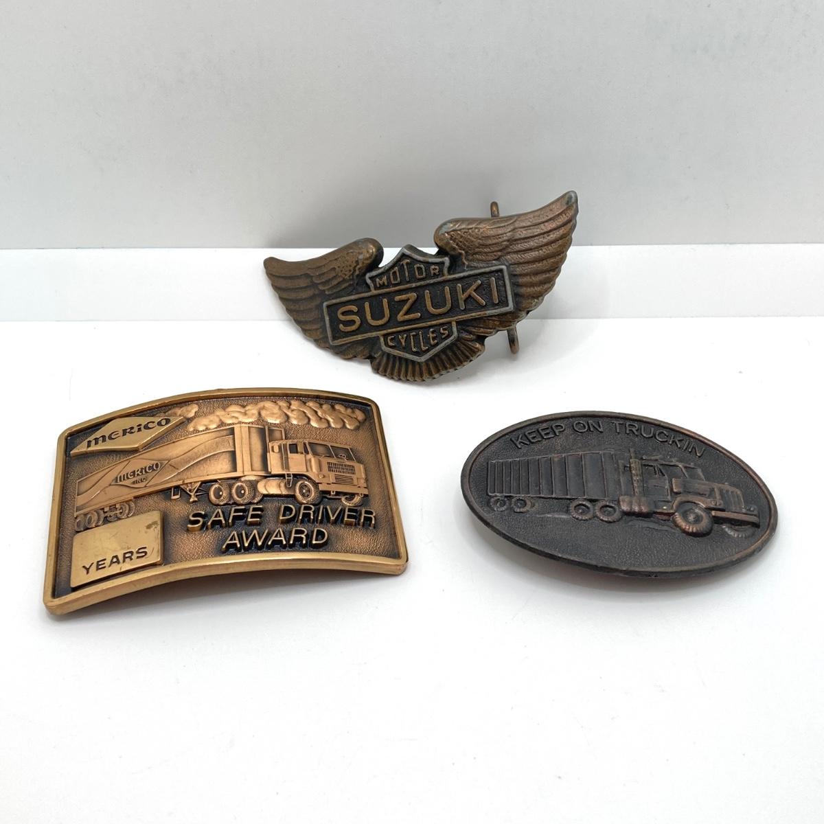 LOT 65: Collection of Vintage Belt Buckles - Keep on Truckin, Suzuki Motor Cycles and Merico Safe Driver Award