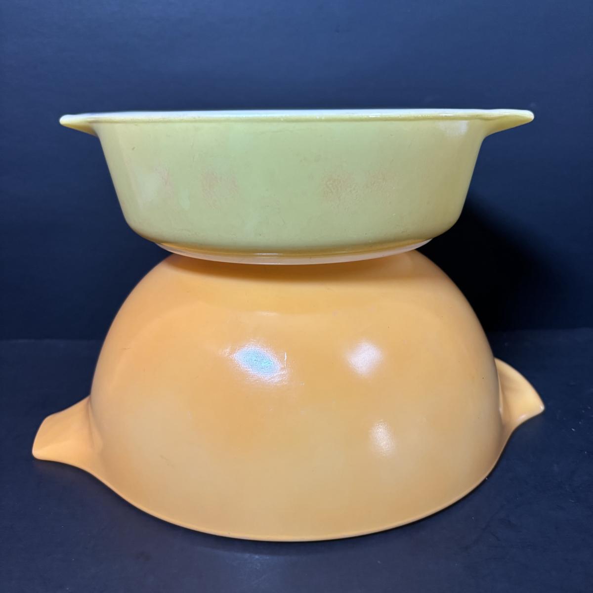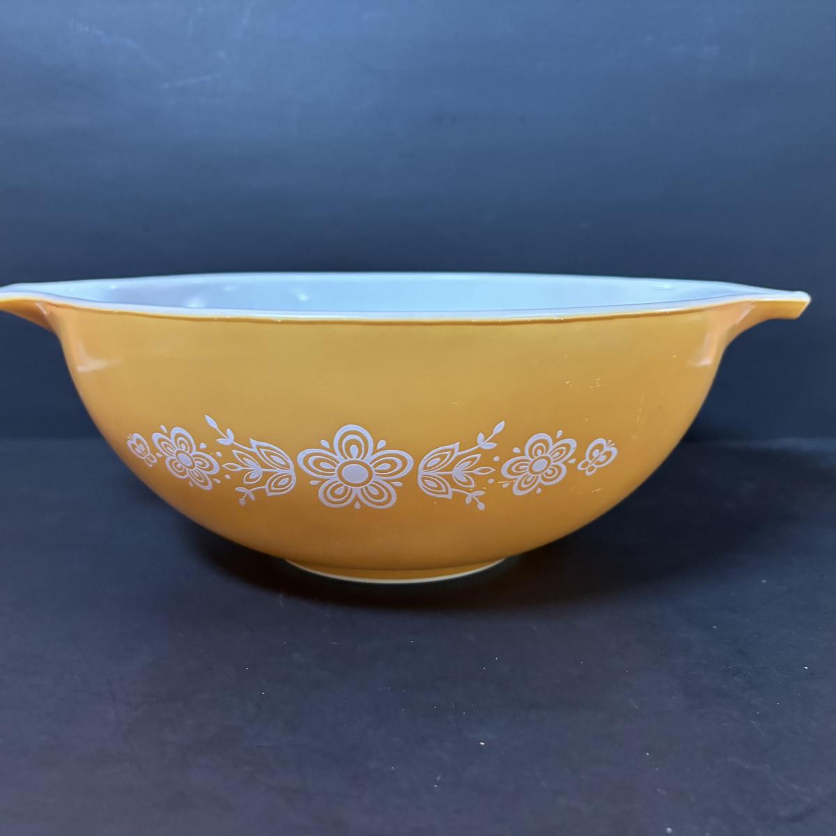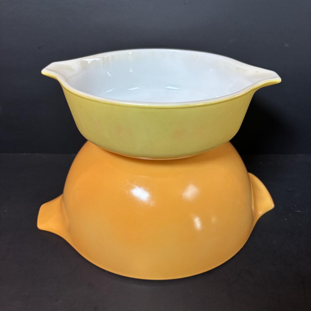 LOT 102: Vintage Pyrex Butterfly Gold Cinderella Mixing Bowls and Marigold Yellow Cinderella Casserole Dish