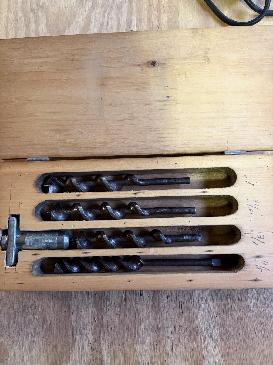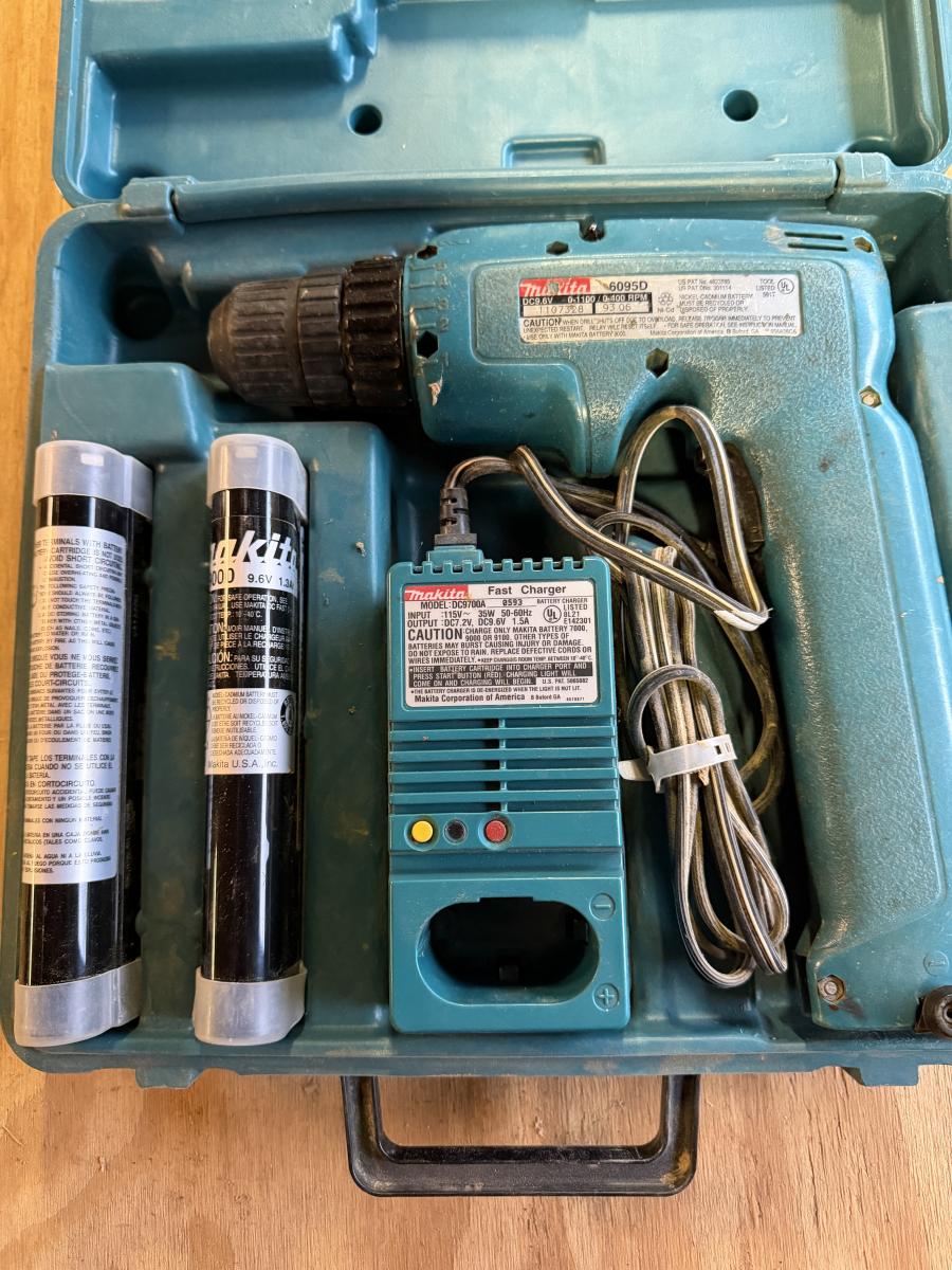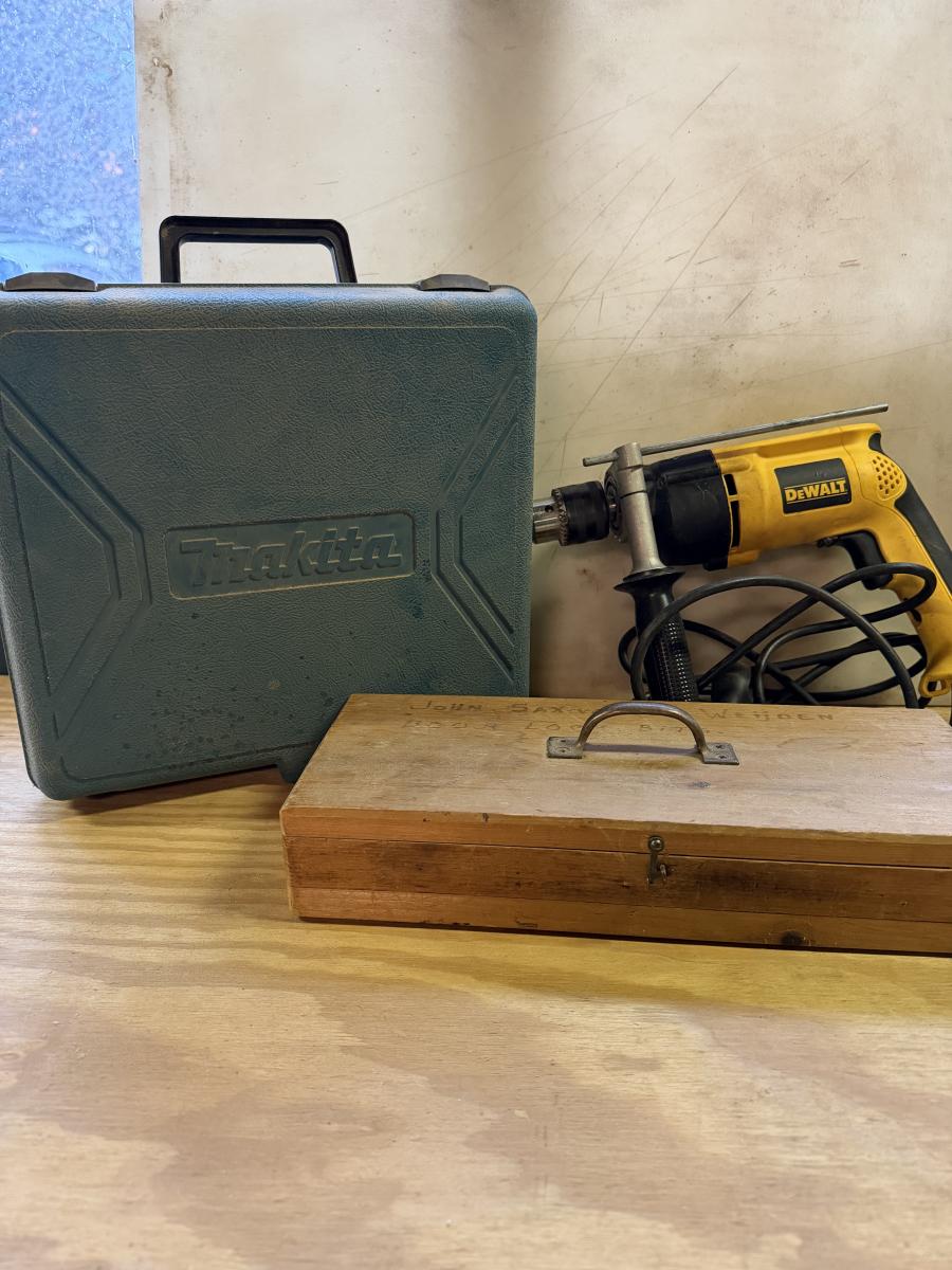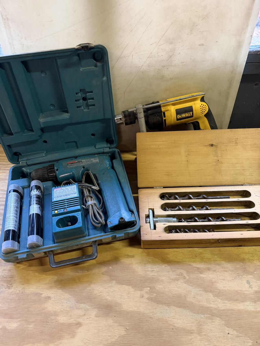 LOT 146 - Makita Cordless Drill, Dewalt Hammer Drill, & Auger Drill Bit Set