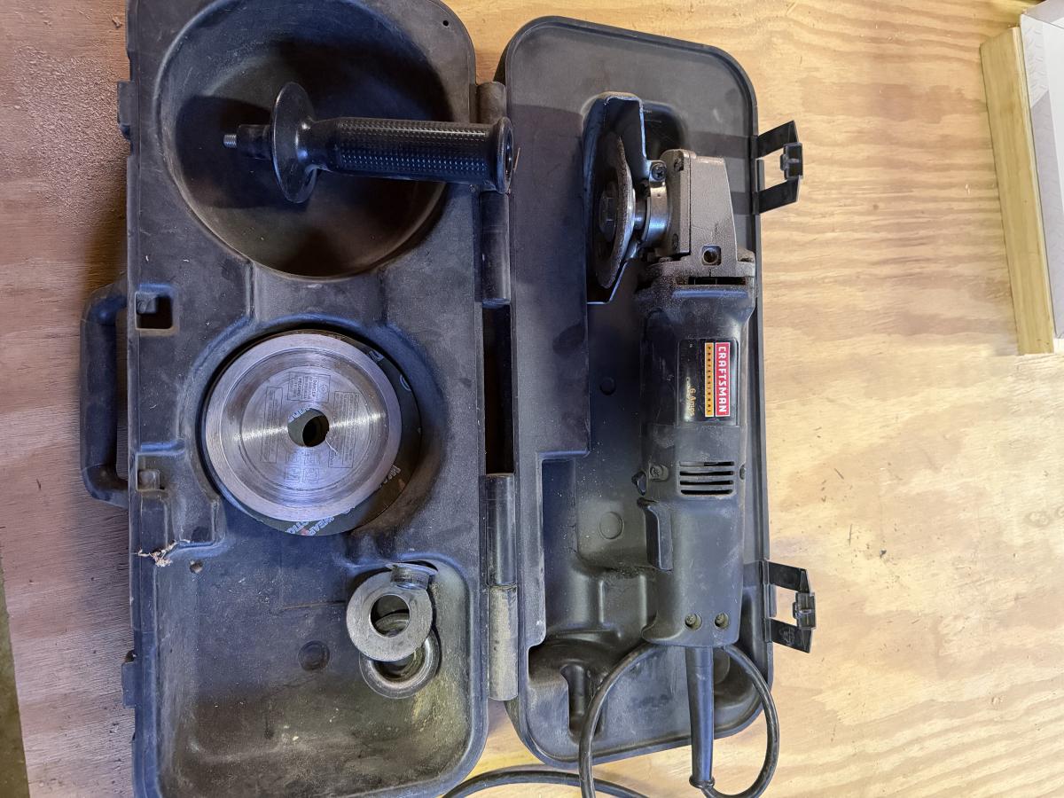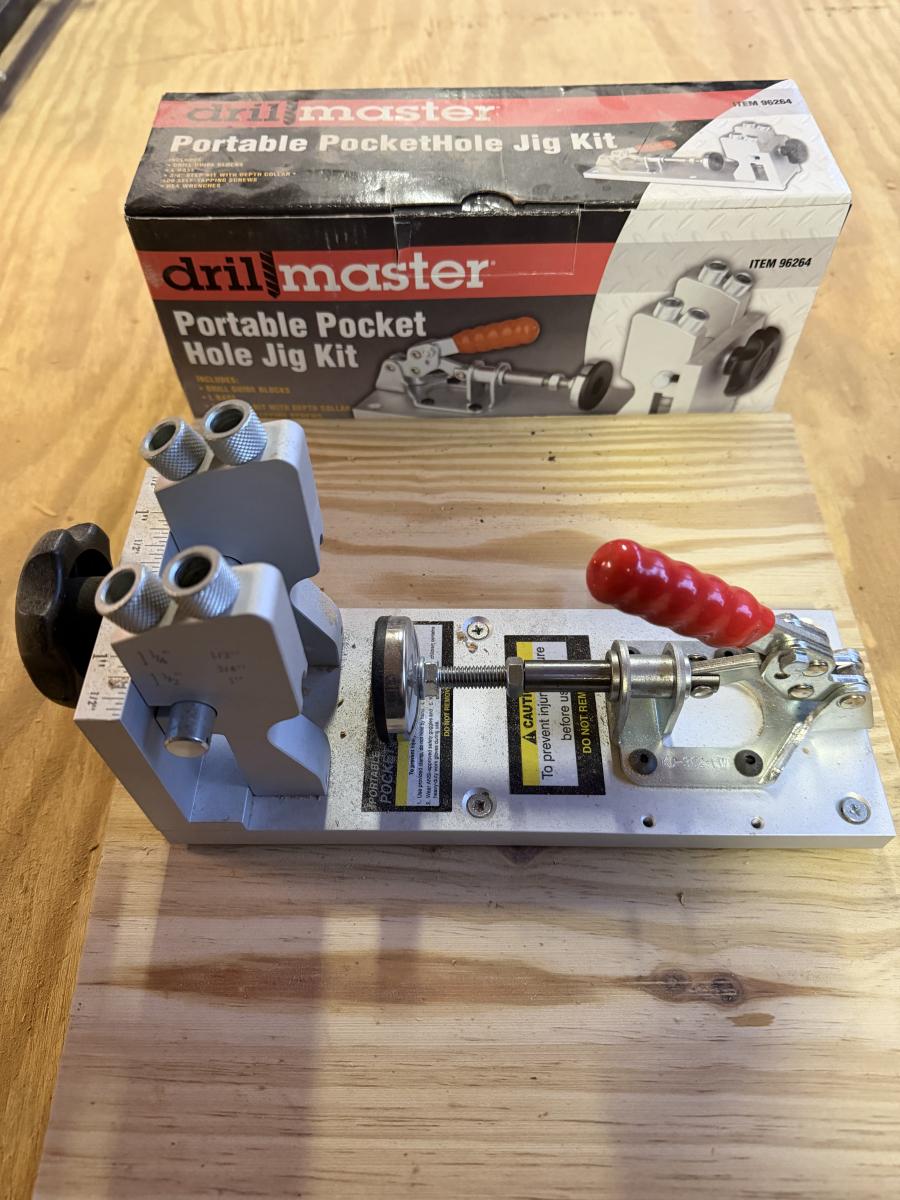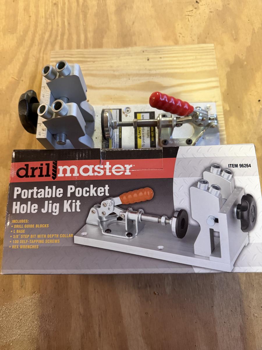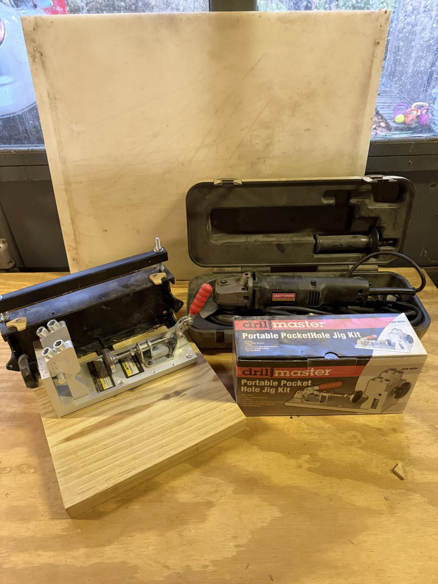 LOT:: 150 - Drill Master Portable Pocket Hole Jig Kit, Craftsman Angle Gringer, & Dovetail Templates