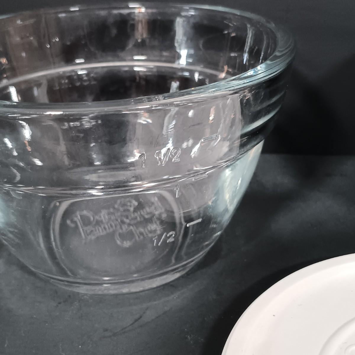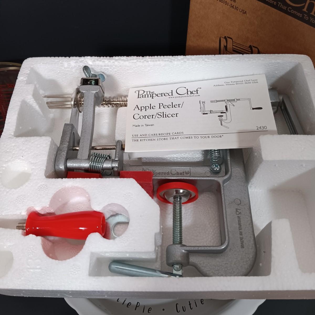 LOT 165: The Pampered Chef Apple Peeler and Prep Bowls with Nantucket Pie Plate, Fire King Measuring Cup & More
