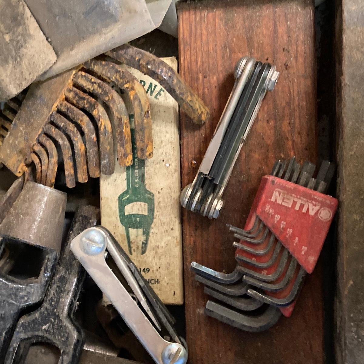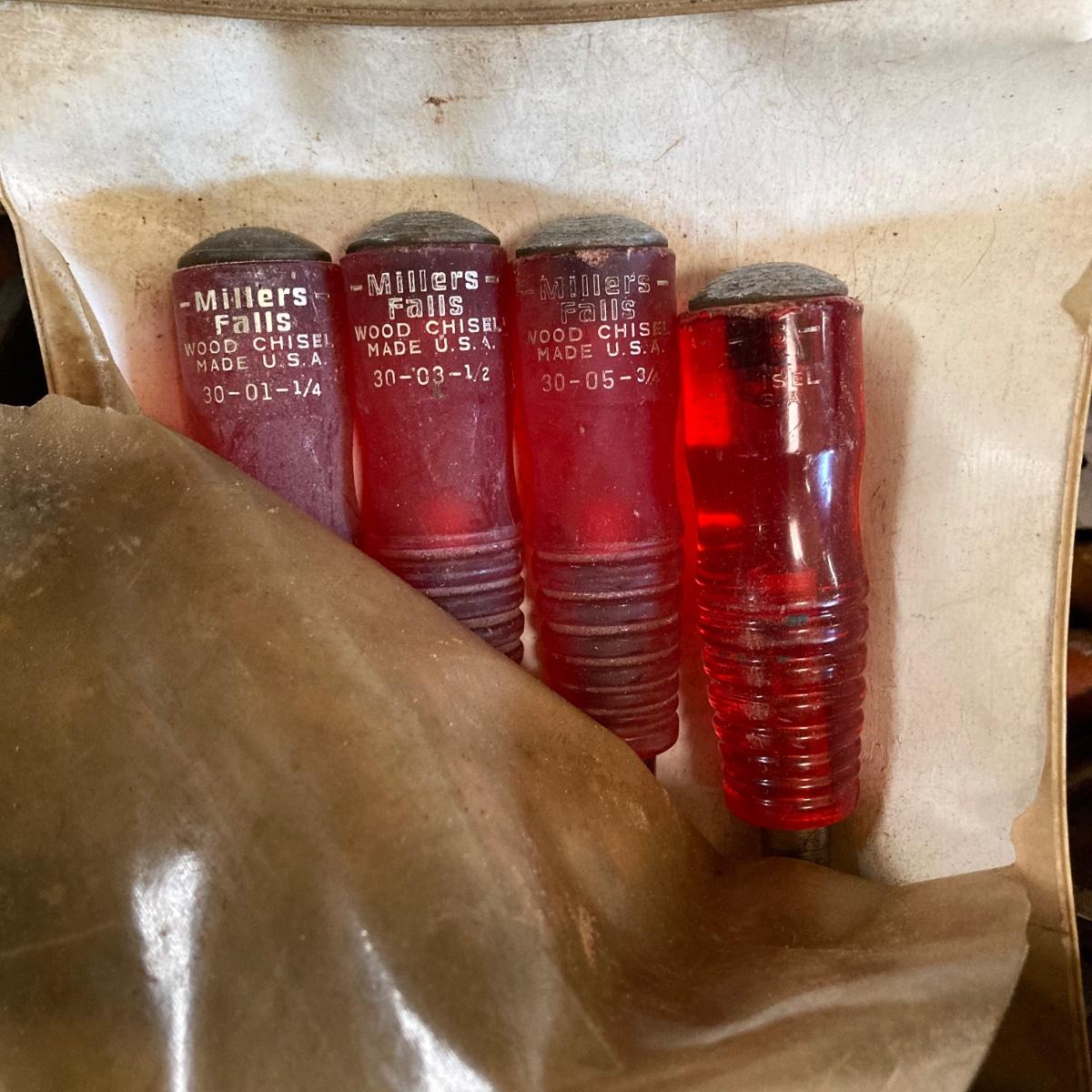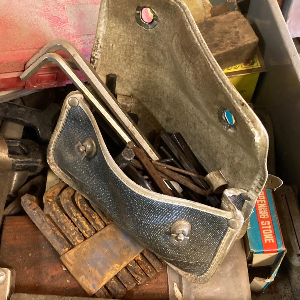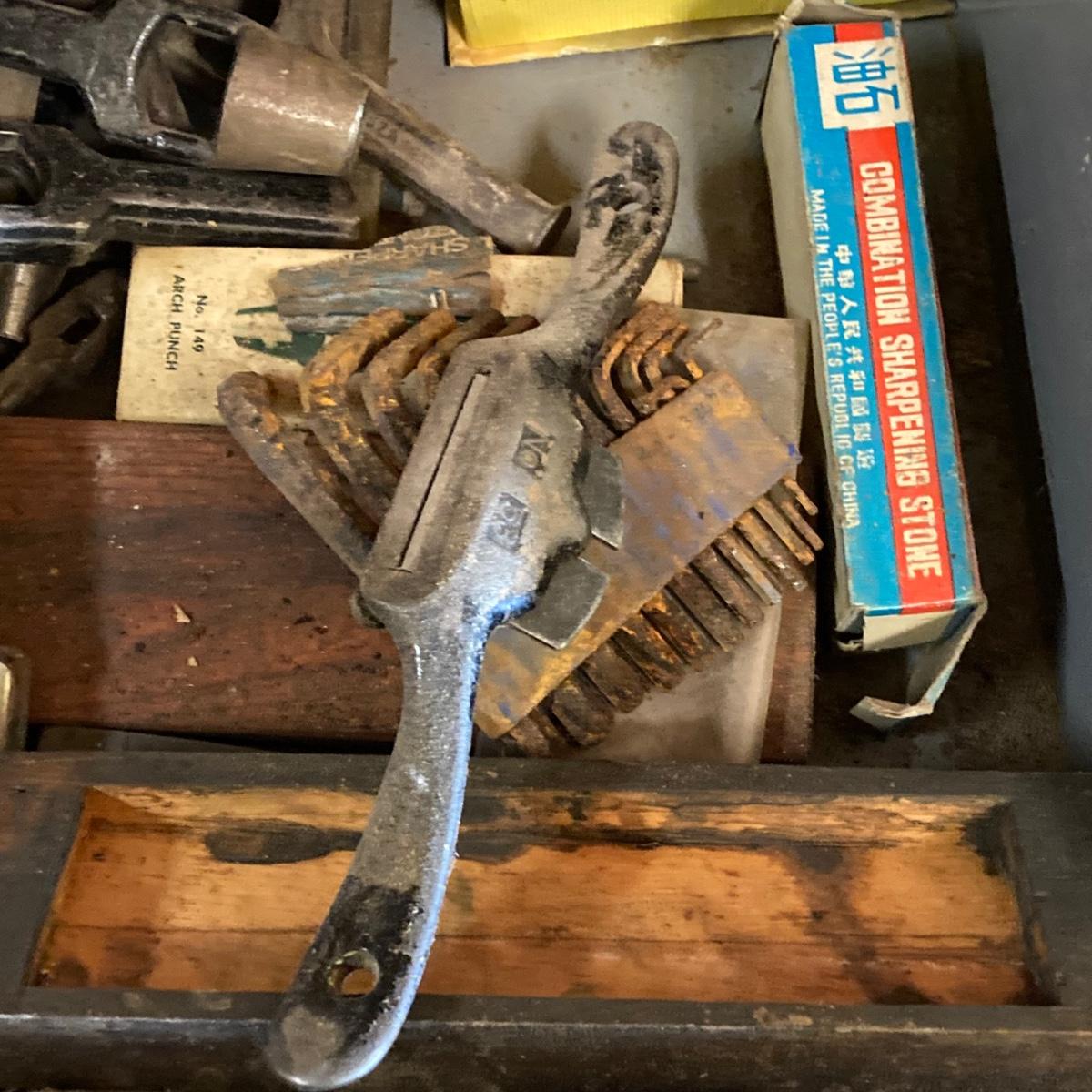LOT 252: Garage Cabinet Finds - Gasket Hole Punch Set, Butt Chisels, Hollow Punch Set, Sharpening Stones and More
