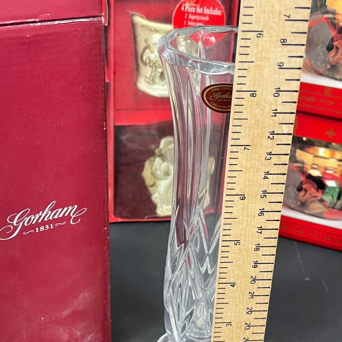 LOT 56: New in Package Christmas Decor - Gorham Crystal Vase and More