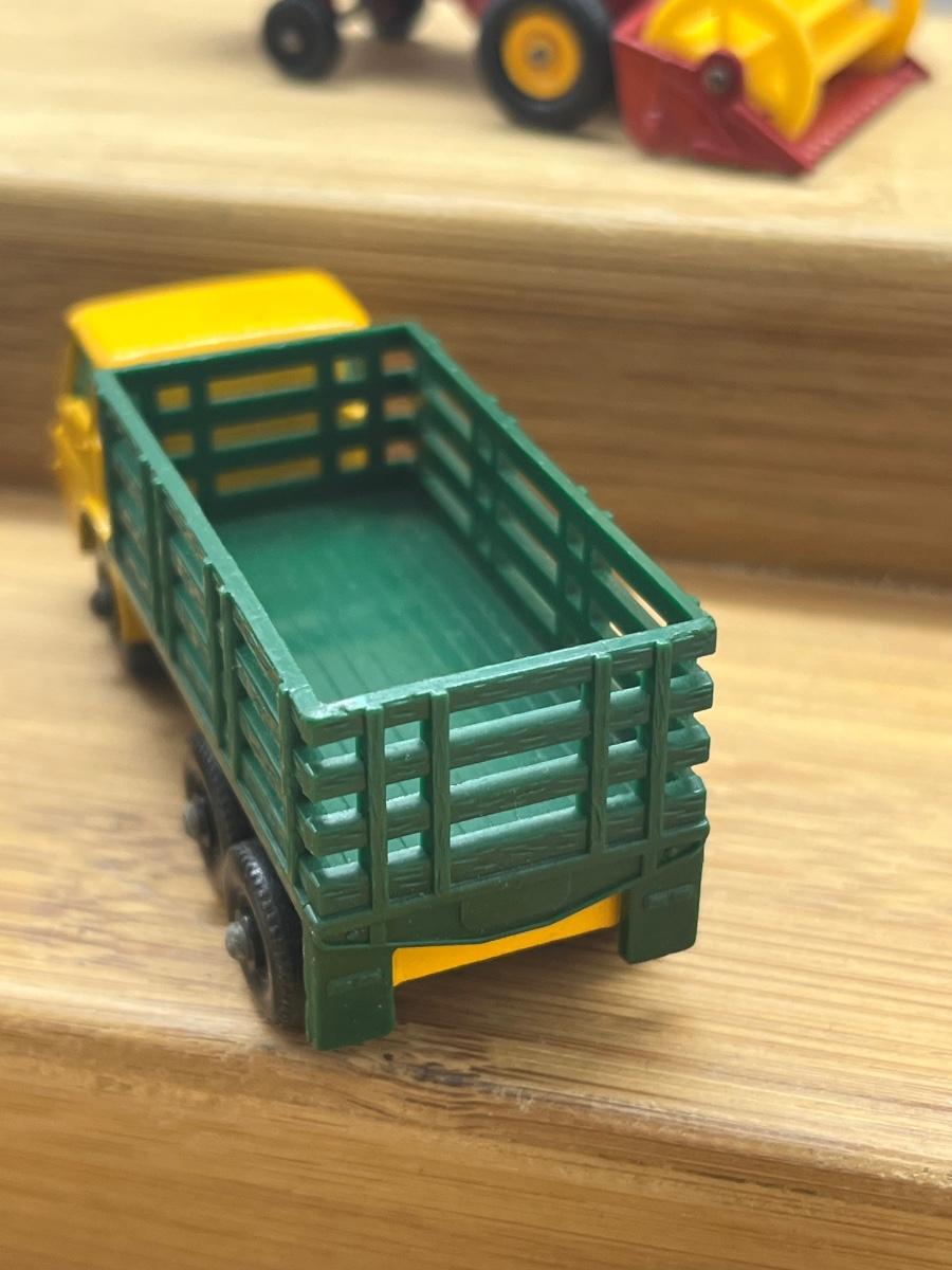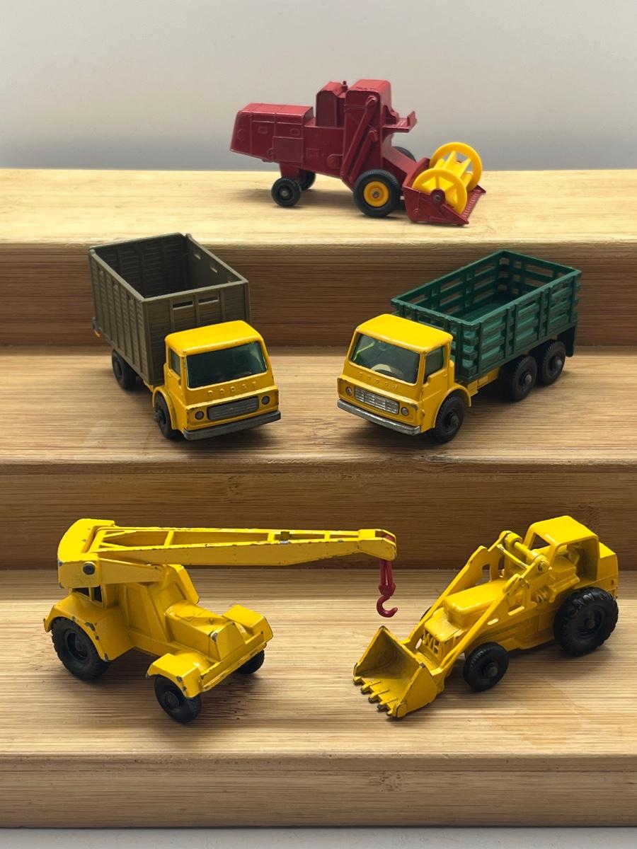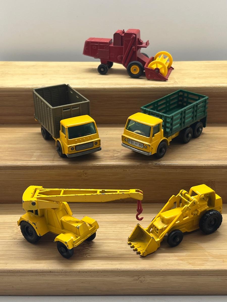 LOT 129: Vintage Lesney Matchbox Vehicles - Cattle Truck, Stake Truck, Jumbo Crane, Weatherill Hydraulic, Claas Combine Harvester