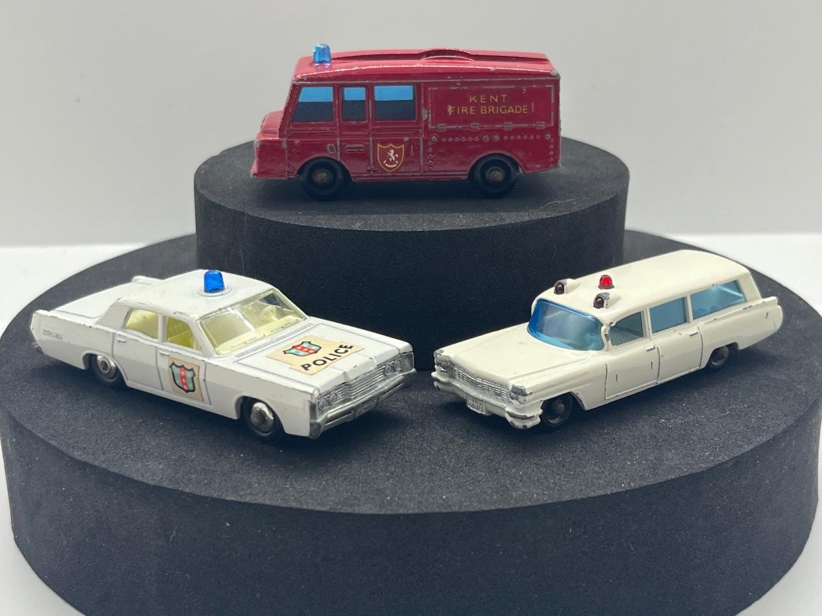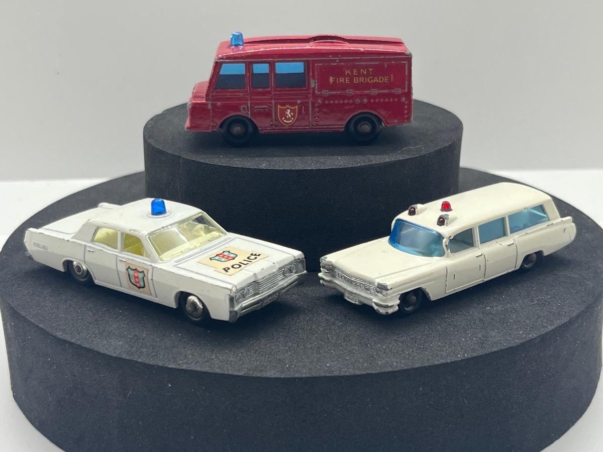 LOT 133: Vintage Lesney Matchbox Vehicles - Mercury, S&S Cadillac Ambulance, Land Rover Fire Truck