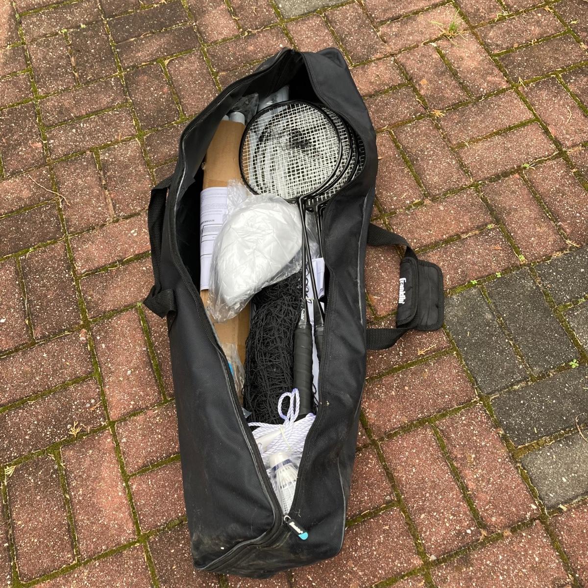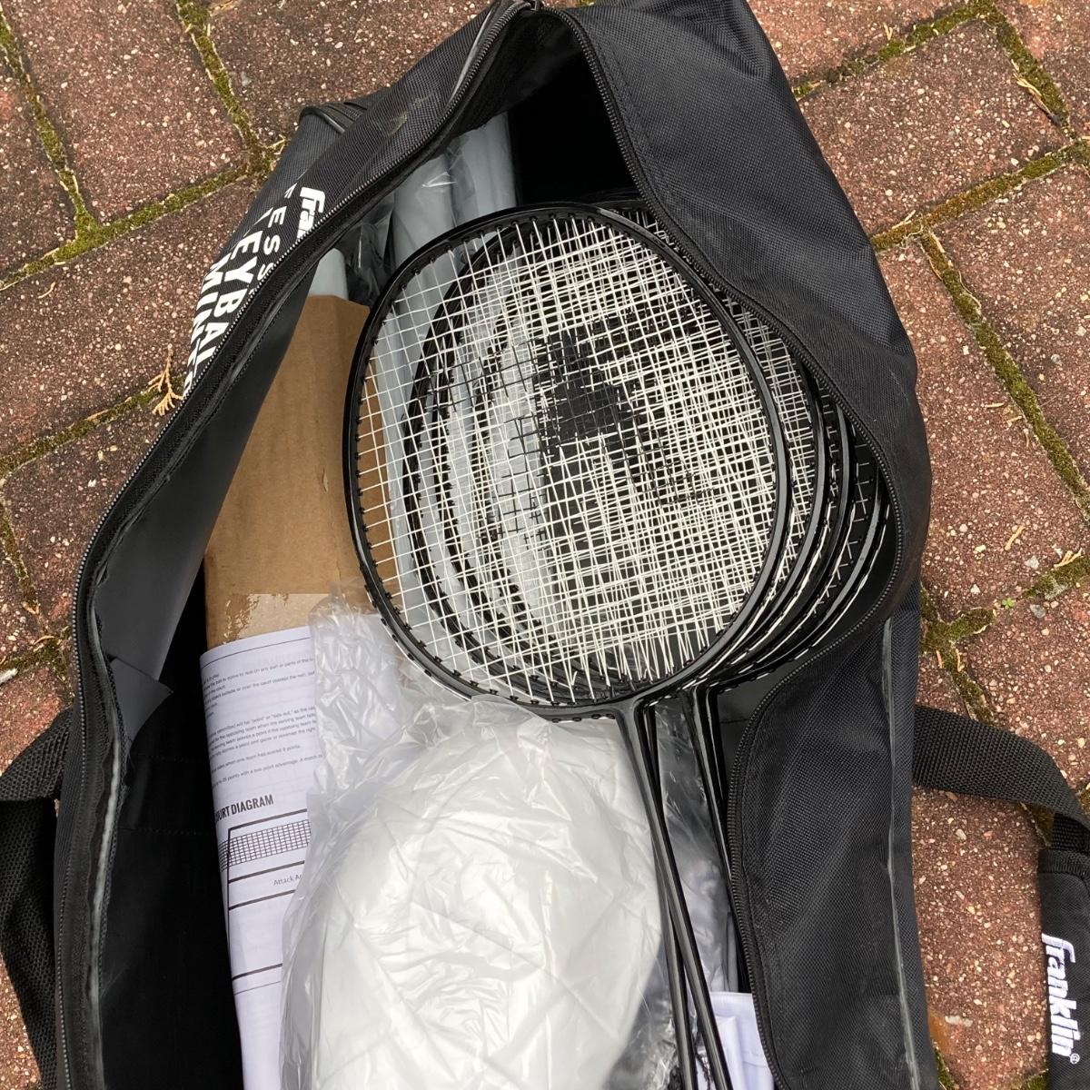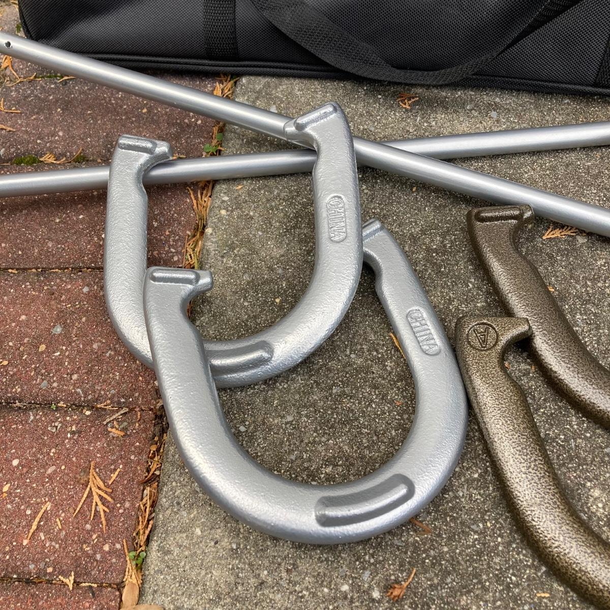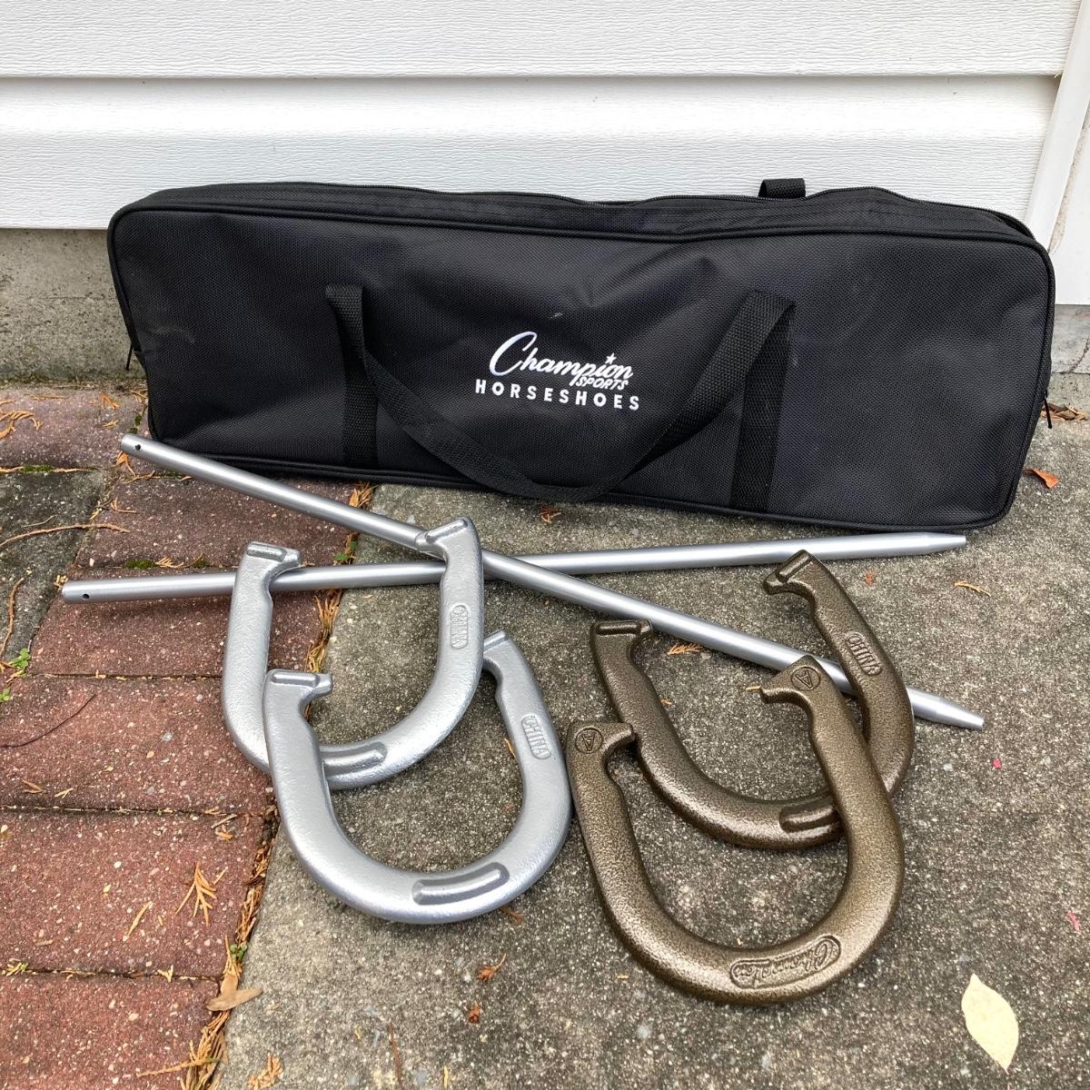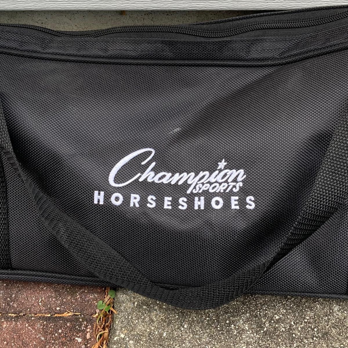 LOT 37: Outdoor Yard Games Collection in Storage Bags - Champion Sports Horseshoes, Franklin Volleyball & Badminton Set and Pointyard Bocce Set