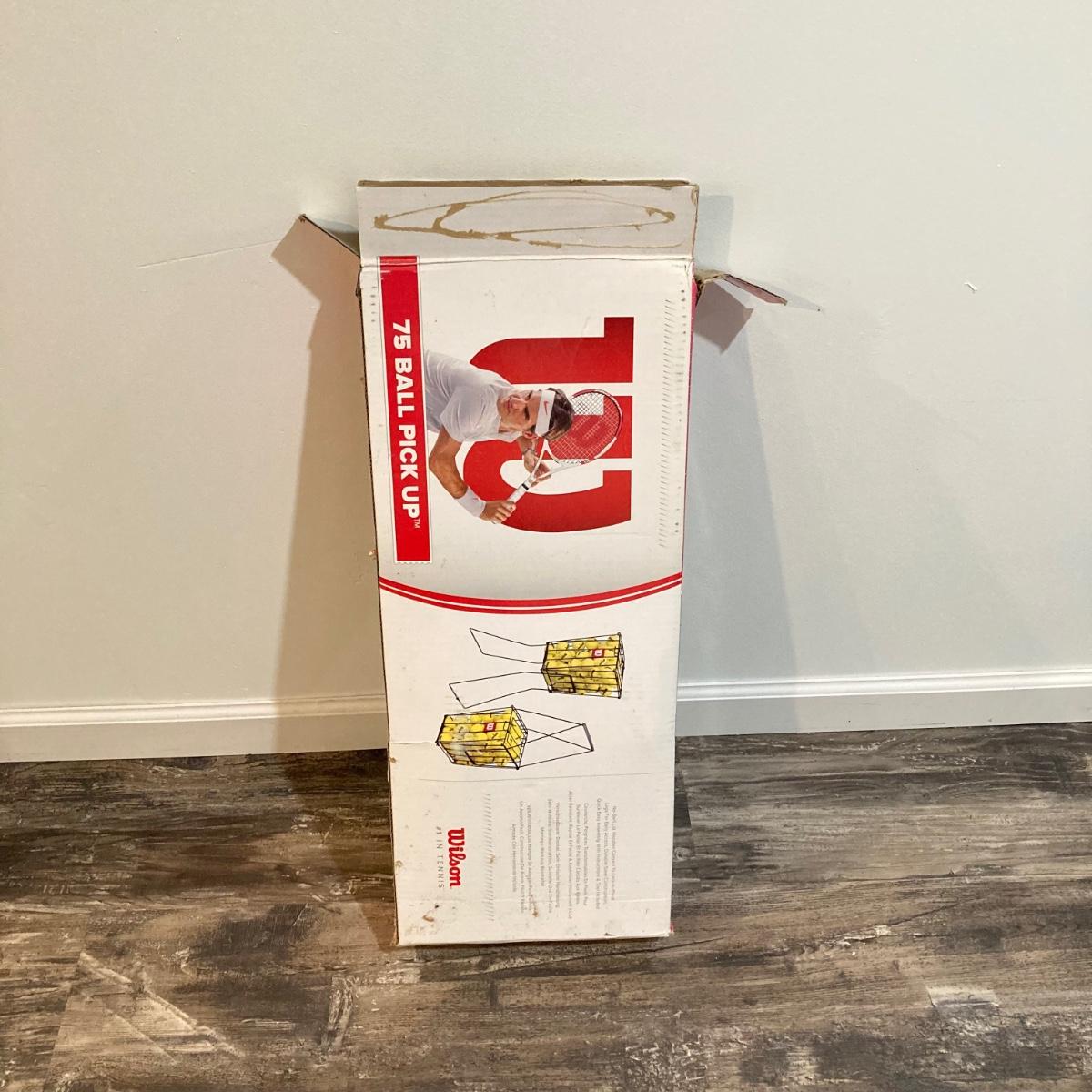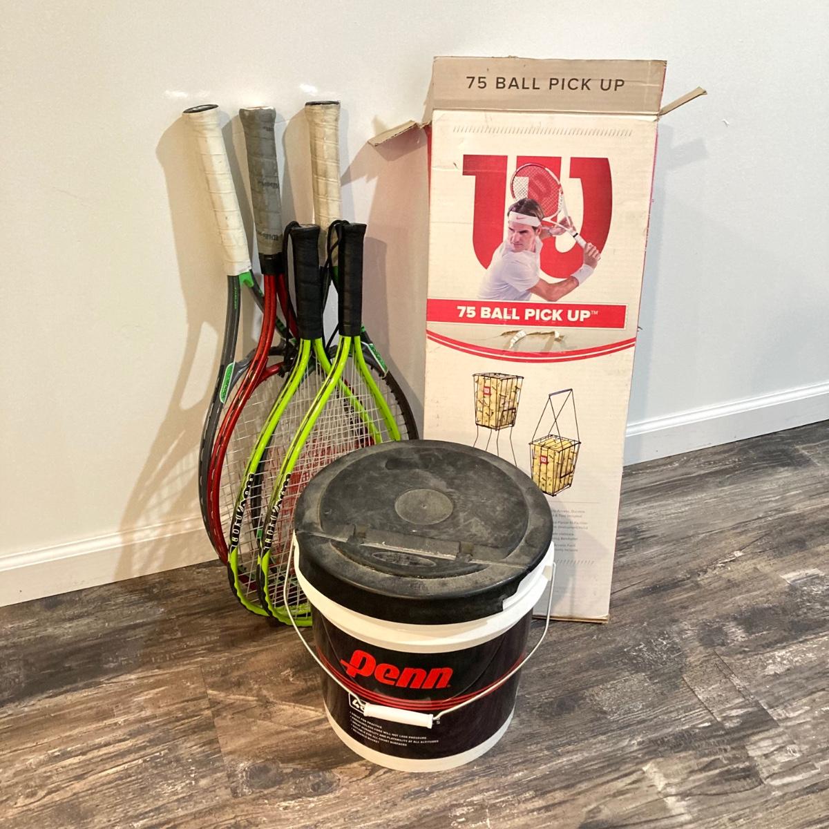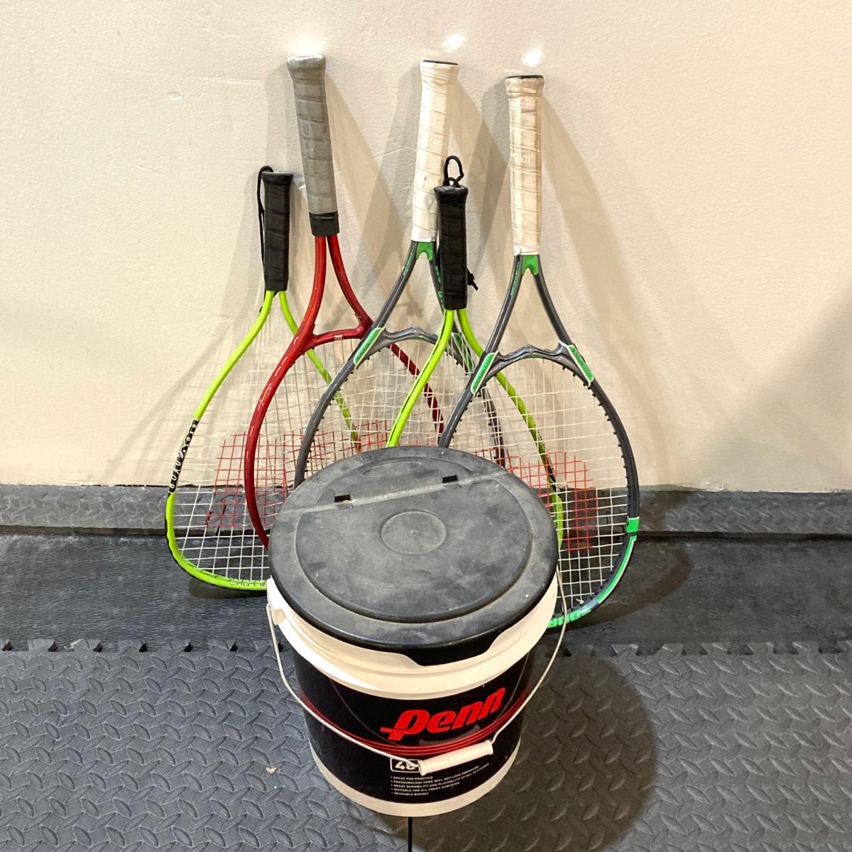 LOT 65: Tennis and Raquetball Collection - Wilson Raquets, Bucket of Penn Balls and Wilson 75 Pick Up Ball Carrier / Holder