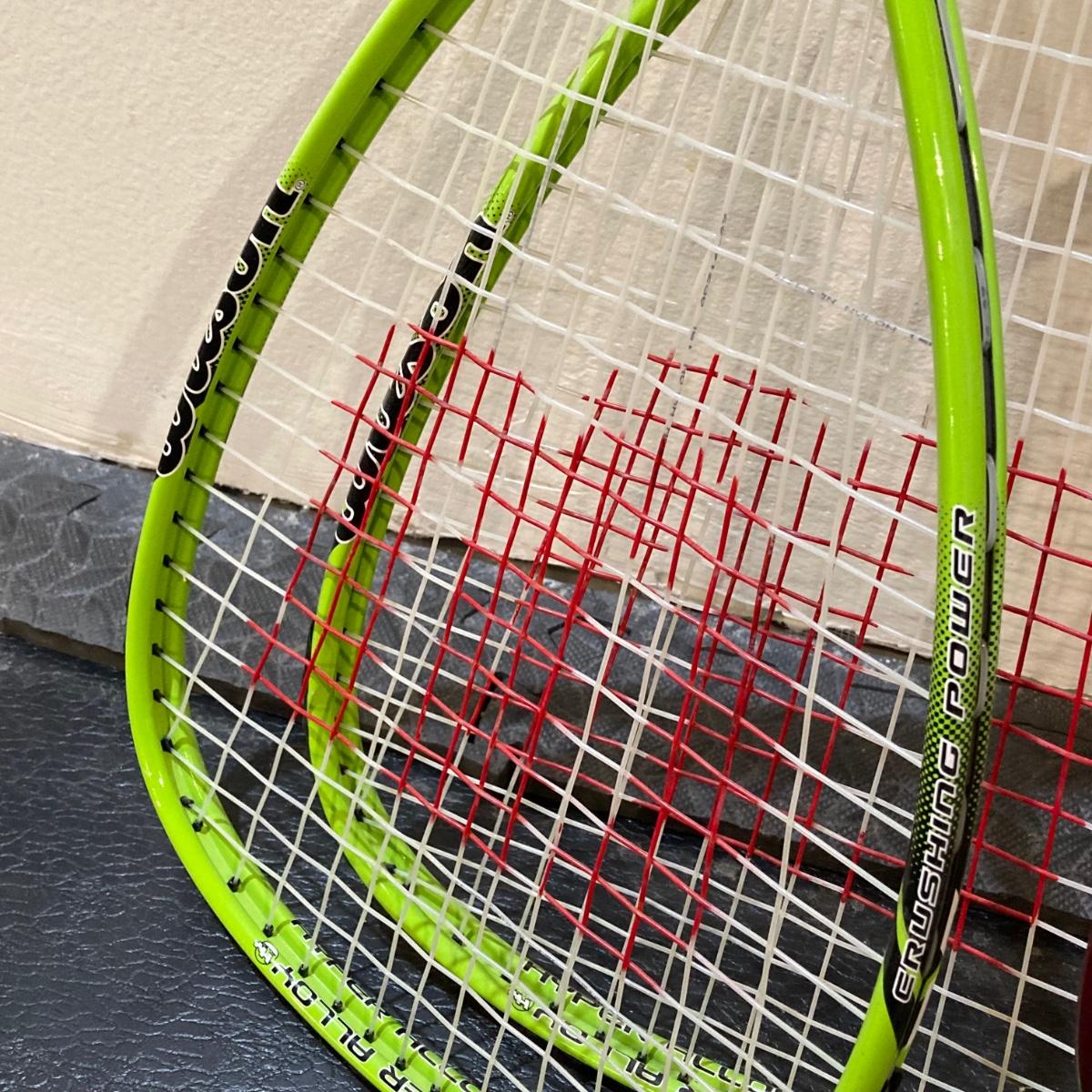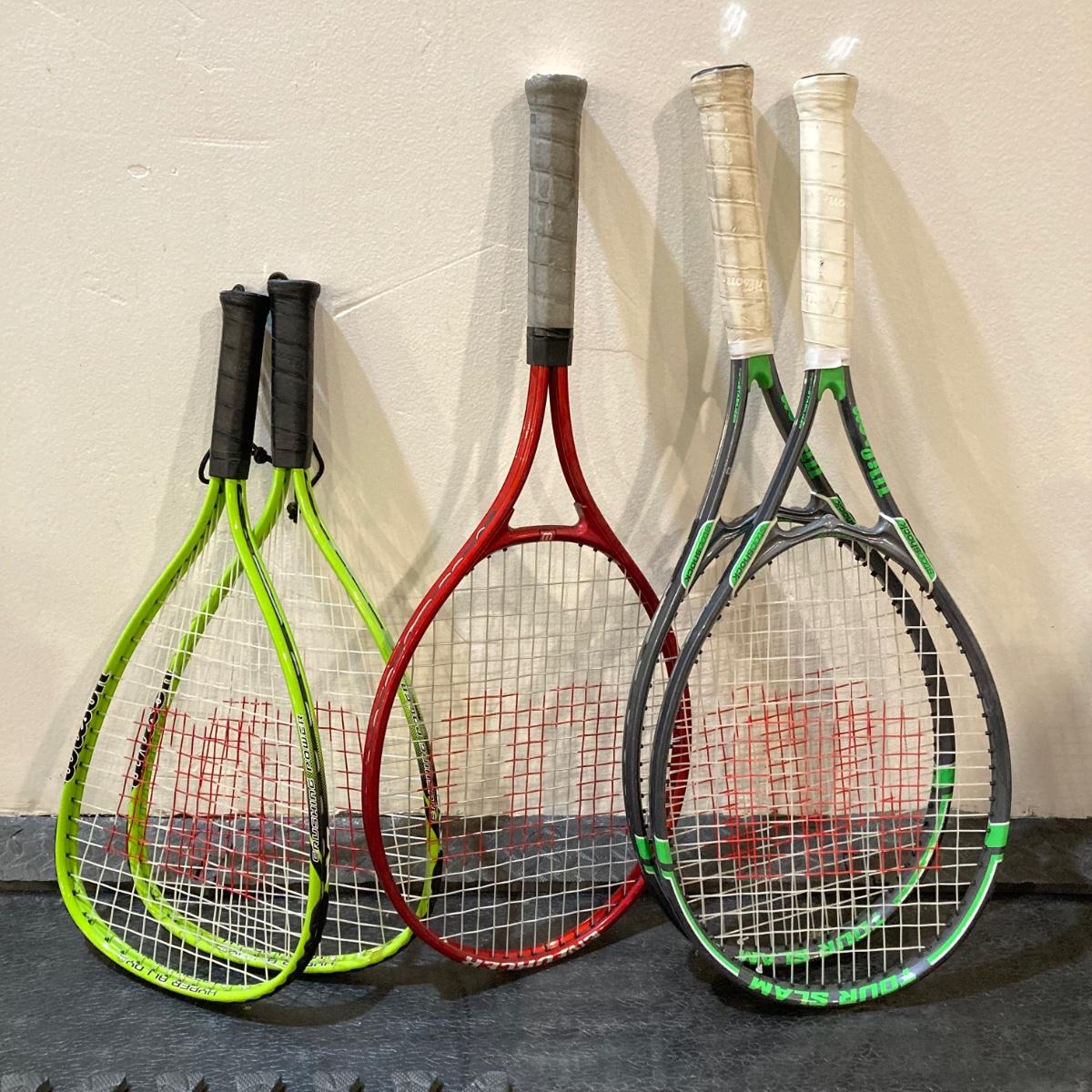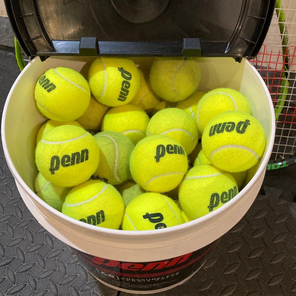 LOT 65: Tennis and Raquetball Collection - Wilson Raquets, Bucket of Penn Balls and Wilson 75 Pick Up Ball Carrier / Holder