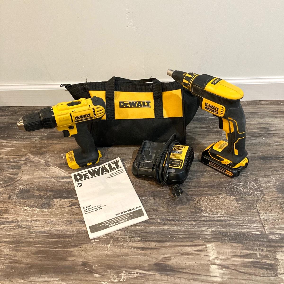 LOT 80: Cordless DeWalt Tool Collection with Storage Bag - Drill / Driver DCD771, Battery, Charger DCB112 and Drywall Screwgun DCF620