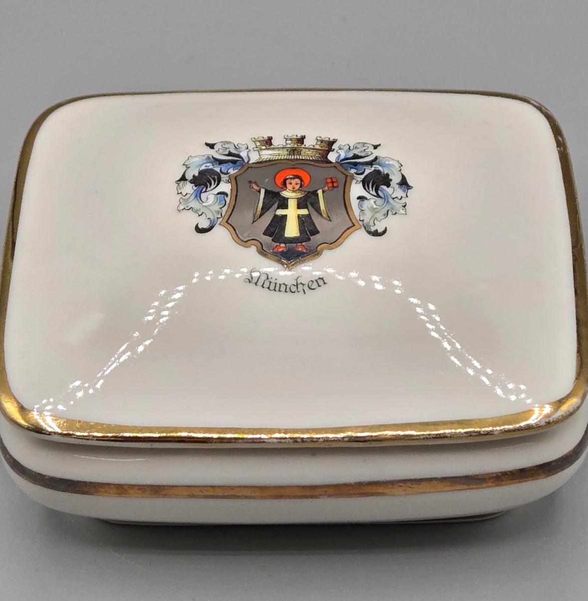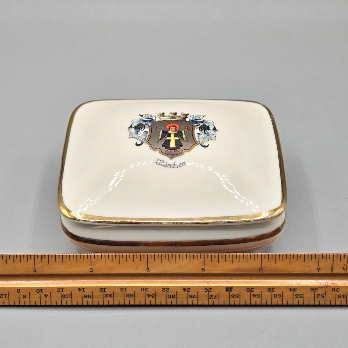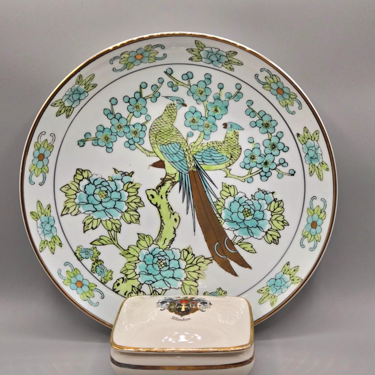 LOT 97: Japanese MCM Gold Imari Hand Painted Peacock Wall Charger and Porcelain Trinket Box Featuring the Coat of Arms for Munich, Germany