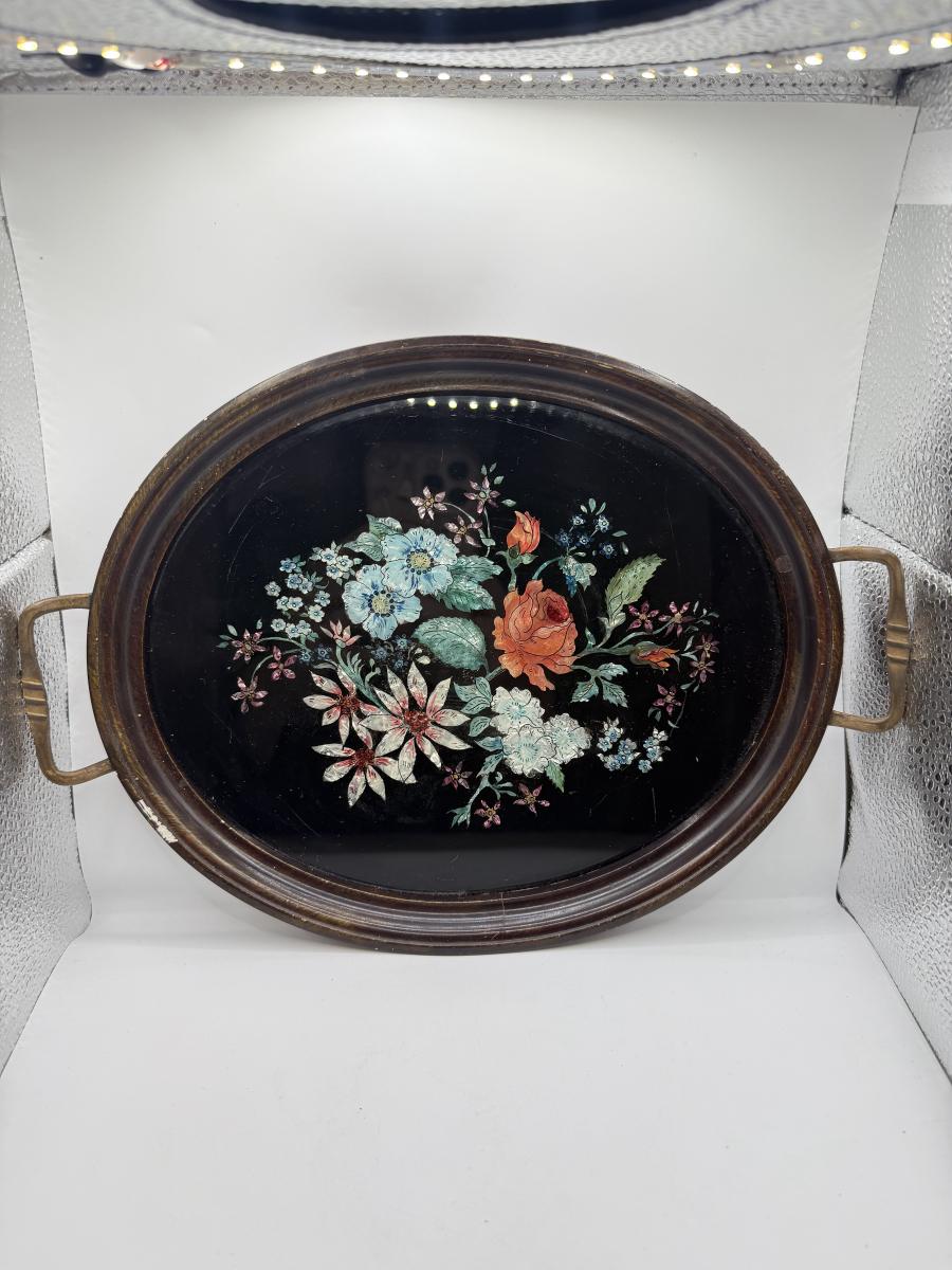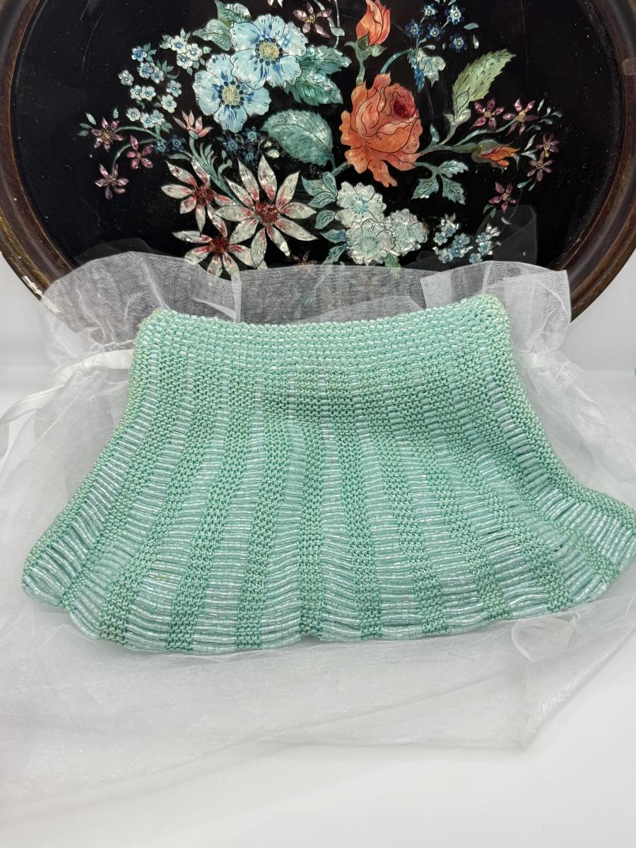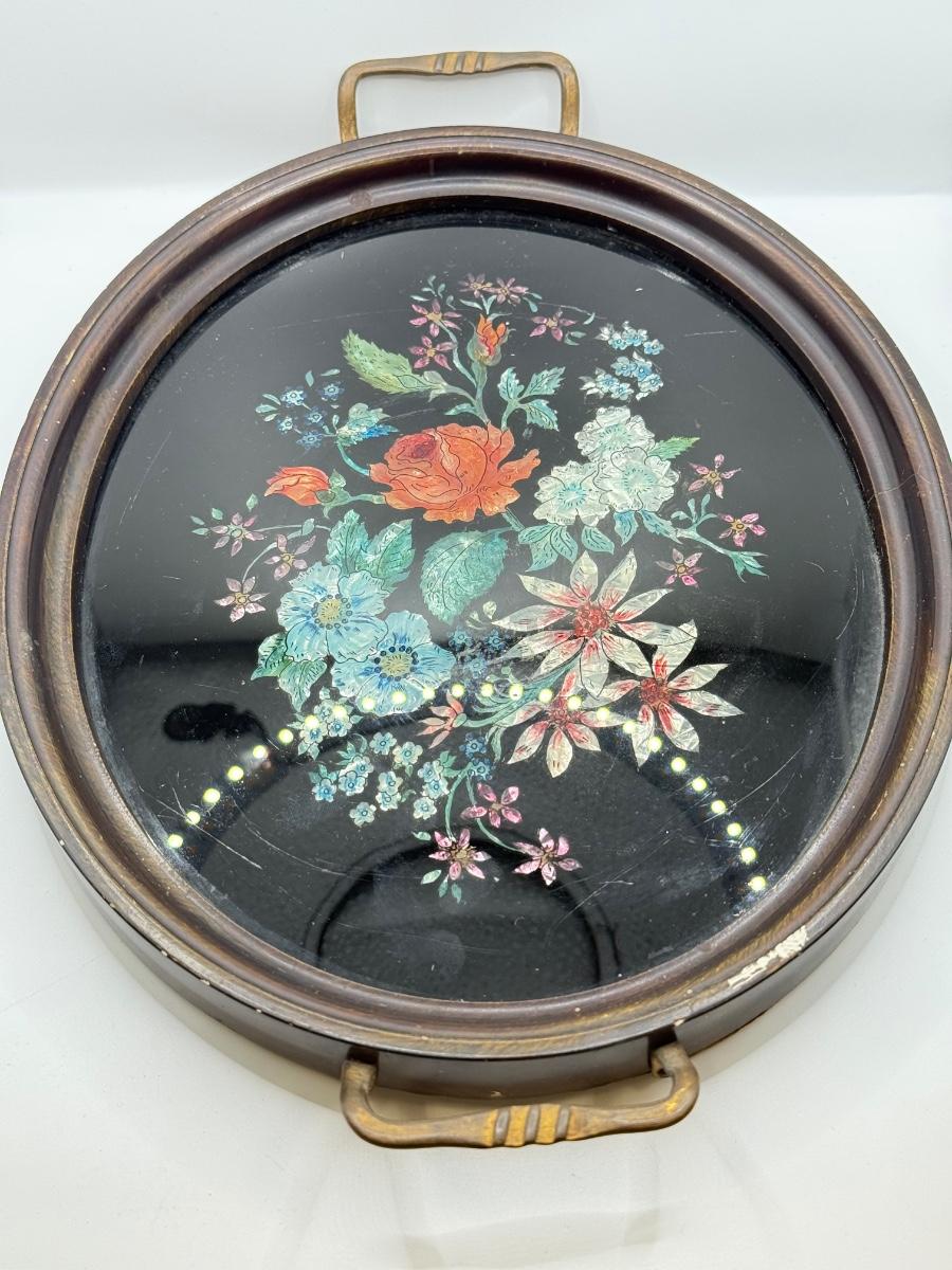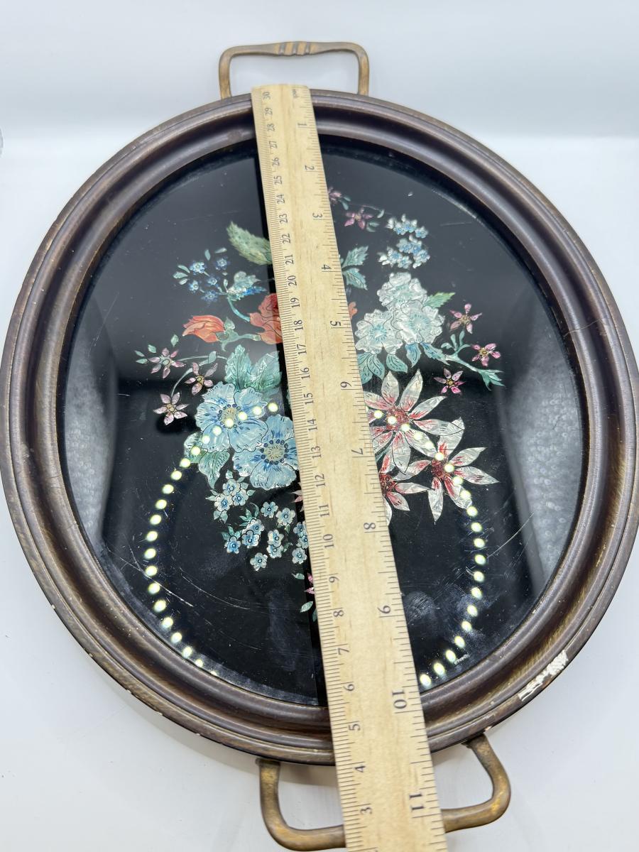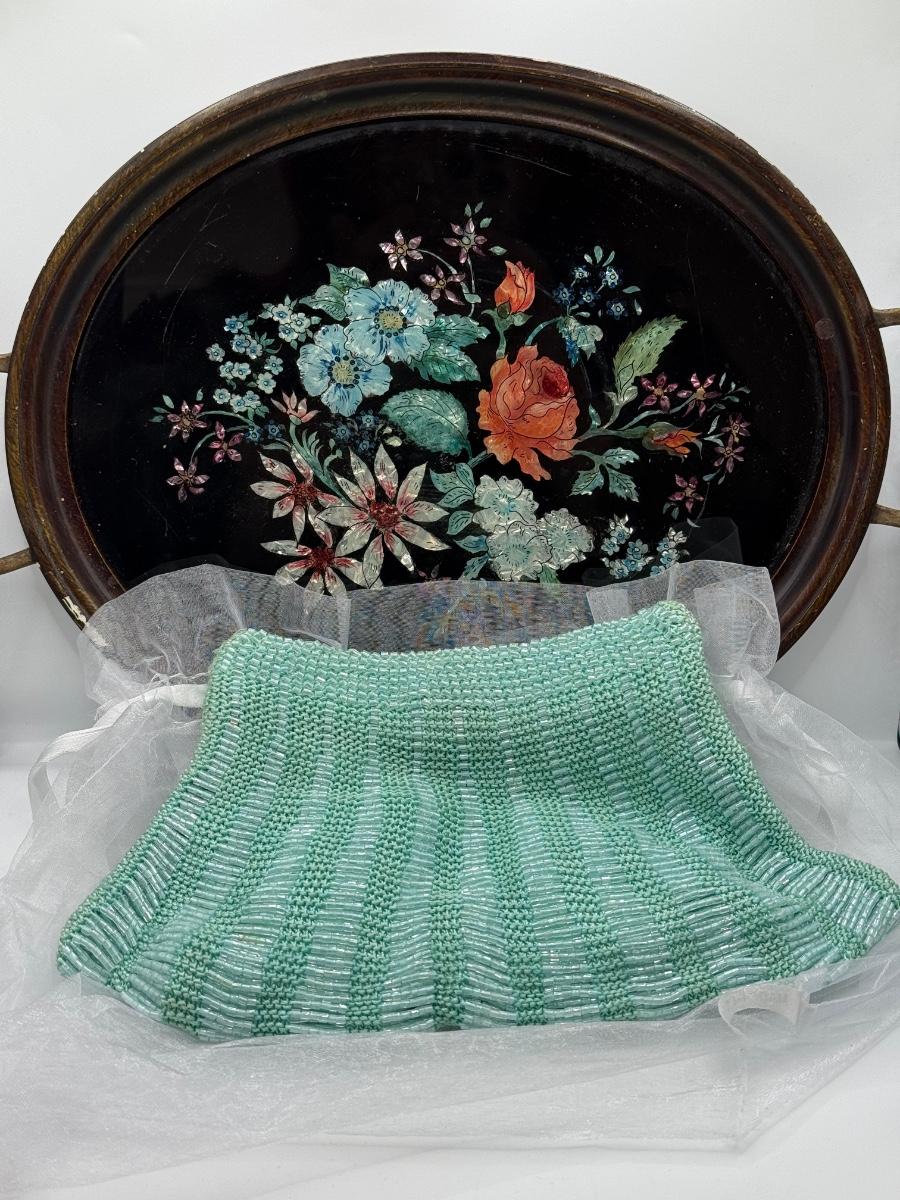 LOT 106: Beautiful Inlaid Laquered Tray w/ Vintage Teal Beaded Clutch