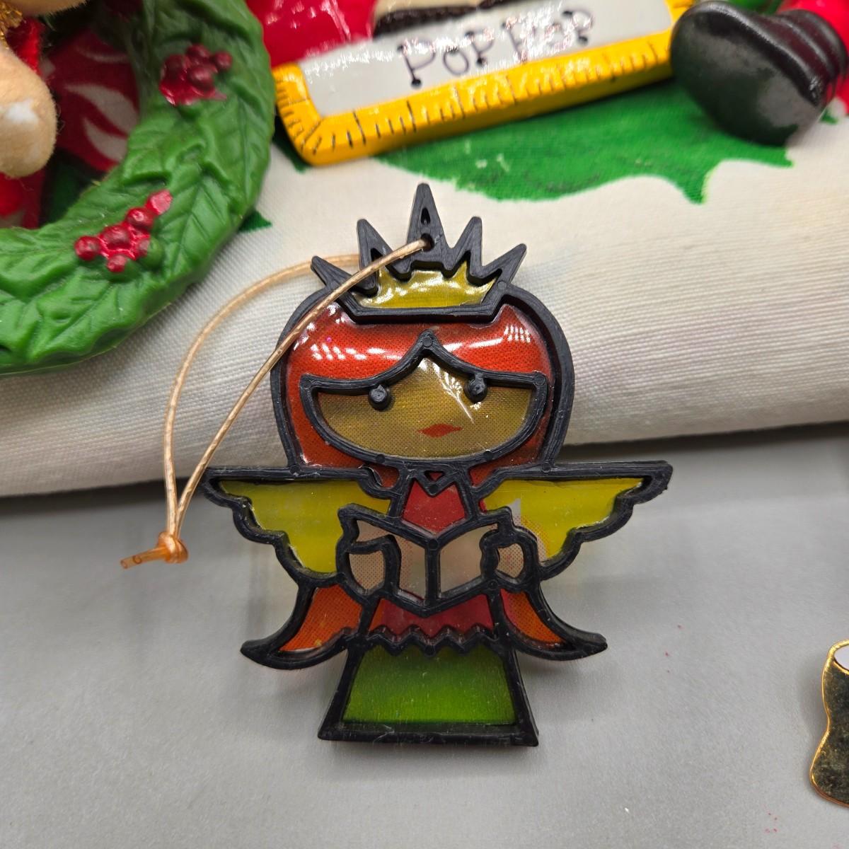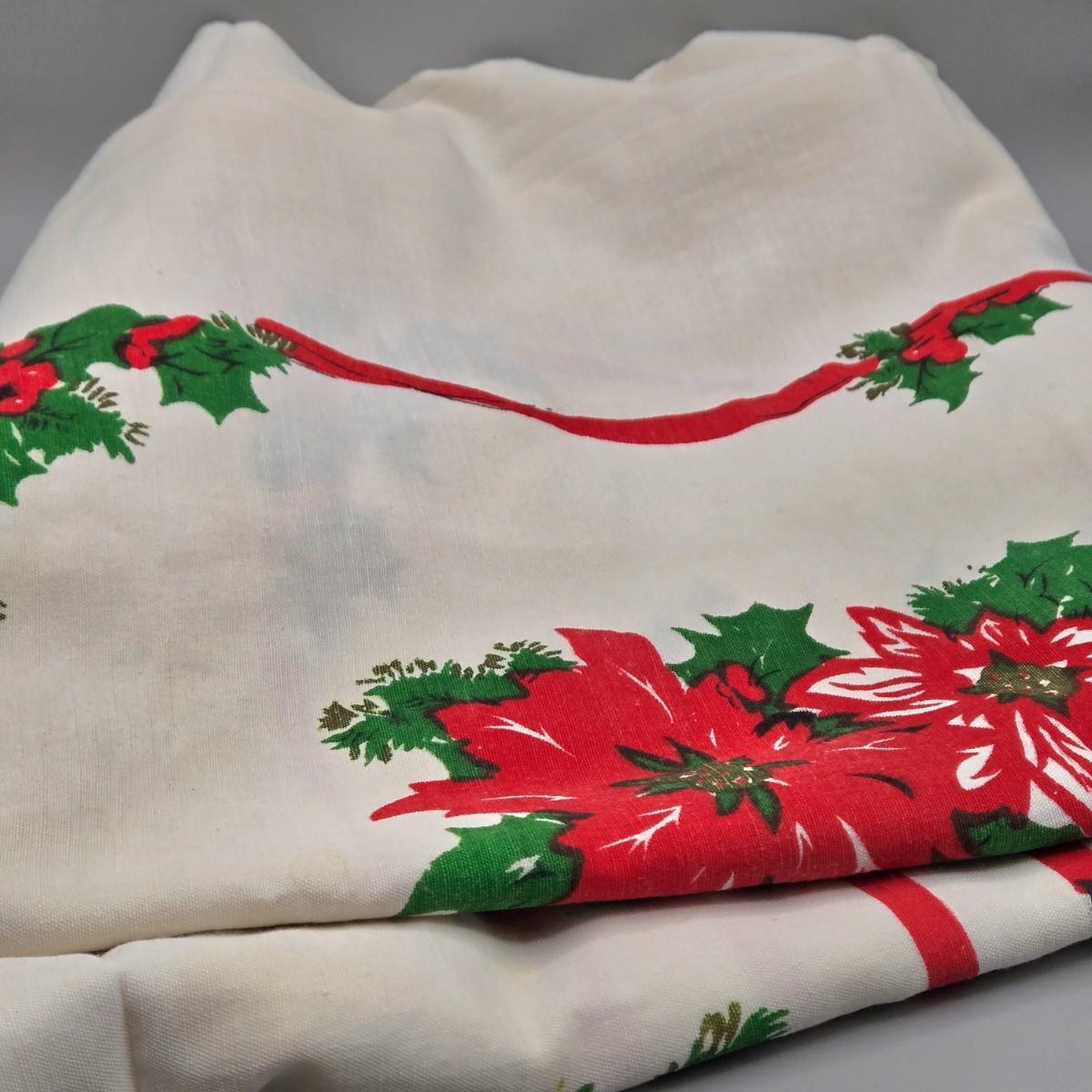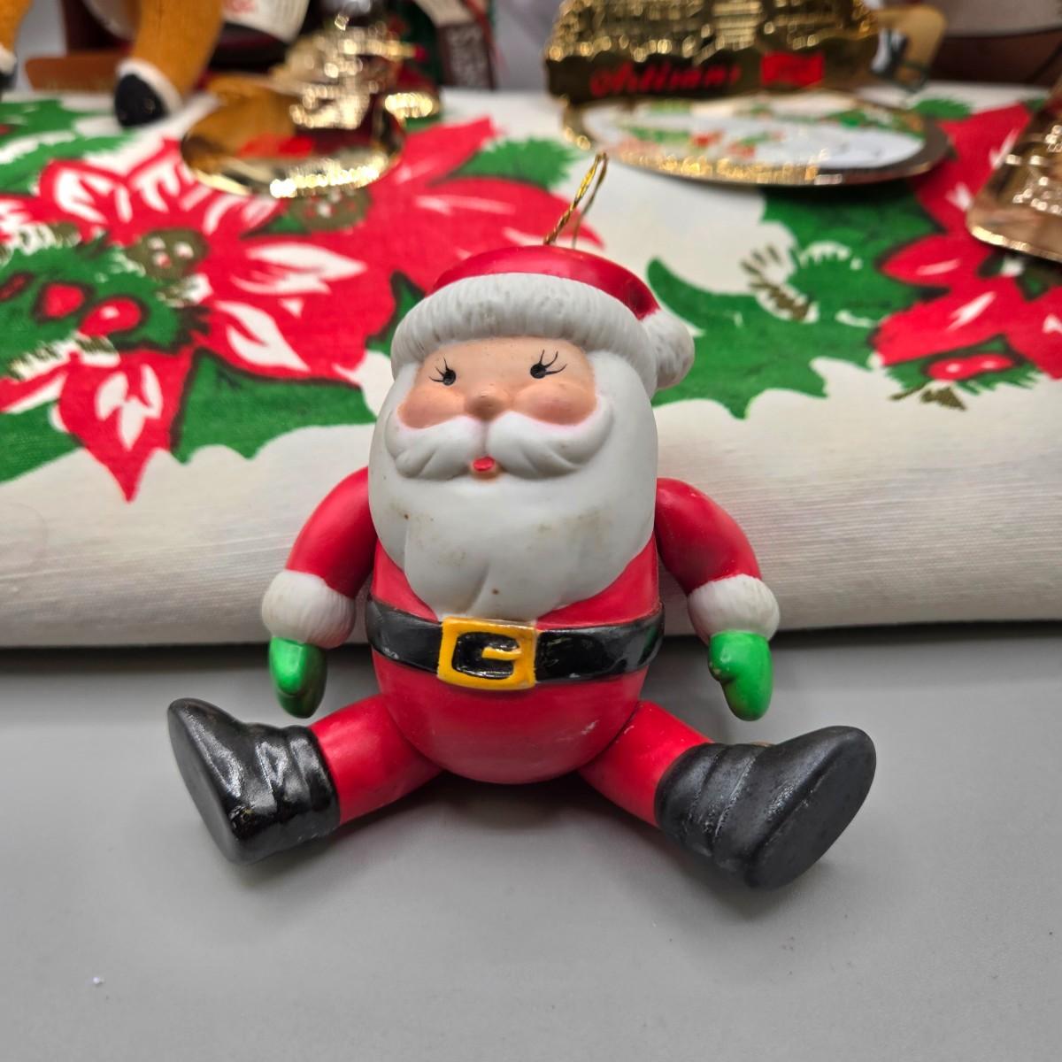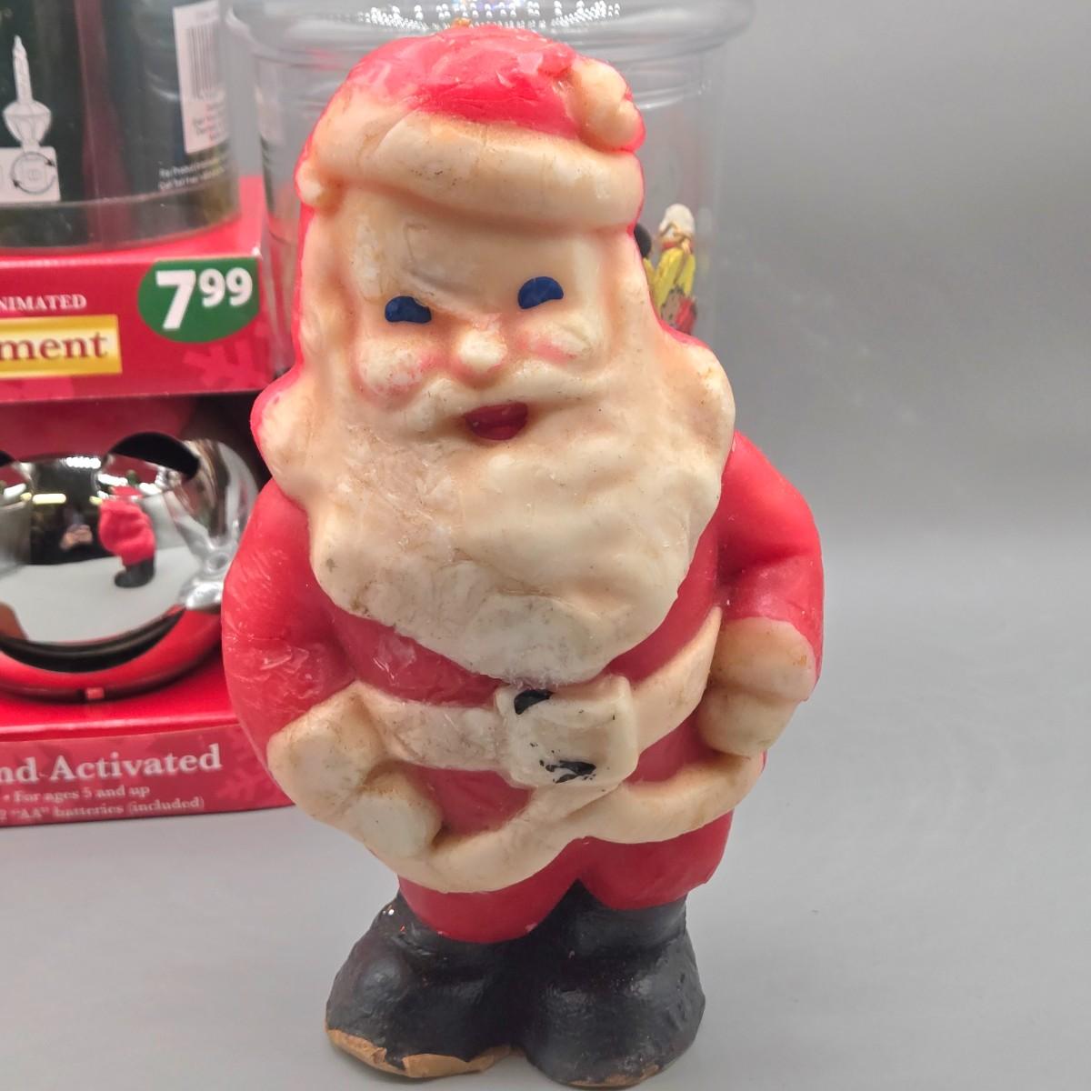 LOT 140: All Things Christmas, Including Glass Jar Filled with 1970s Wooden Christmas Ornaments, Vintage Santa Candle, 56x52 Tablecloth, and More