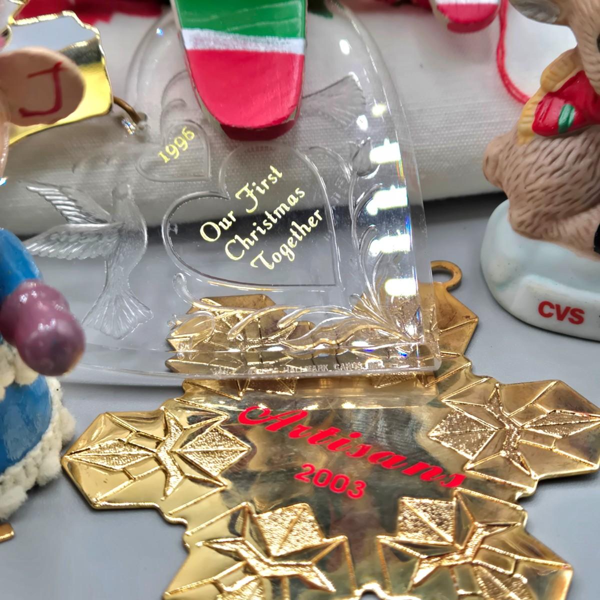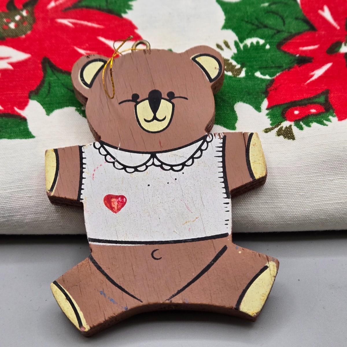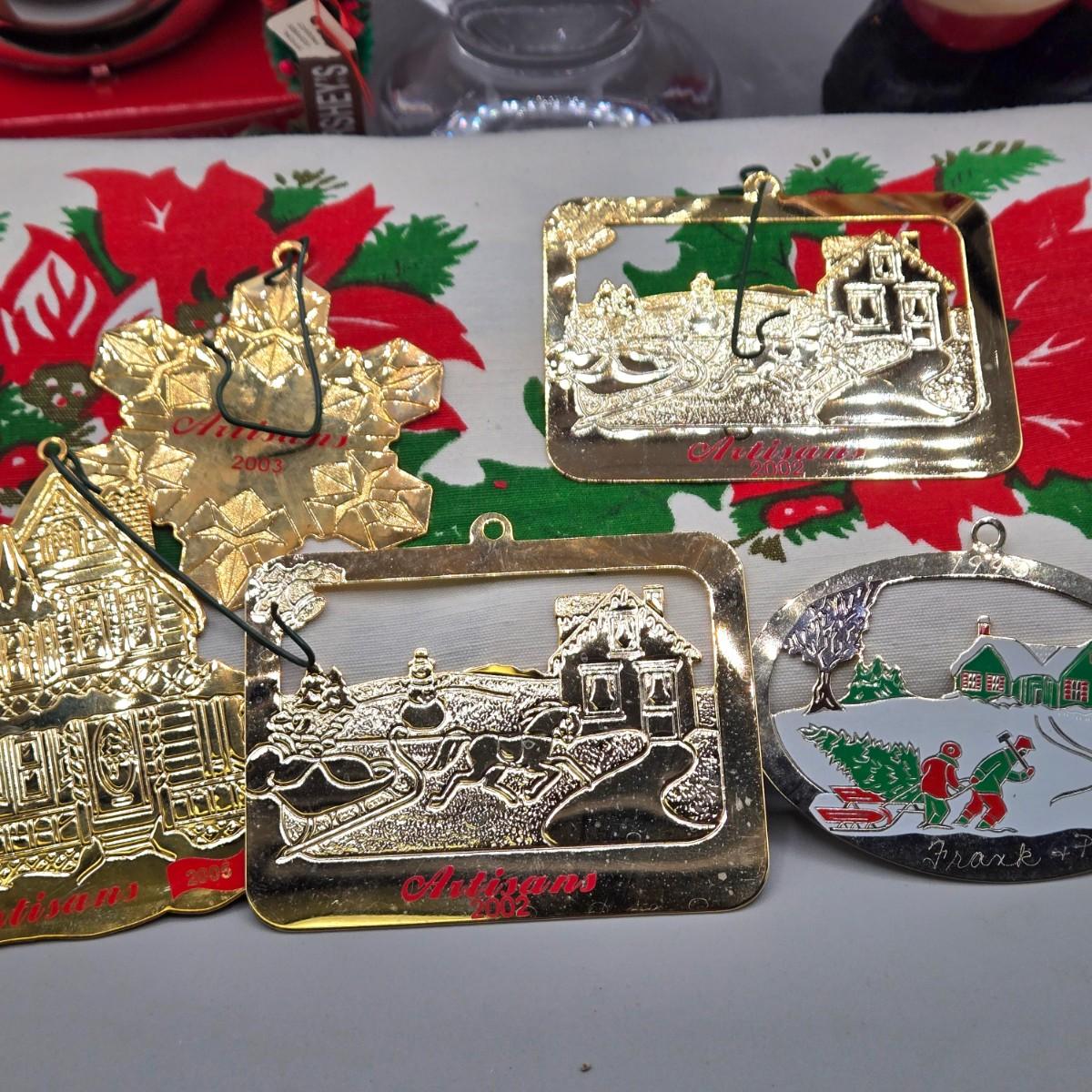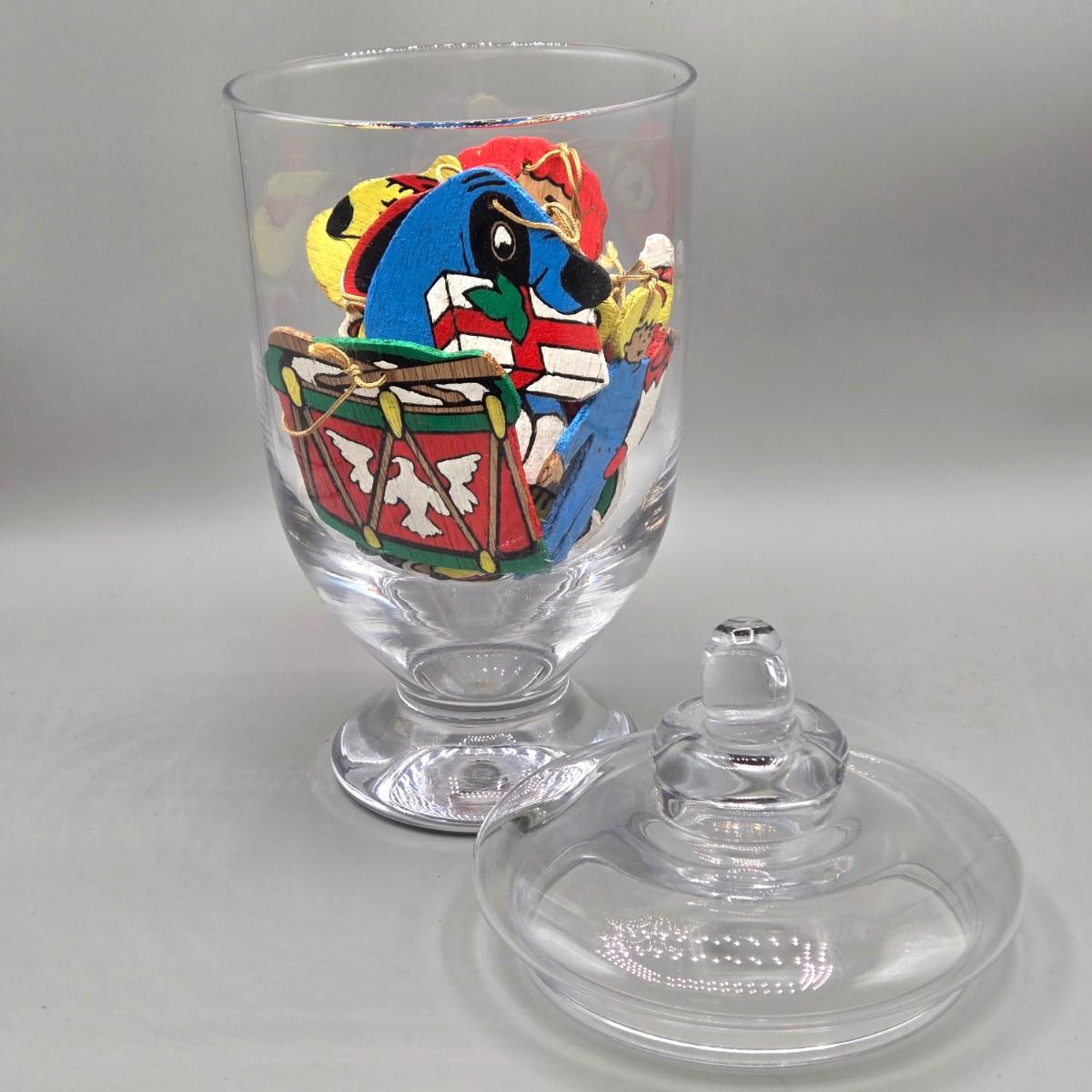 LOT 140: All Things Christmas, Including Glass Jar Filled with 1970s Wooden Christmas Ornaments, Vintage Santa Candle, 56x52 Tablecloth, and More