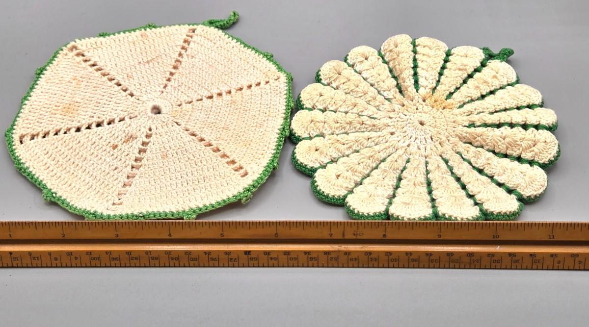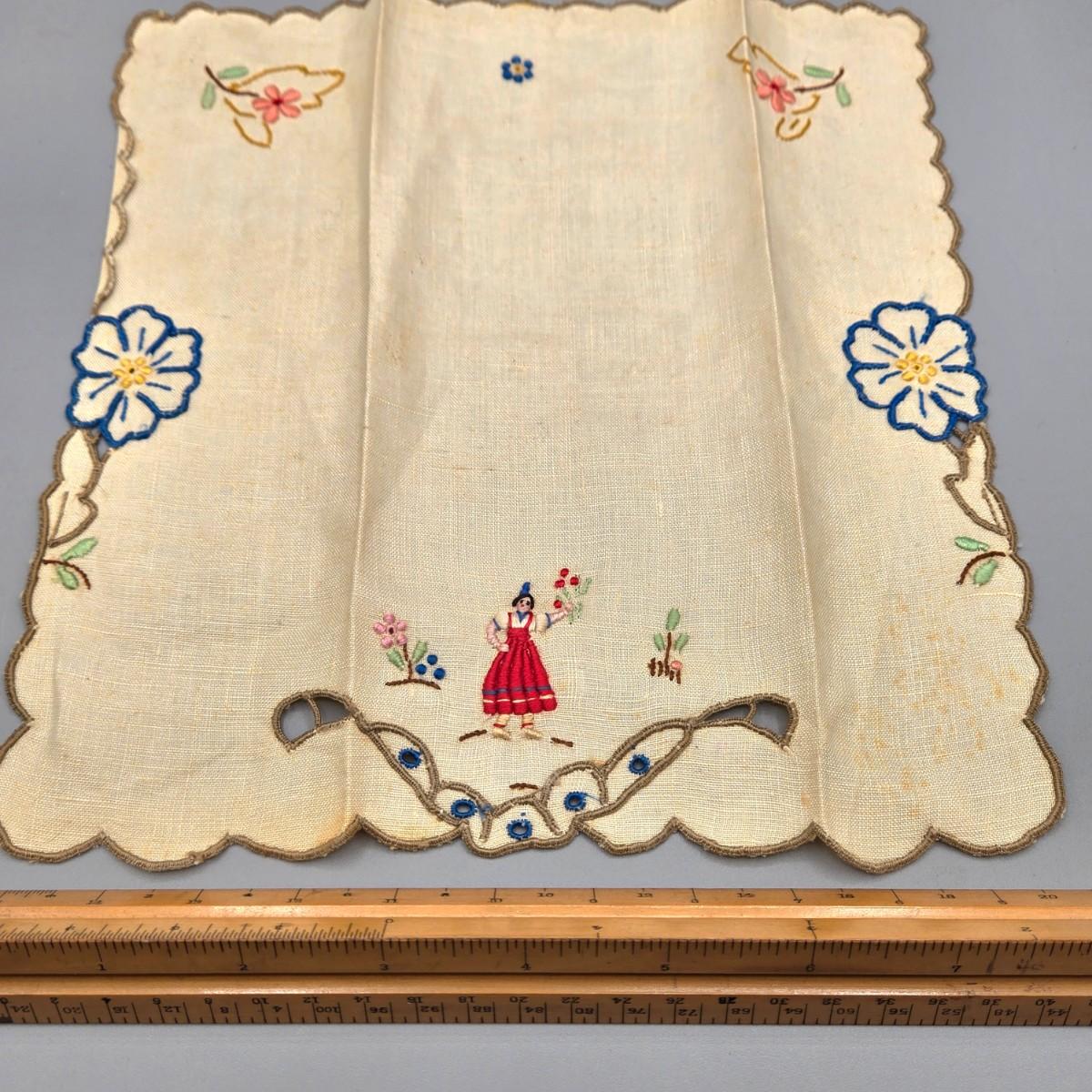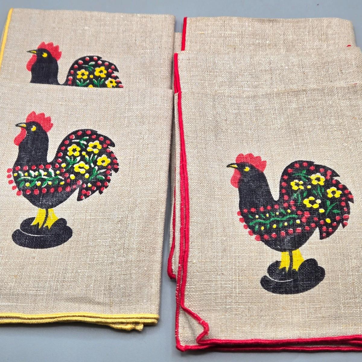 LOT 142: 5 Folk Art Rooster Napkins, 2 Crocheted Pot Holders, Ceramic Kissing Dutch Figurines, Vintage Figgjo Flint Norway Pitcher, and More