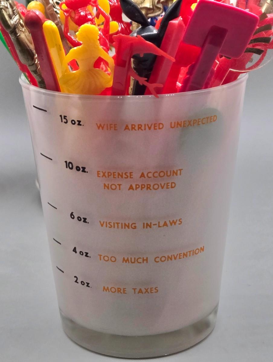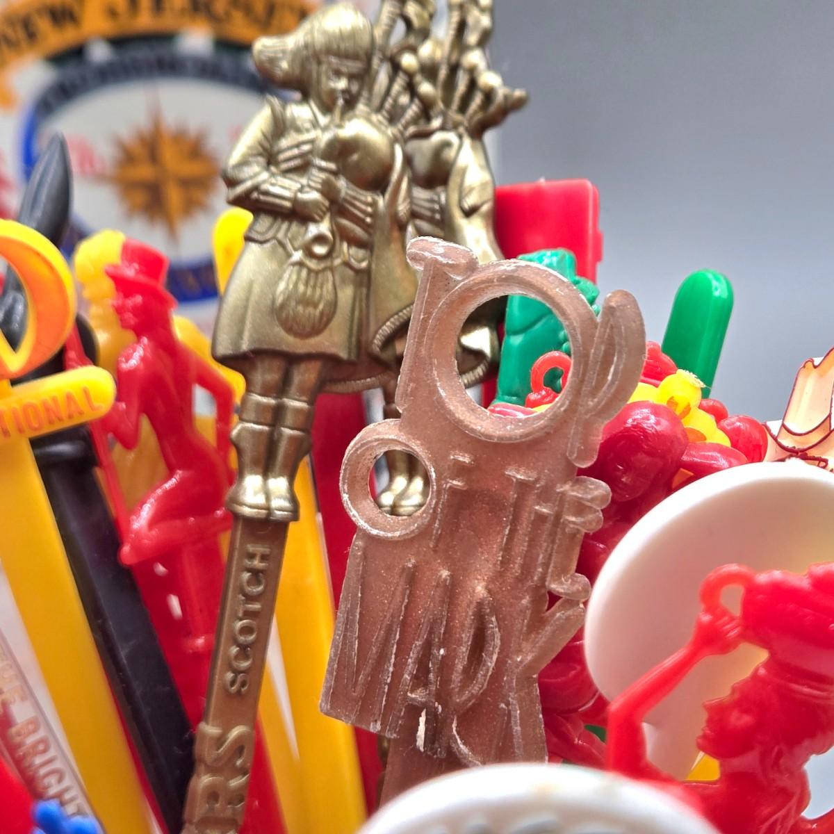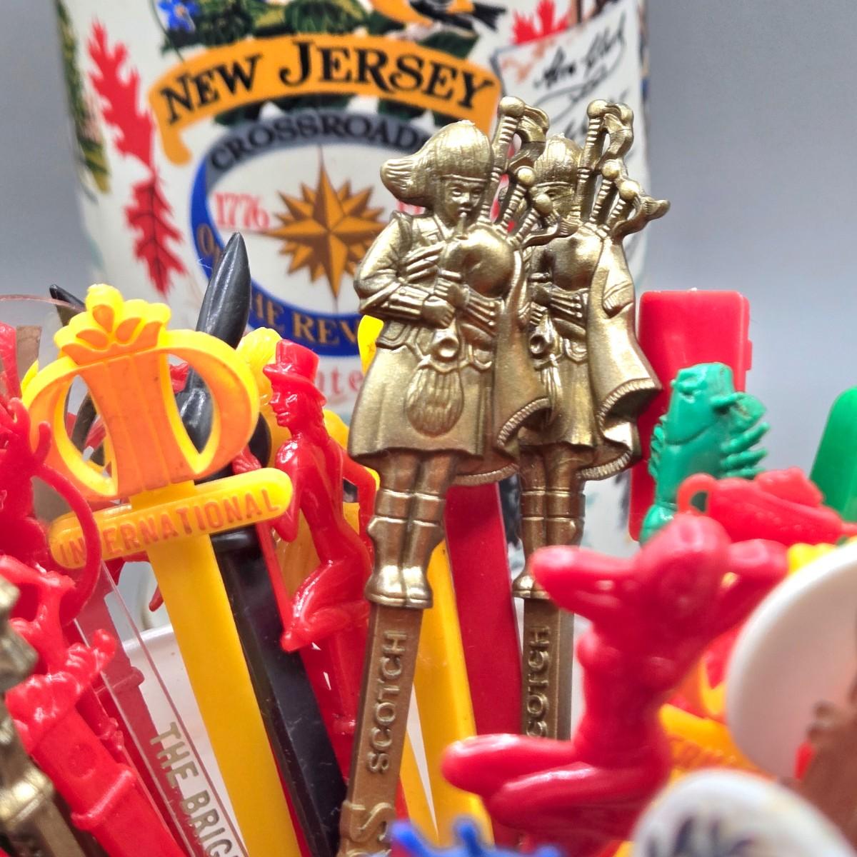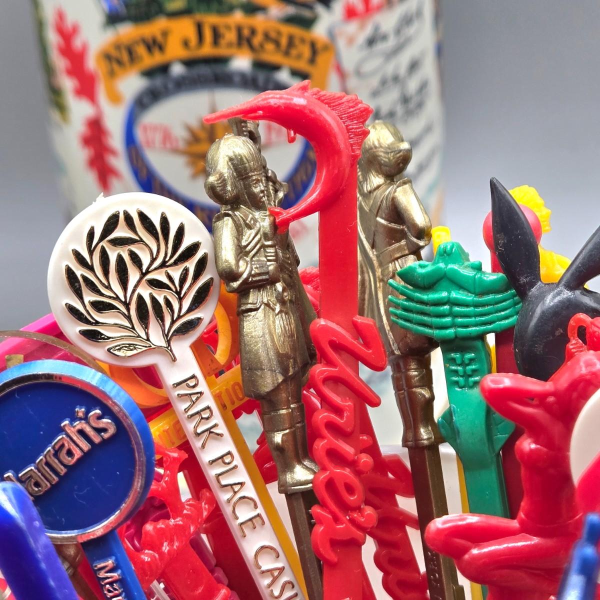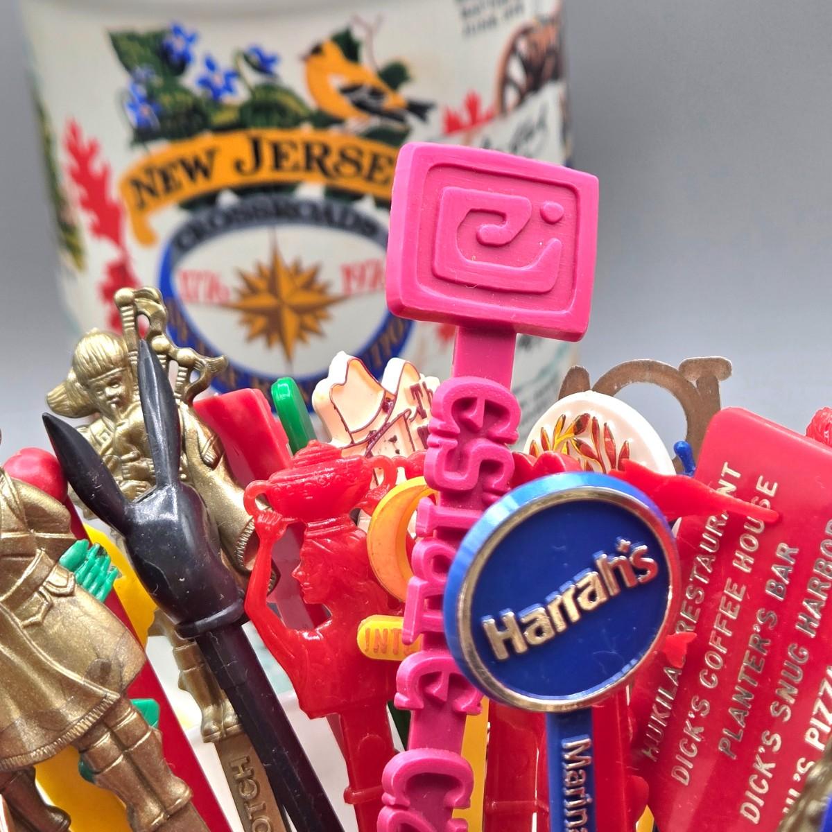LOT 143: Vintage Old Rip Van Winkle New Jersey Bicentennial Cumberland Porcelain Decanter, 1960's Tired Business Highball Glass, Variety of Plastic & Glass Cocktail Stirrers, and More