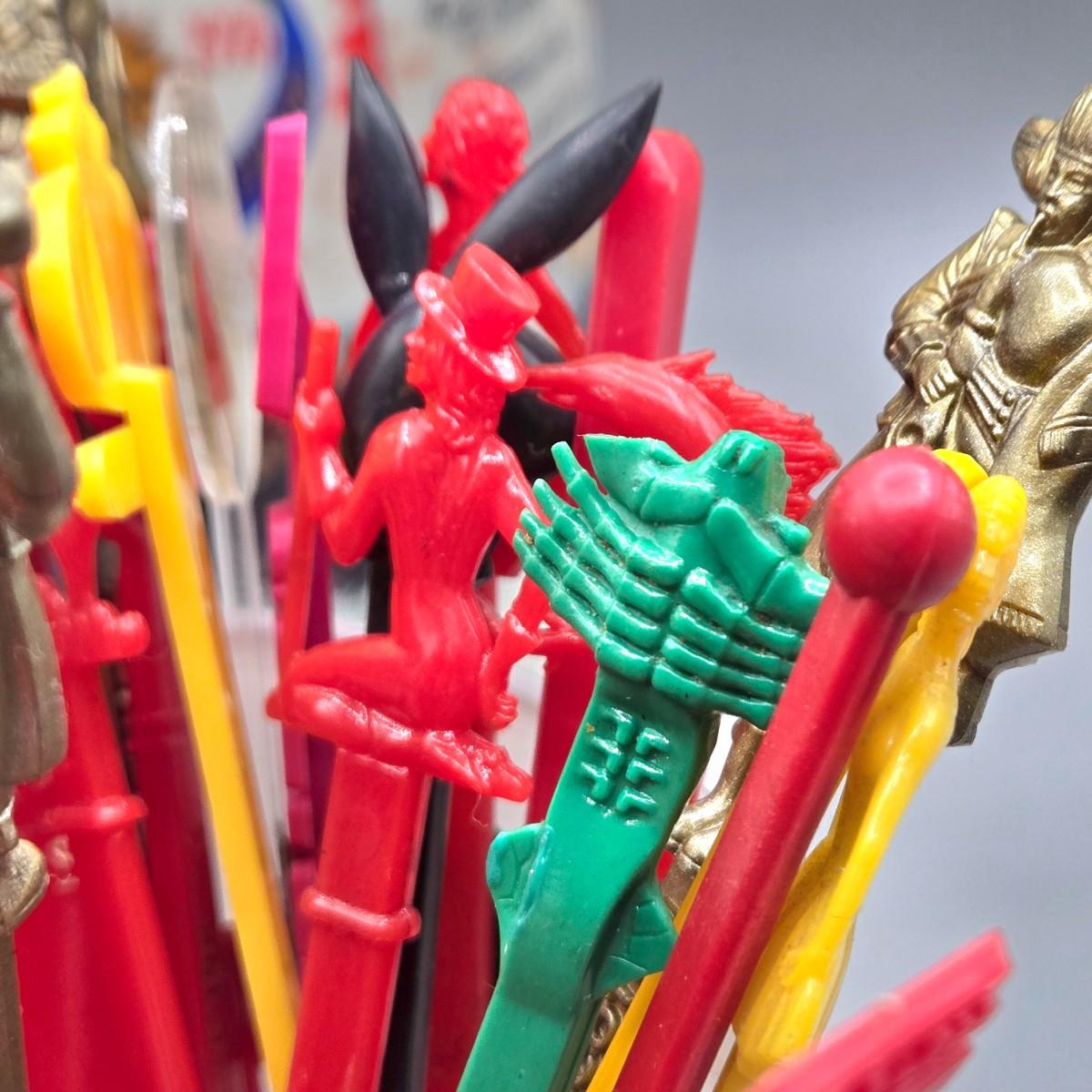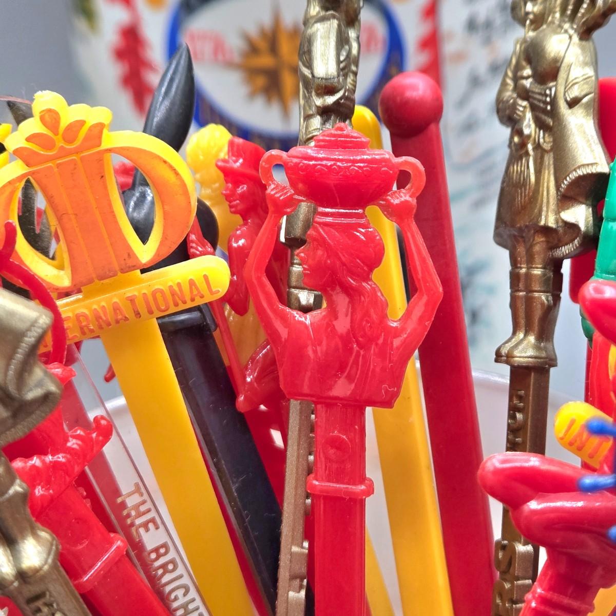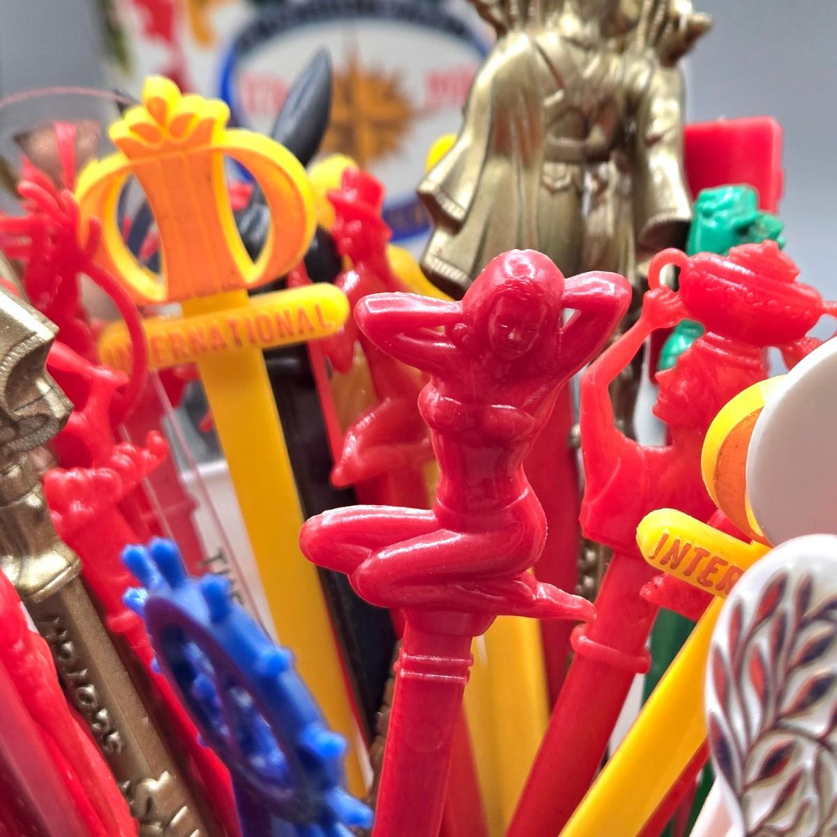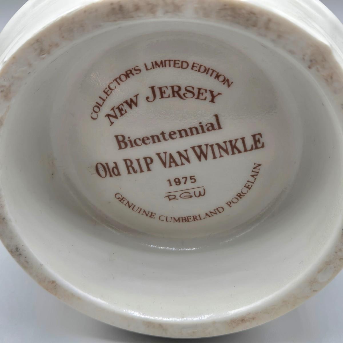 LOT 143: Vintage Old Rip Van Winkle New Jersey Bicentennial Cumberland Porcelain Decanter, 1960's Tired Business Highball Glass, Variety of Plastic & Glass Cocktail Stirrers, and More