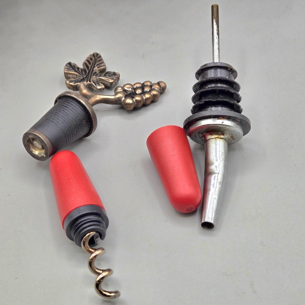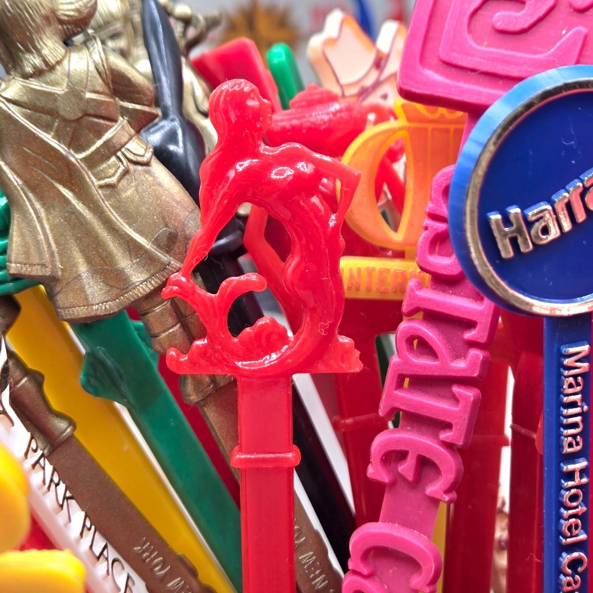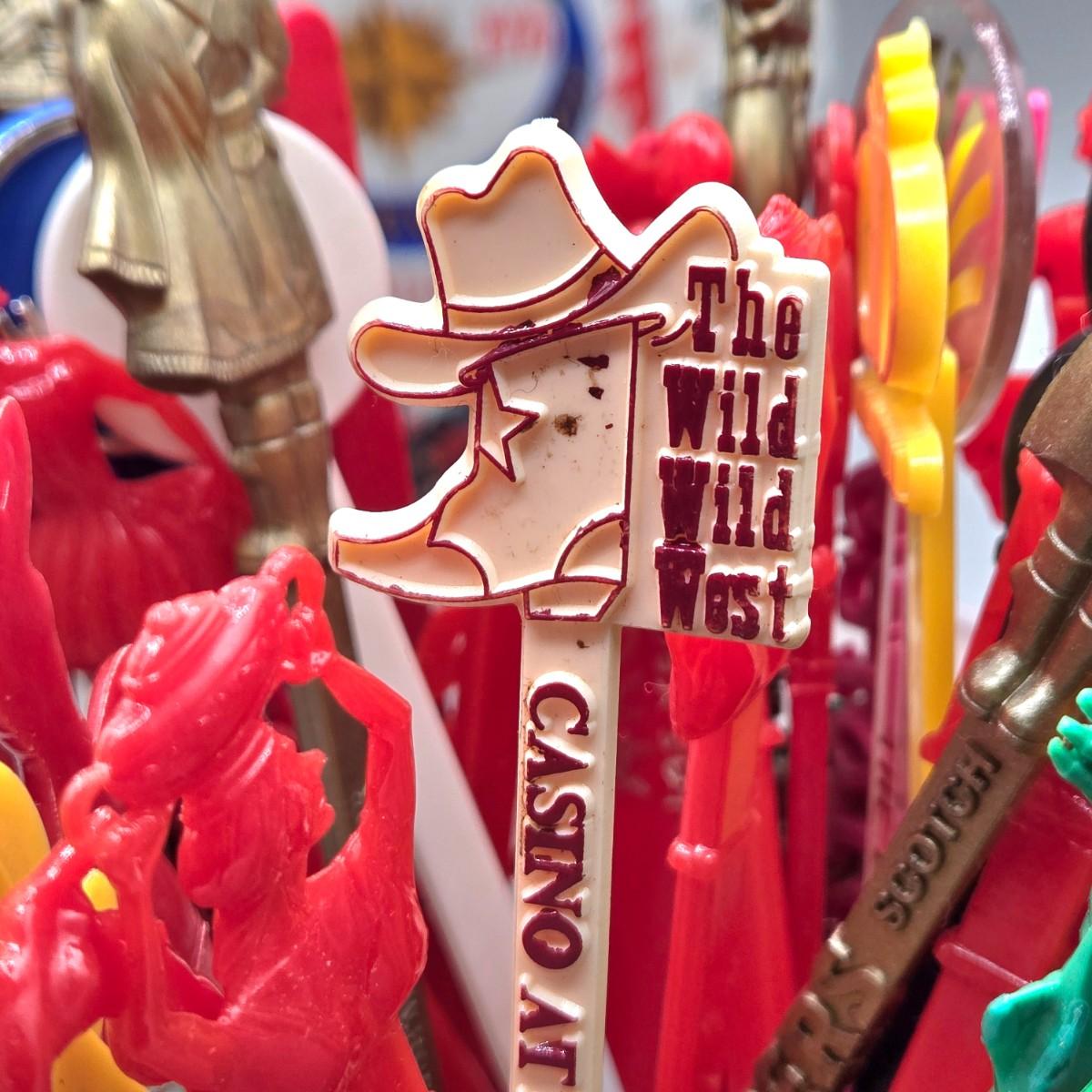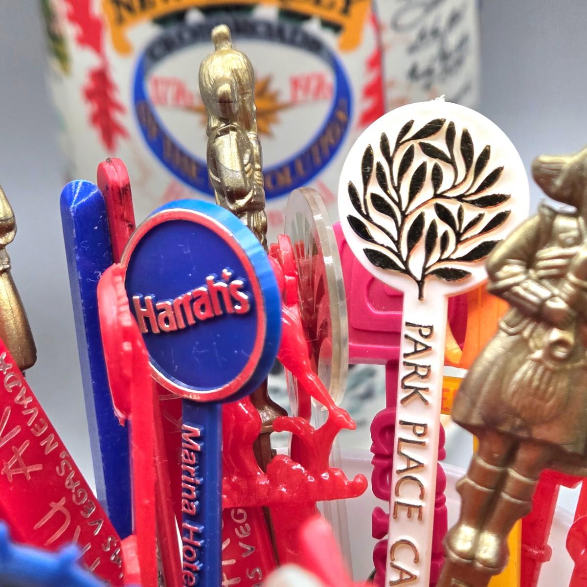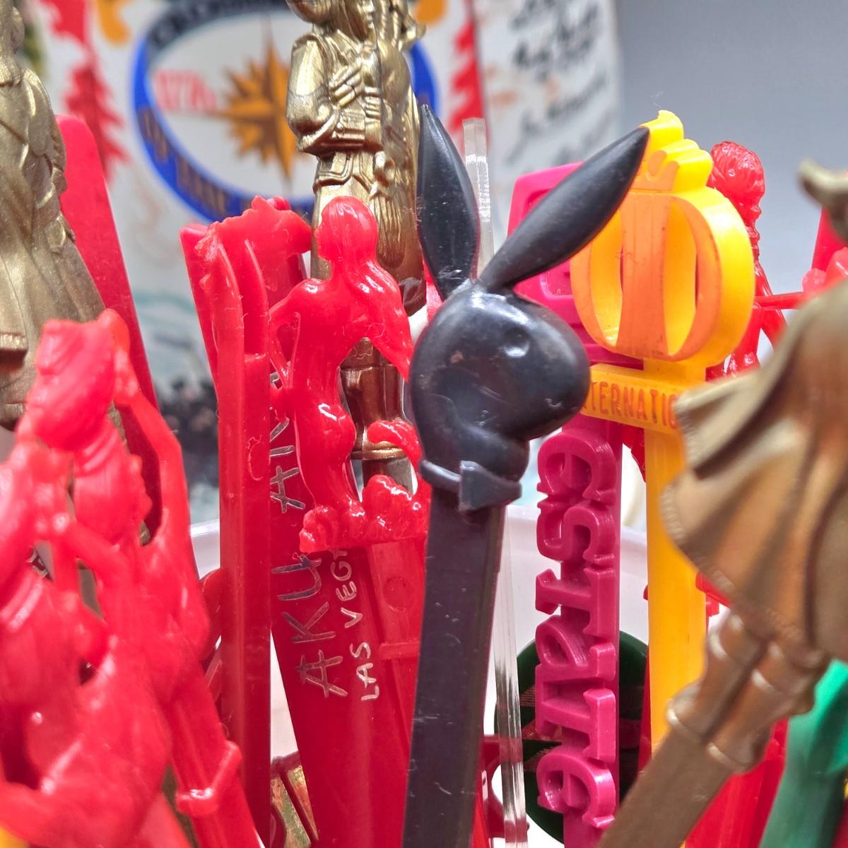 LOT 143: Vintage Old Rip Van Winkle New Jersey Bicentennial Cumberland Porcelain Decanter, 1960's Tired Business Highball Glass, Variety of Plastic & Glass Cocktail Stirrers, and More