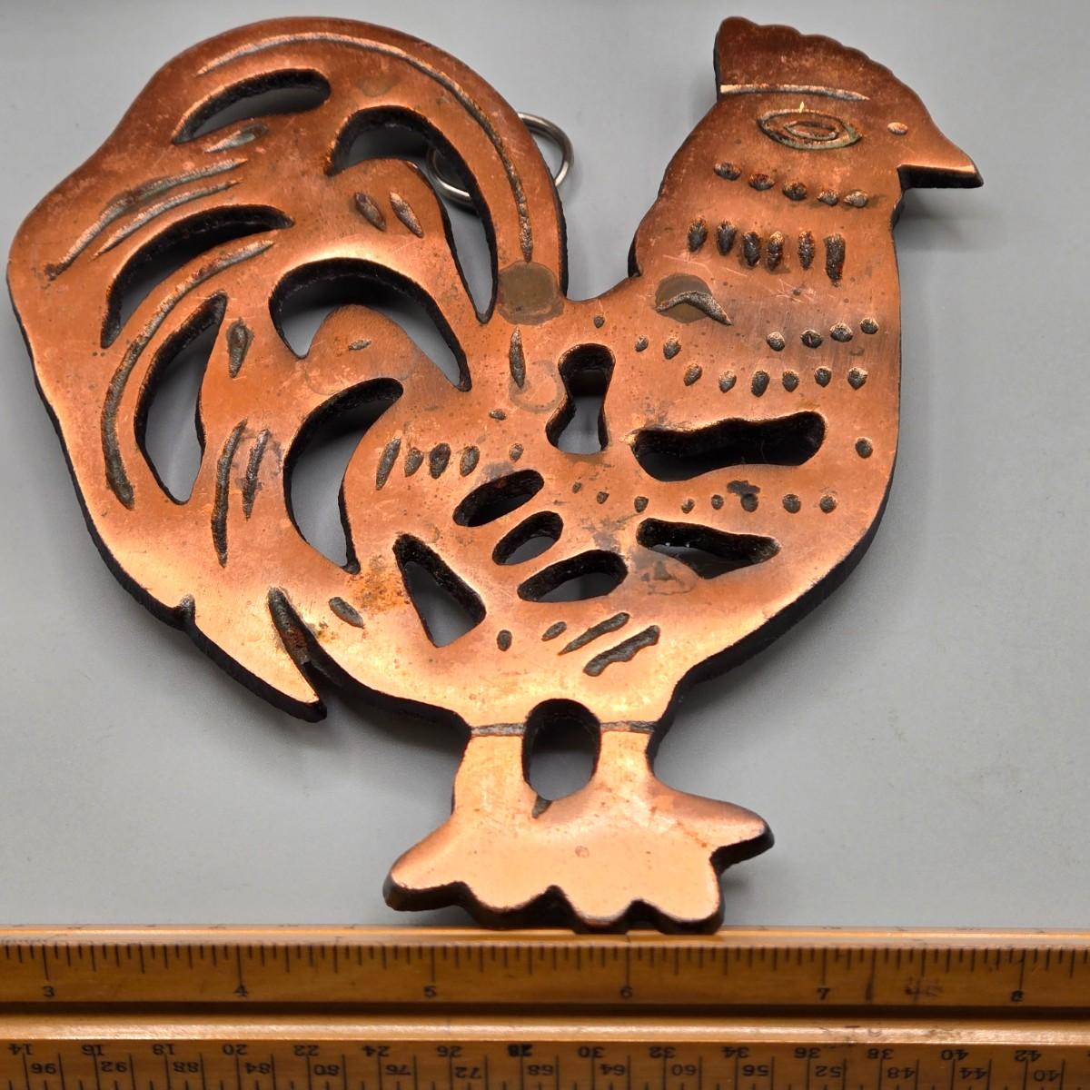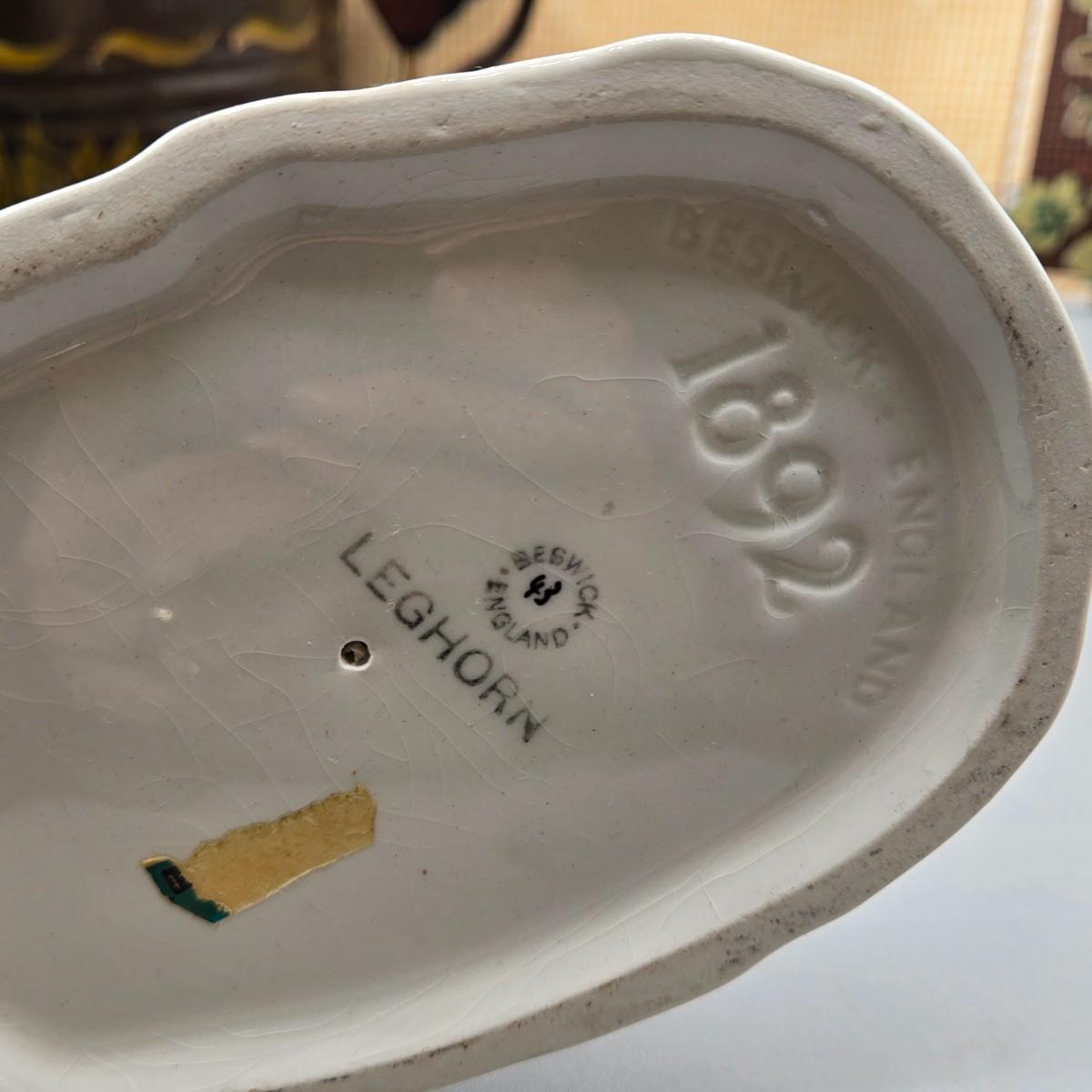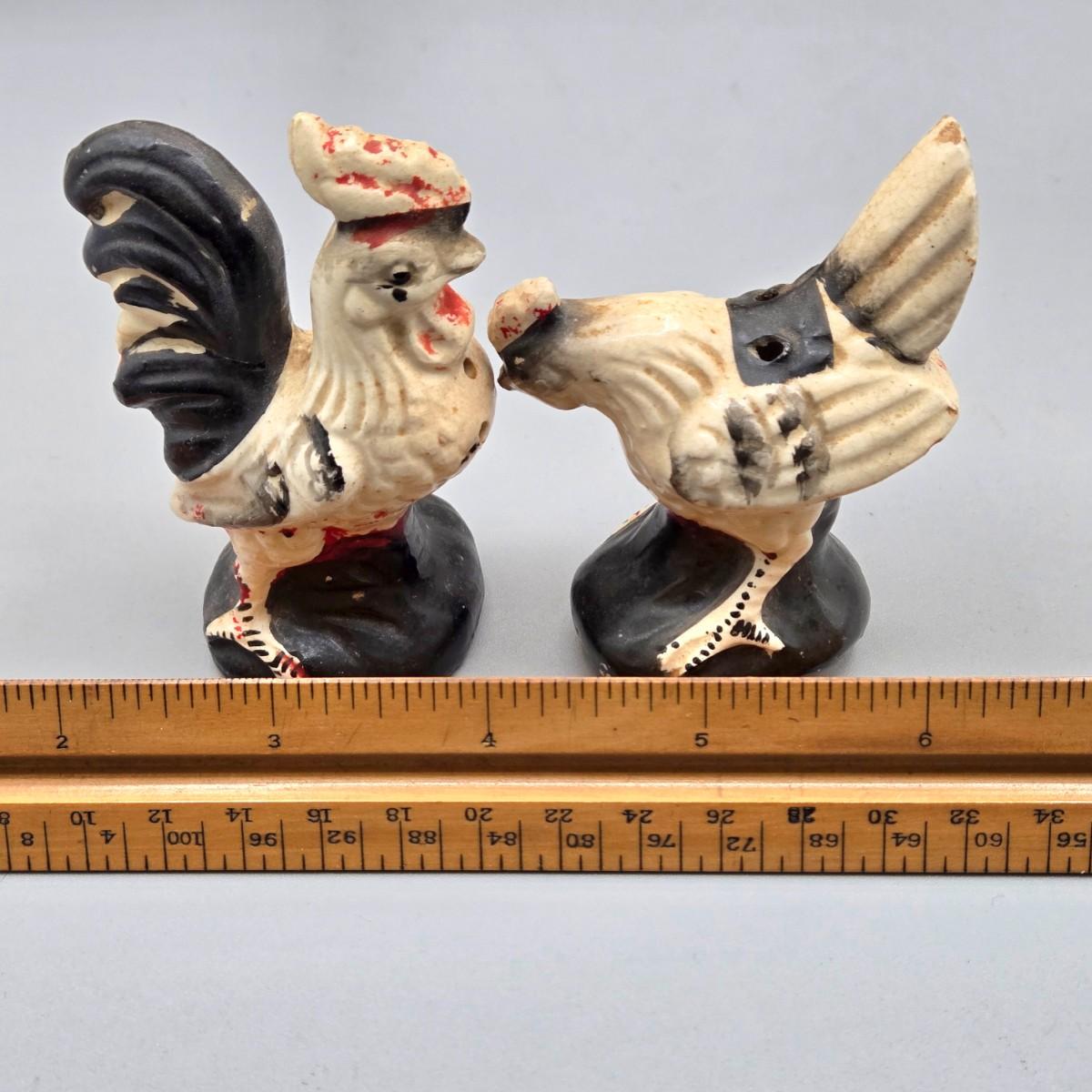 LOT 145: Vintage Terra Cotta Bread Warming Stone, Rooster Trivet, Vintage Rooster and Hen Ceramic Salt and Pepper Shakers, Beswick Figure of a Leghorn Cockerel, and More