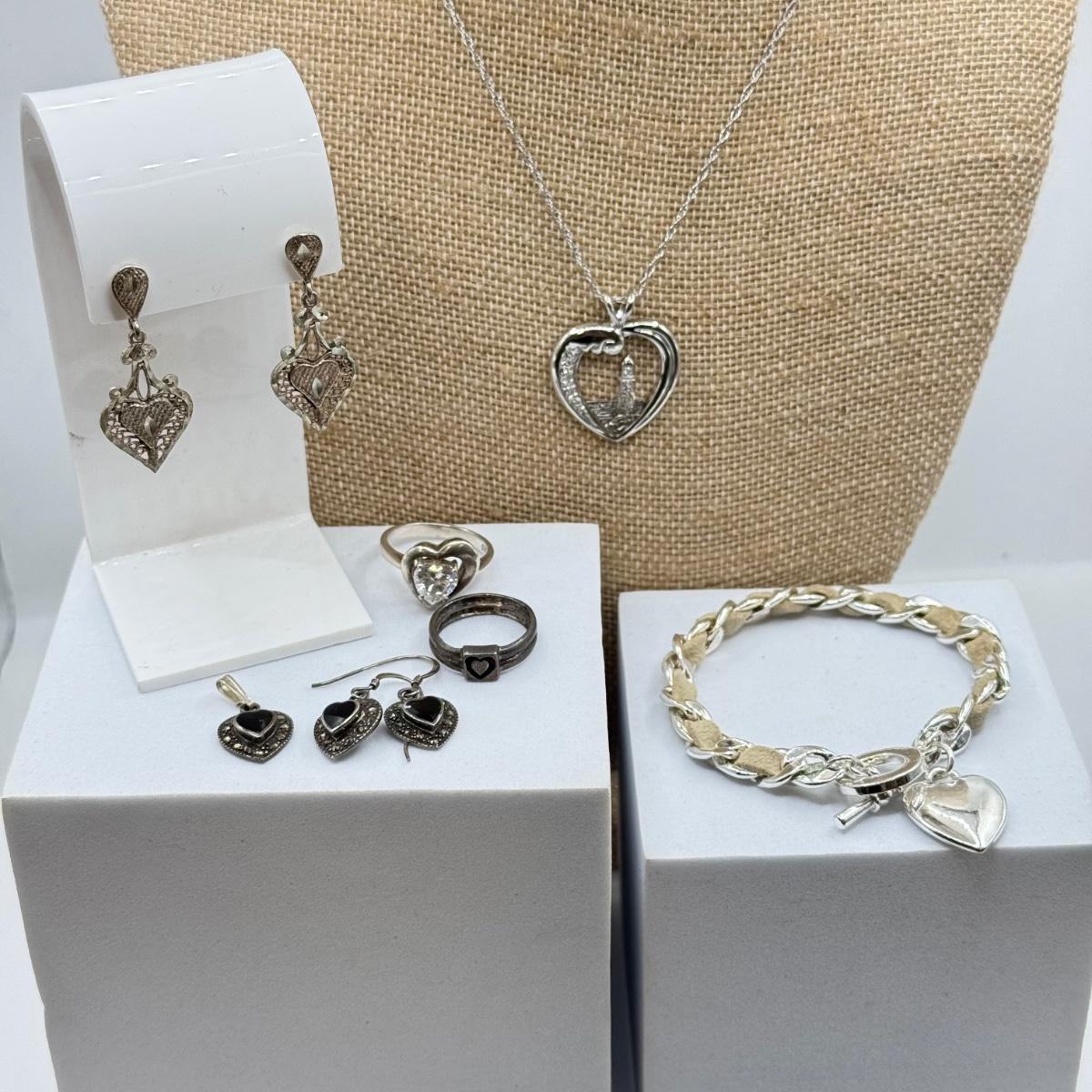 LOT 203: Collection of Mostly Sterling Heart Jewelry (25.3g)