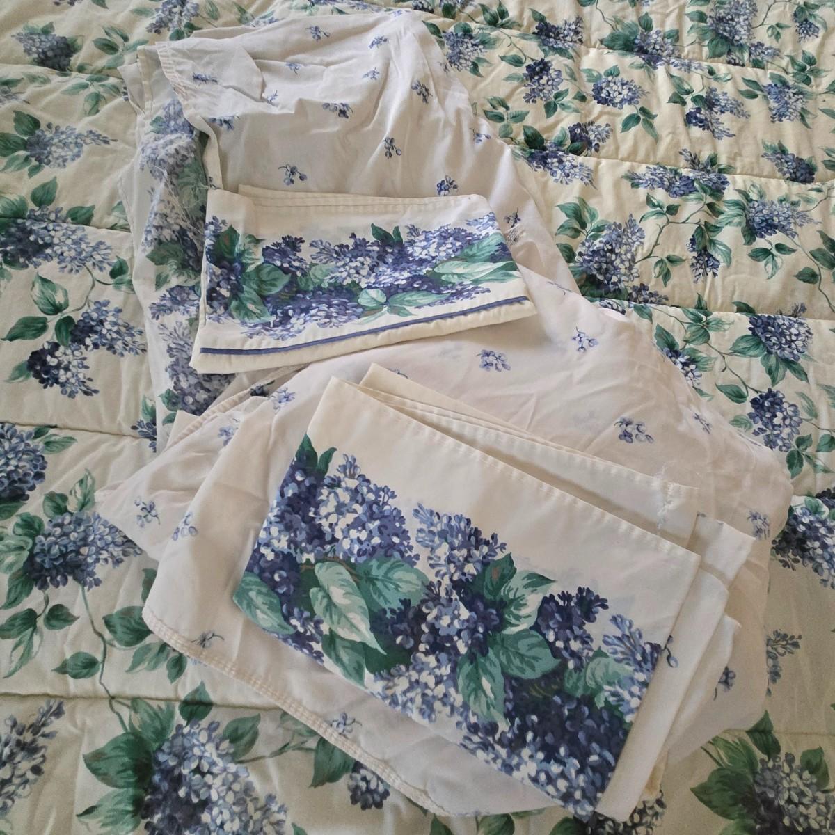 LOT 136: Blue/Periwinkle Flowered Comforter, Matching Pillow Shams, and Full Size Sheet Set