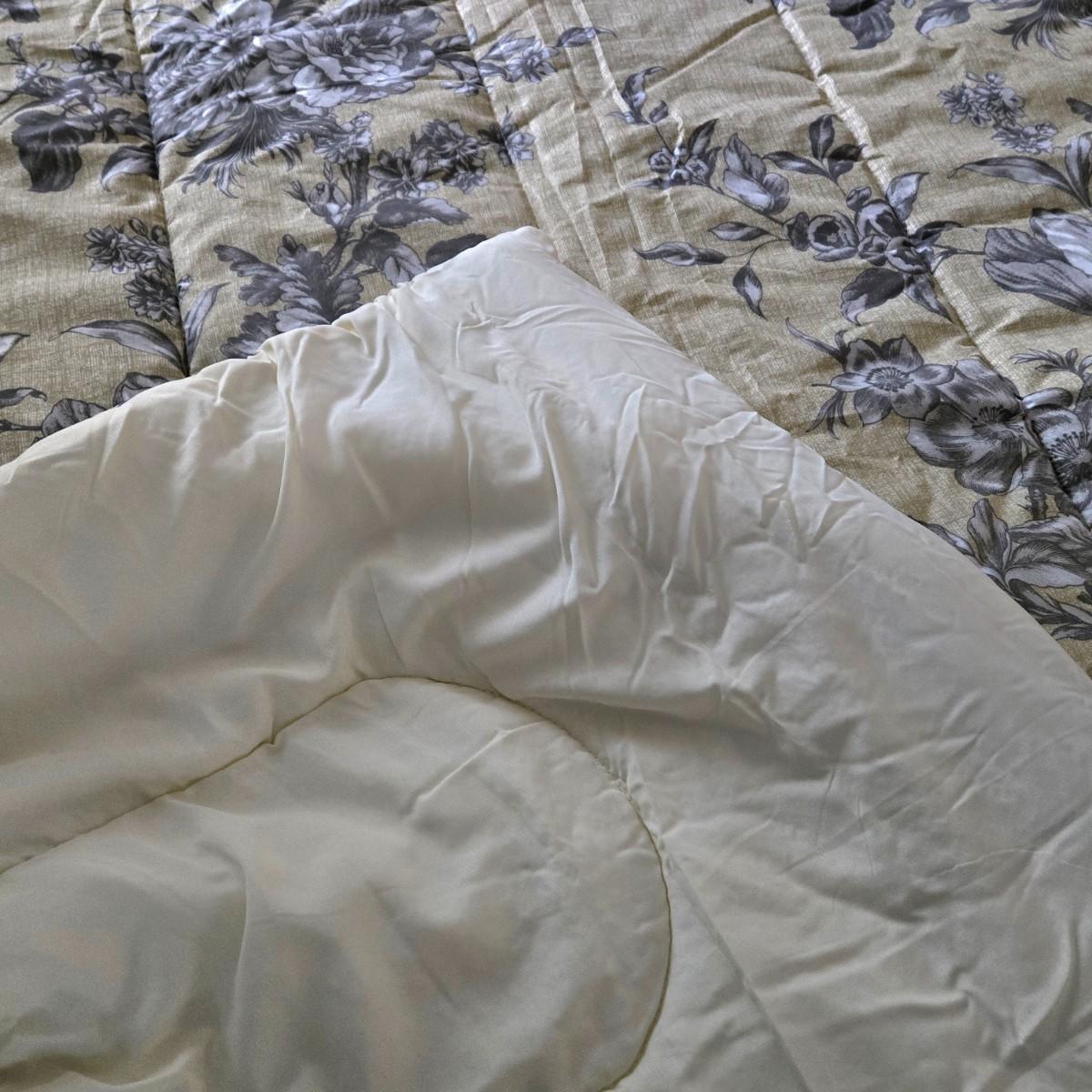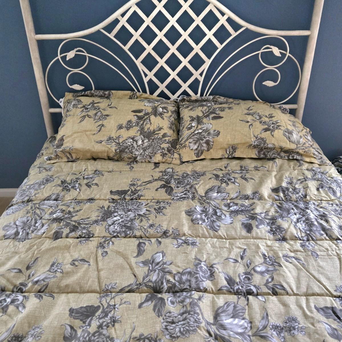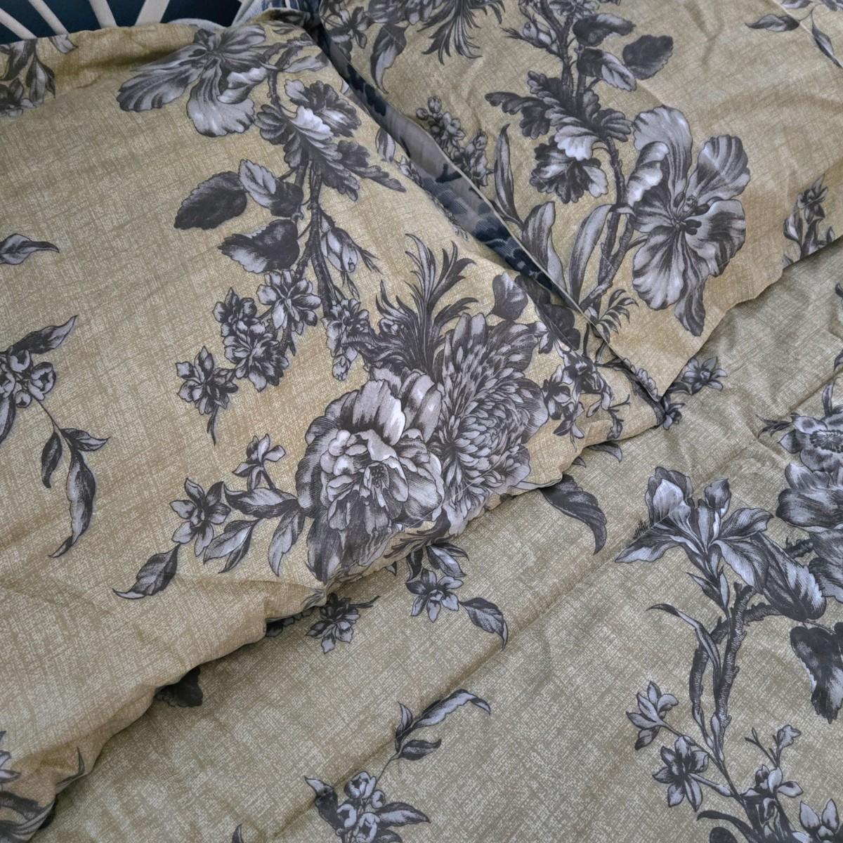 LOT 137: Gold-tone with Grey Flower Print Comforter with Matching Pillow Shams