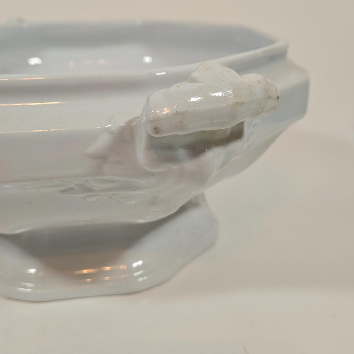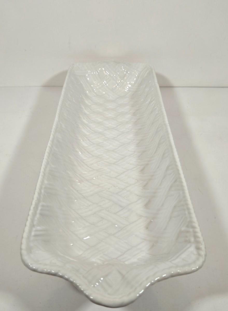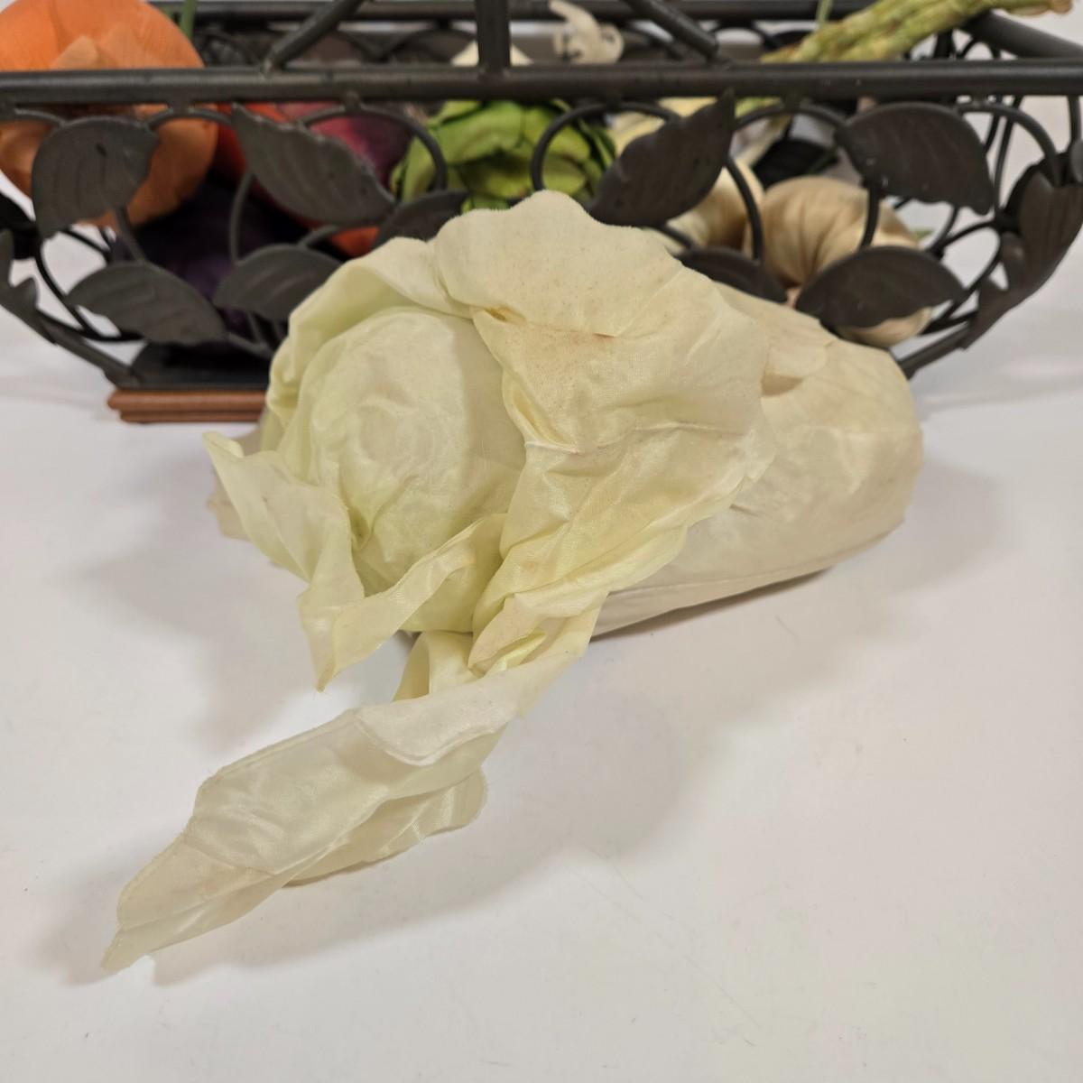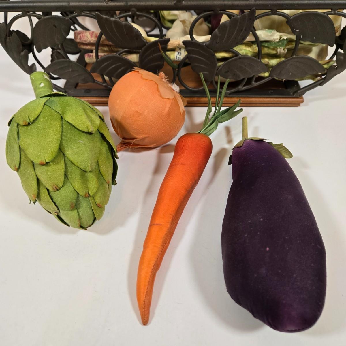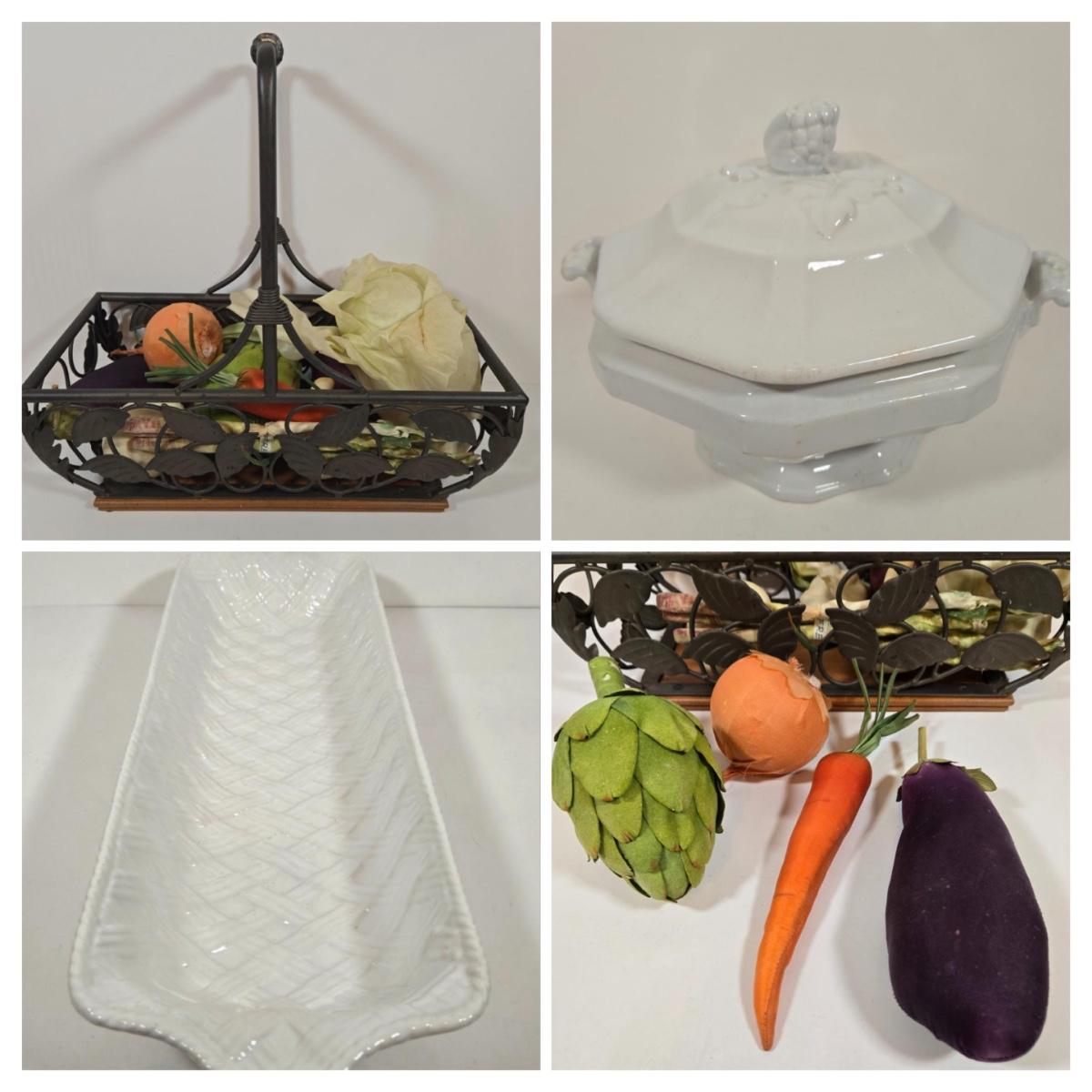 LOT 157: Faux Vegetables in Metal Basket, Ironstone Tureen, and Loucarte Portugal Ceramic Basket Weave Design Serving Platter