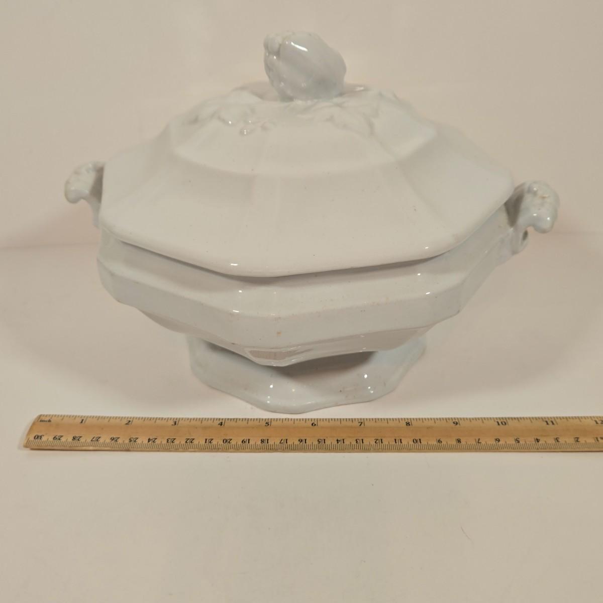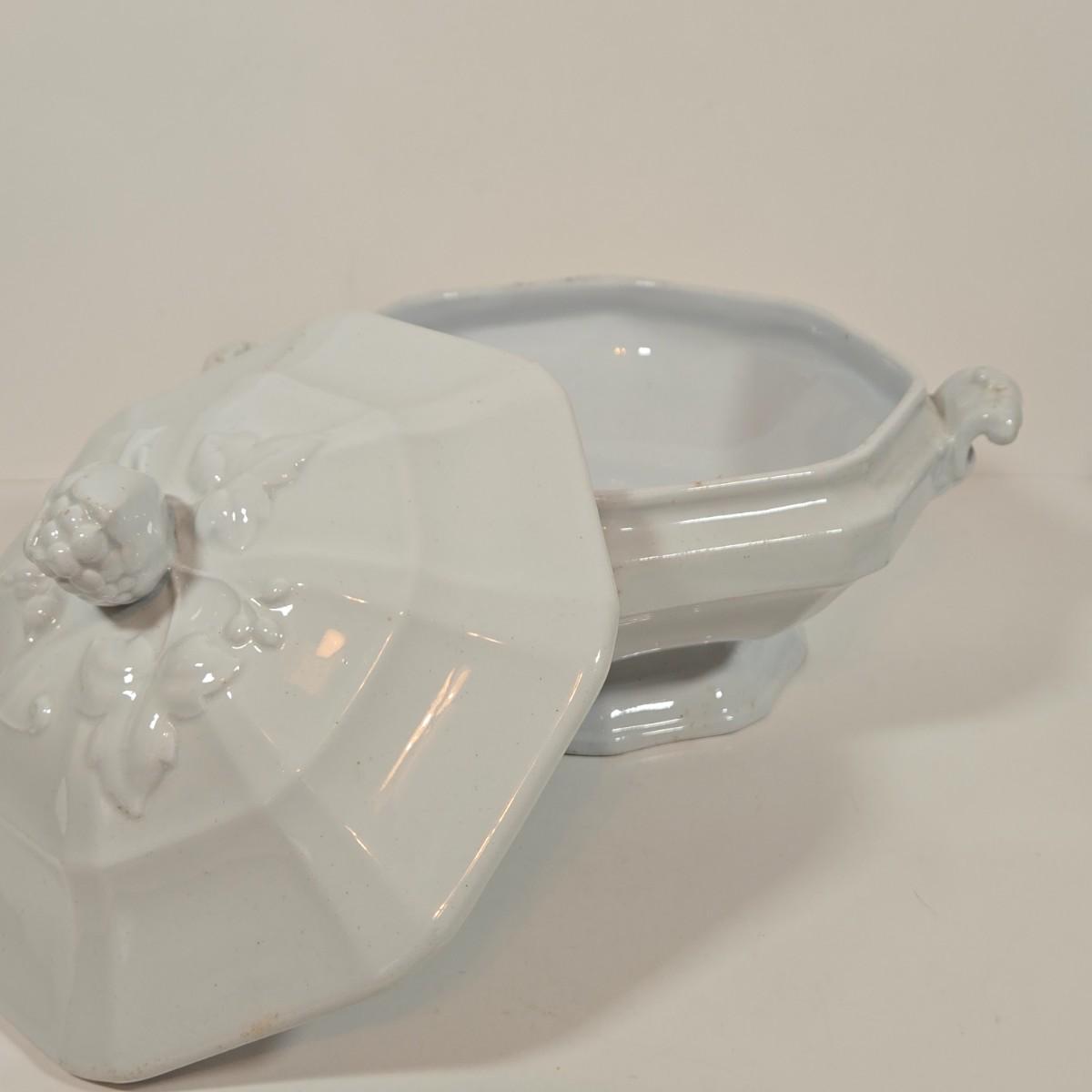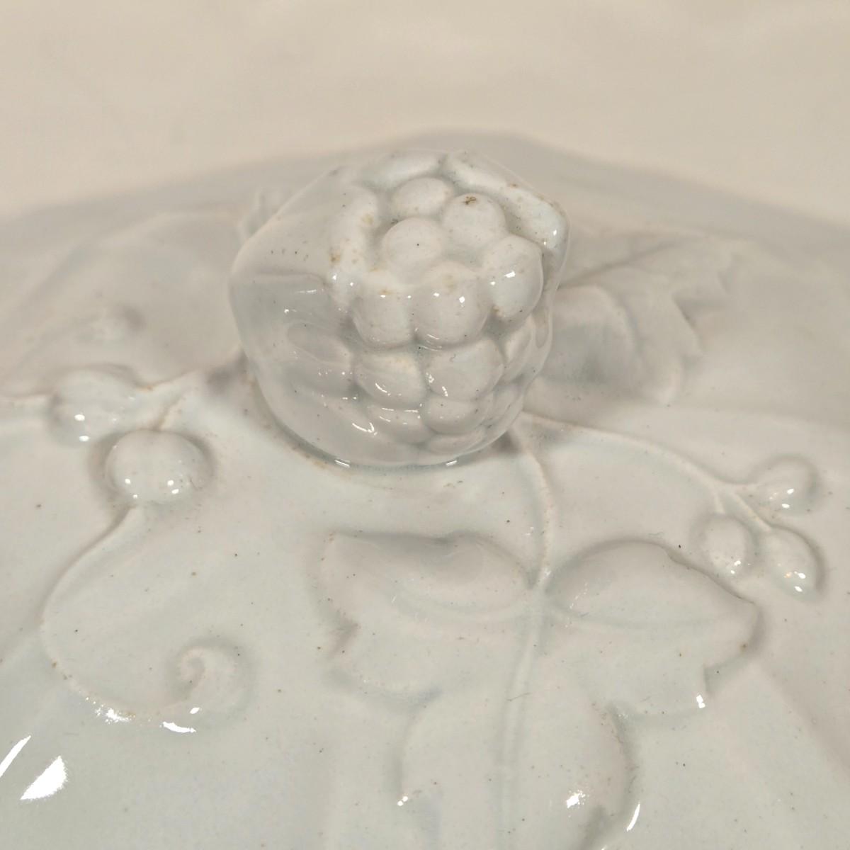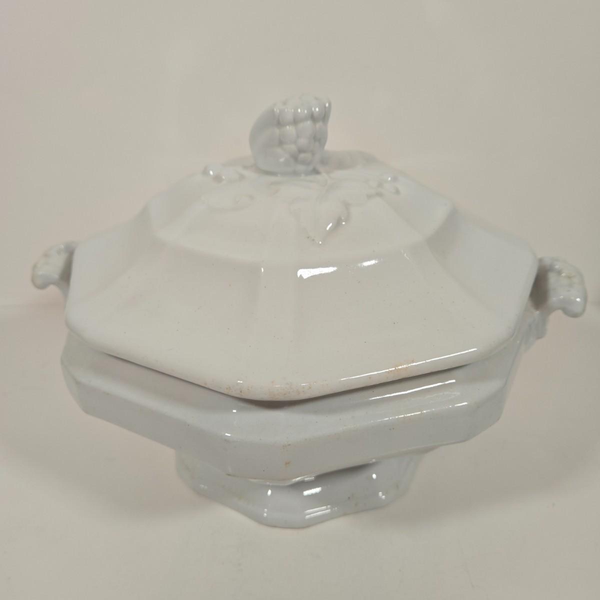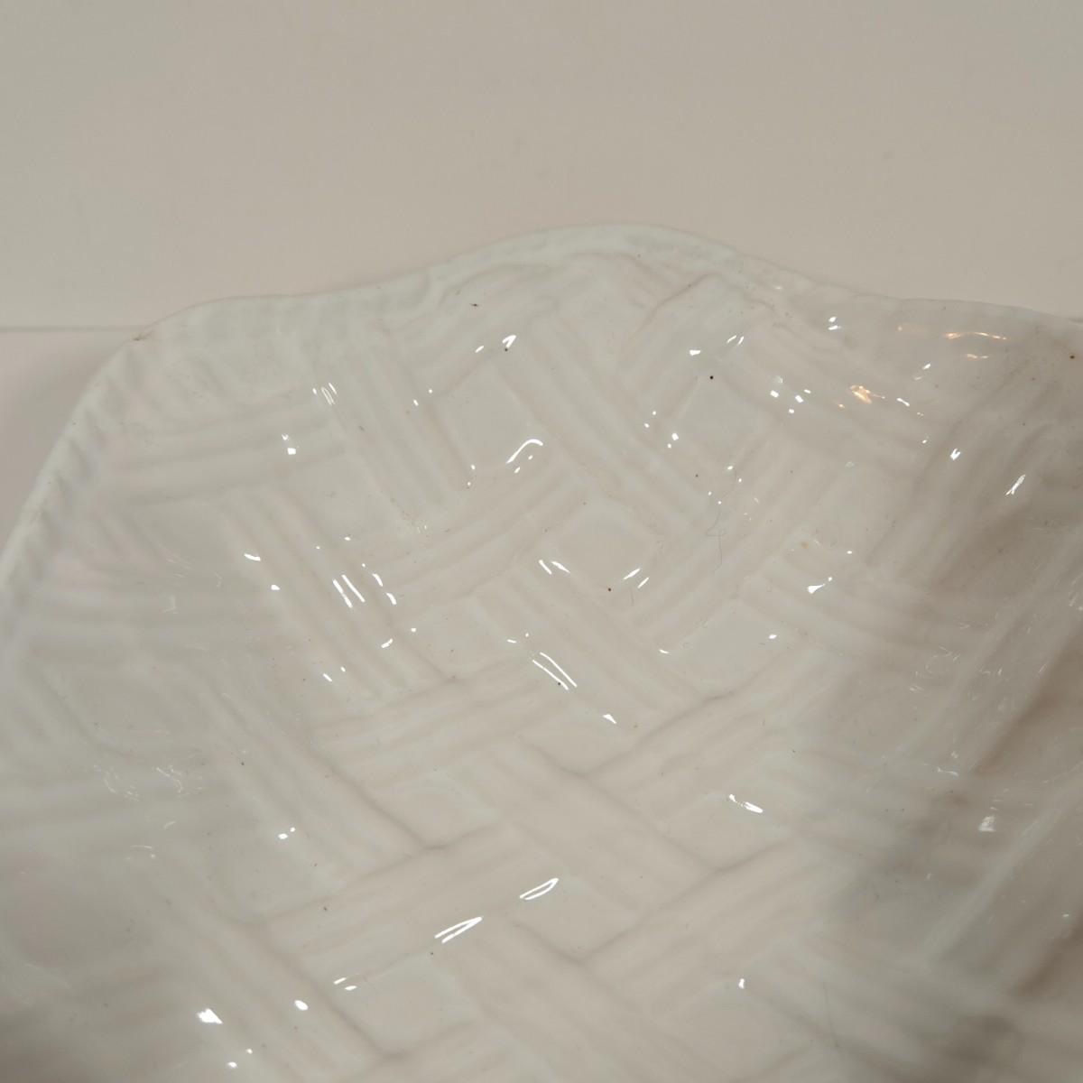 LOT 157: Faux Vegetables in Metal Basket, Ironstone Tureen, and Loucarte Portugal Ceramic Basket Weave Design Serving Platter