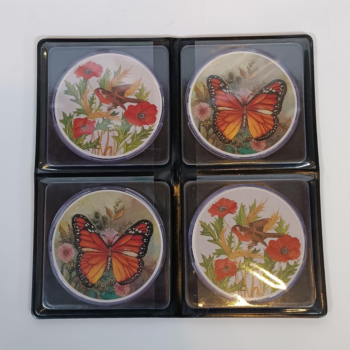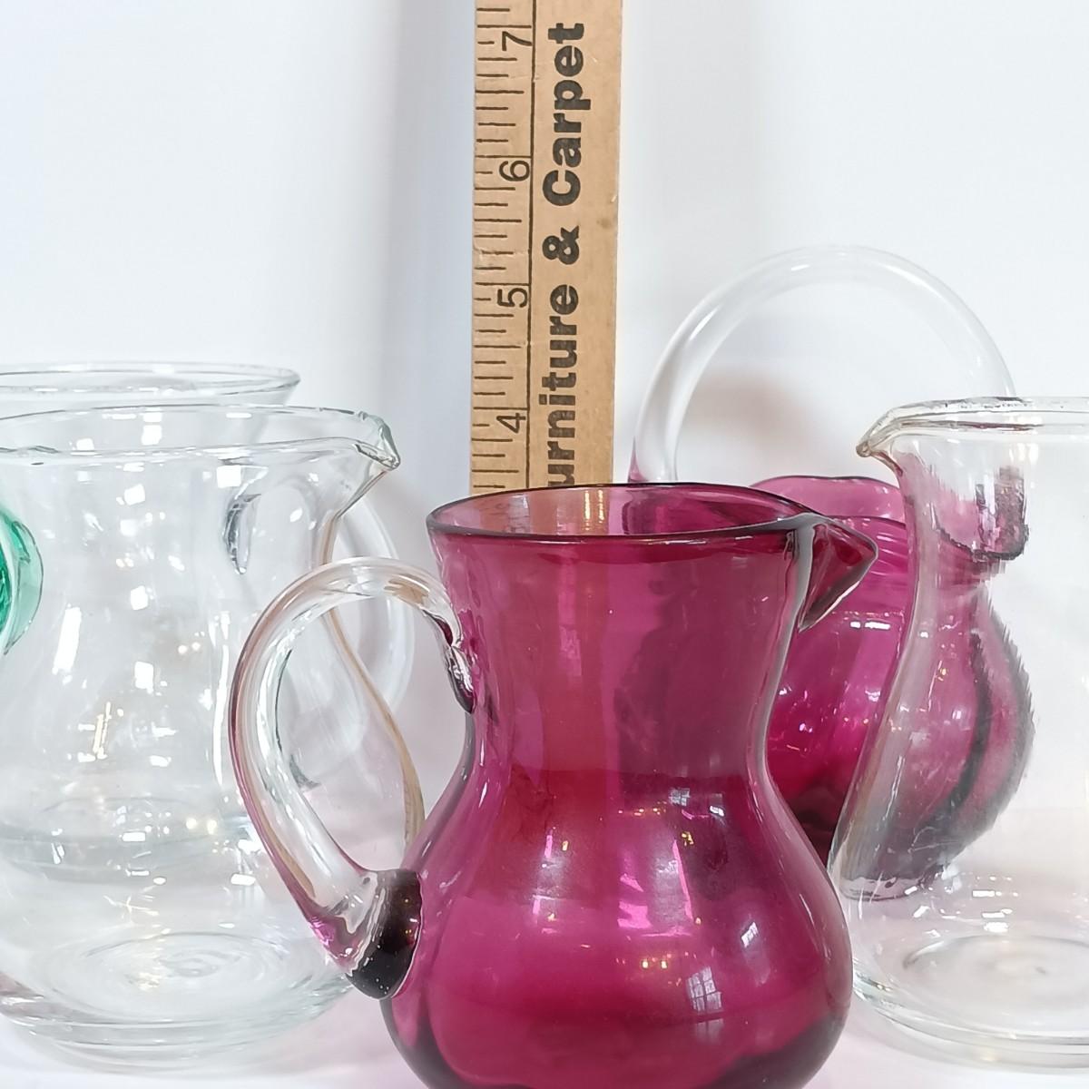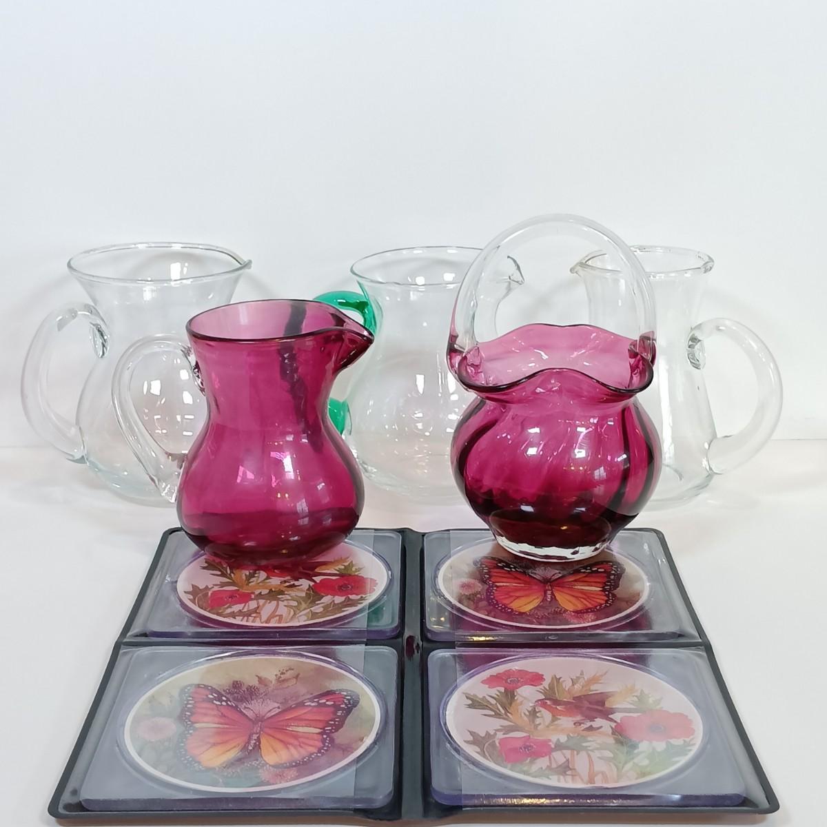 LOT 170: Miniature Cranberry Glass Pitcher and Basket, Green Handled Glass Pitcher, Nature-Inspired Coasters & More