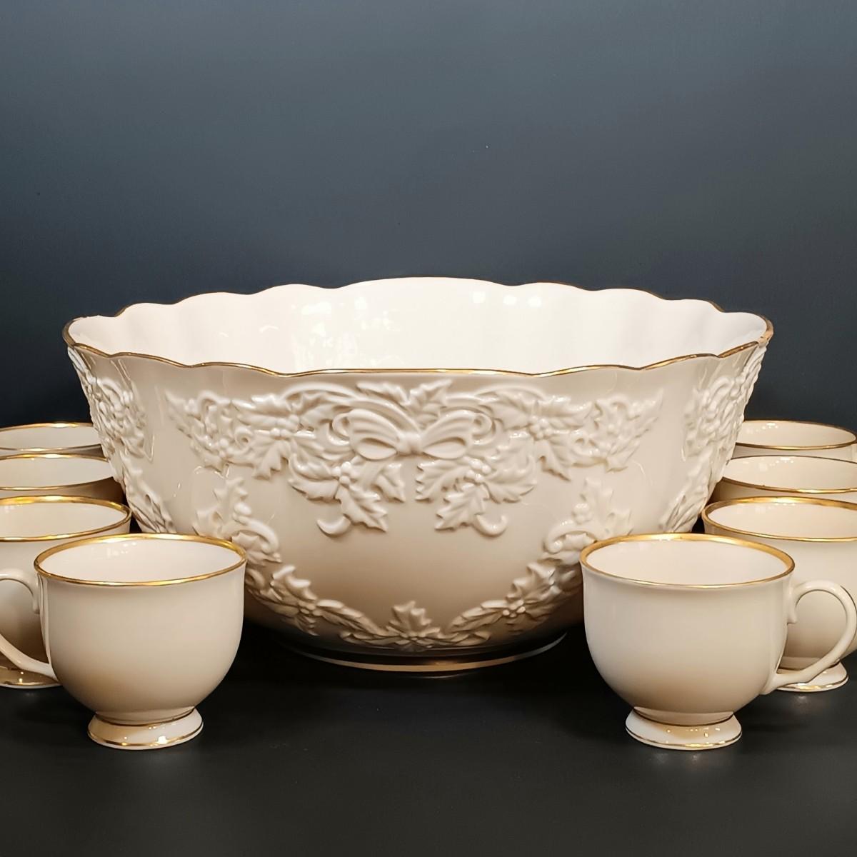 LOT 185: Lenox Holiday Hostess Punch Bowl with Lenox Mansfield Footed Cups