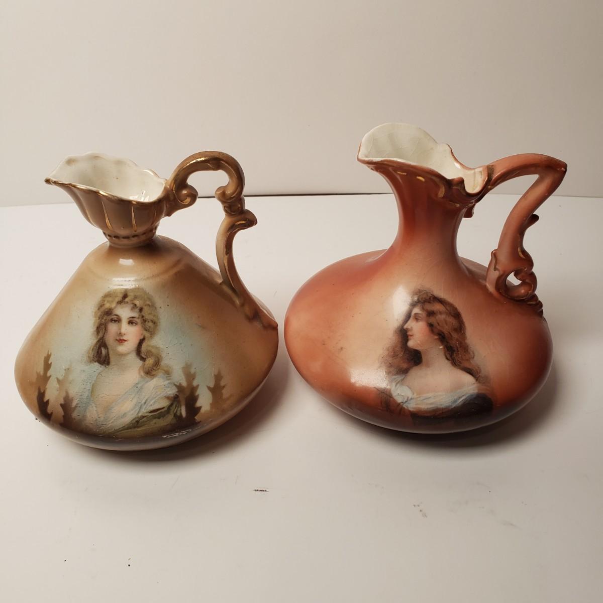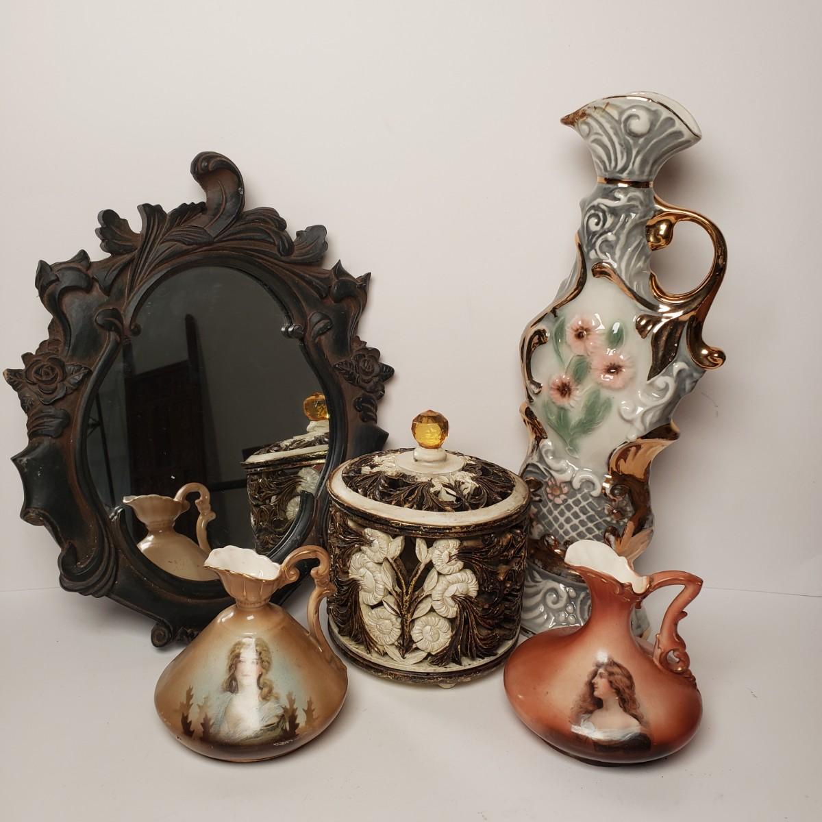 LOT 209: Hand Carved Wooden Mirror, Pair of Victorian Lady Ewers & More